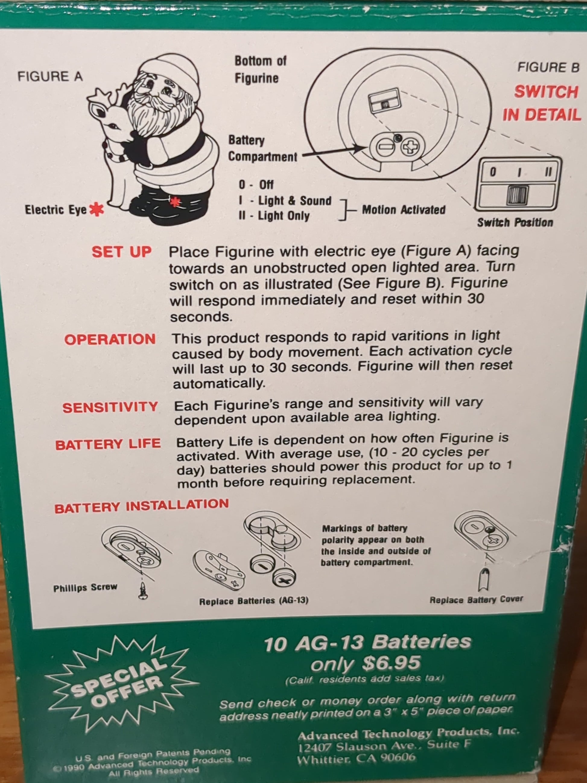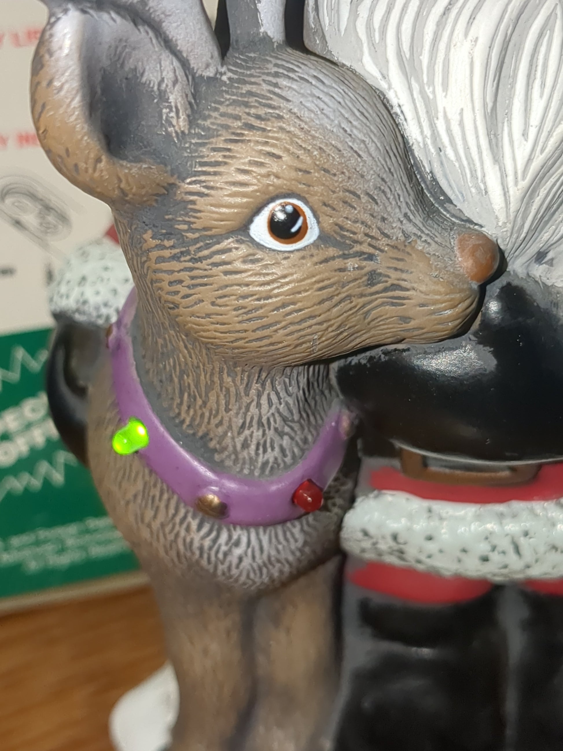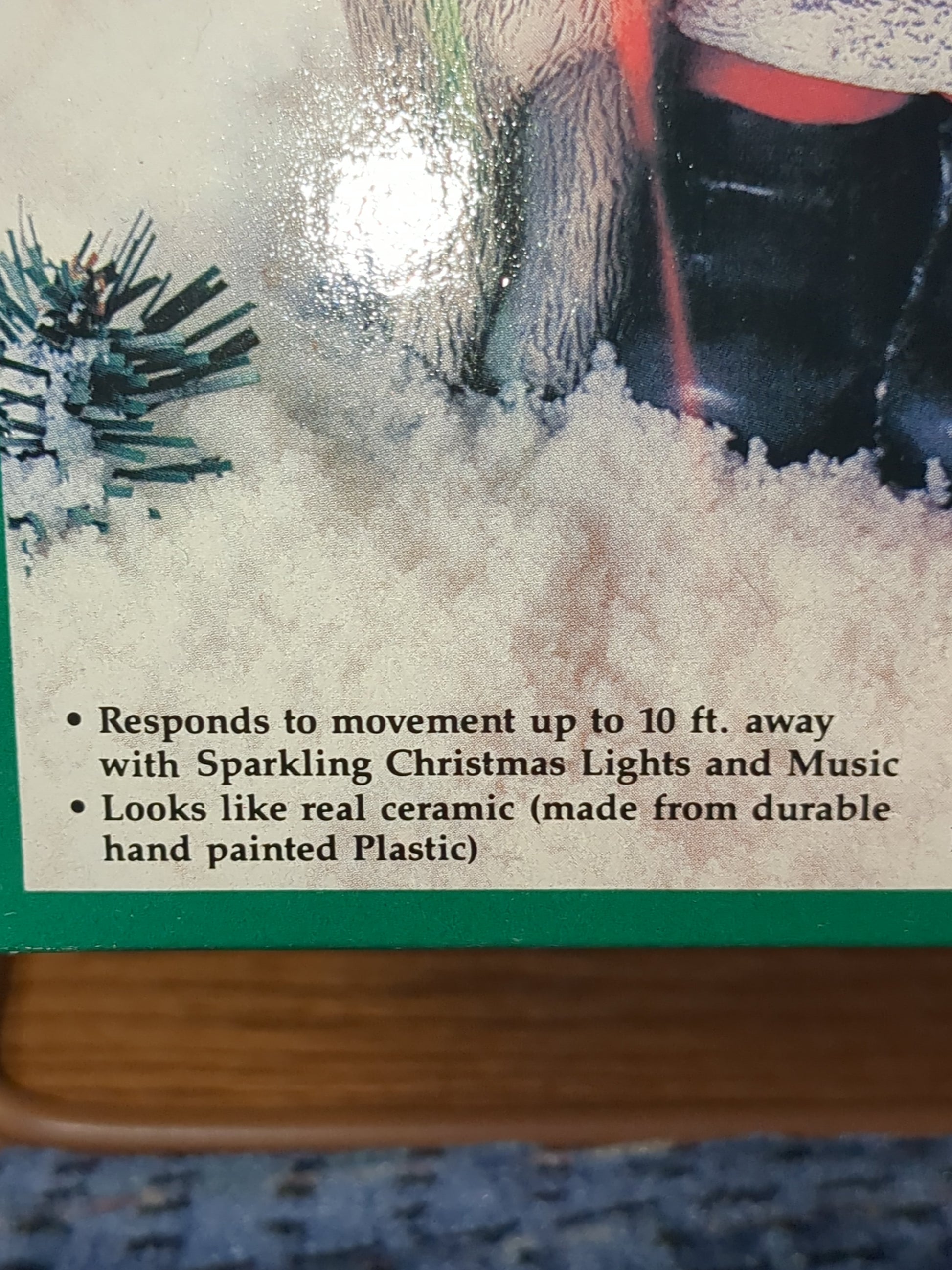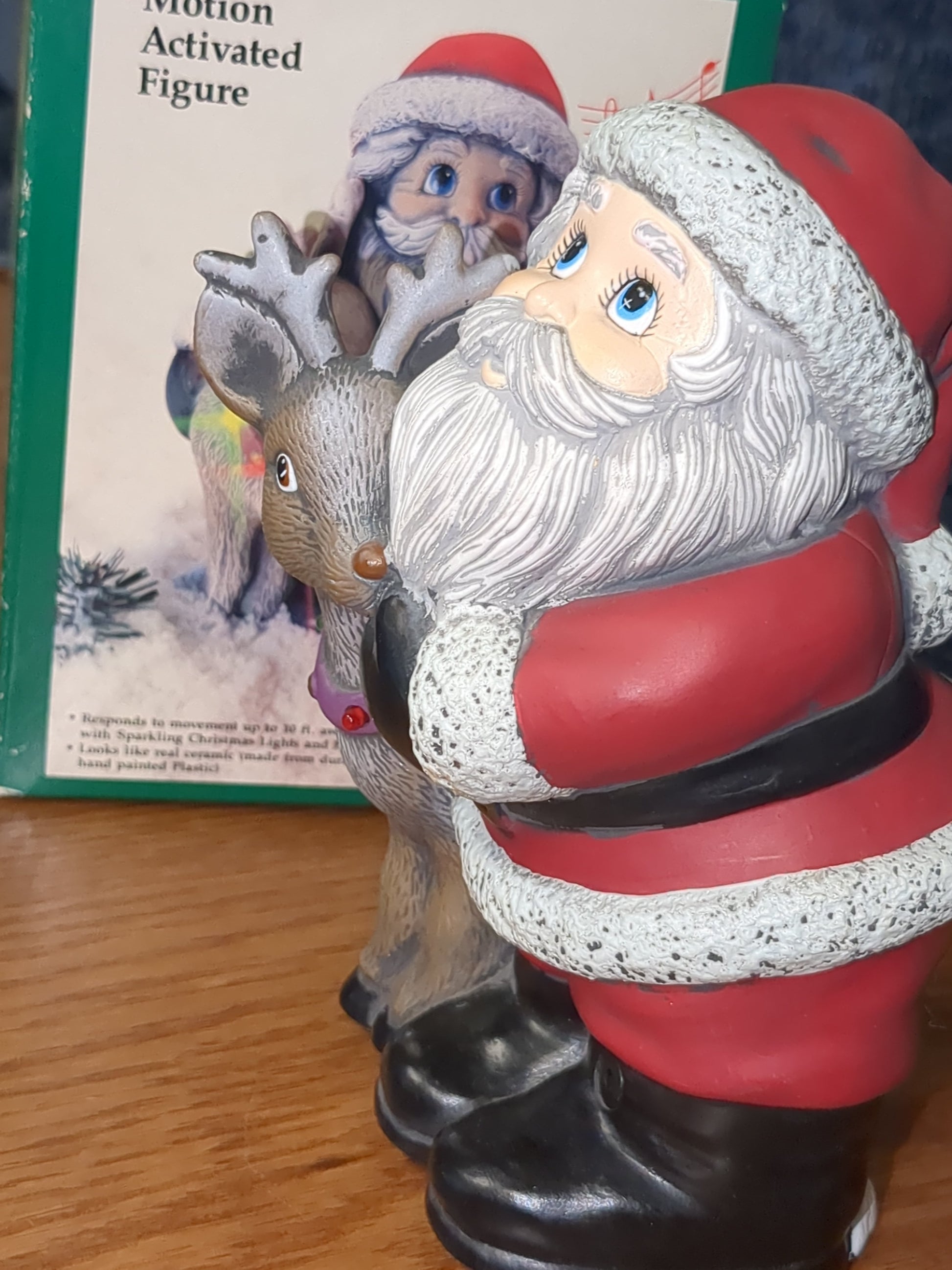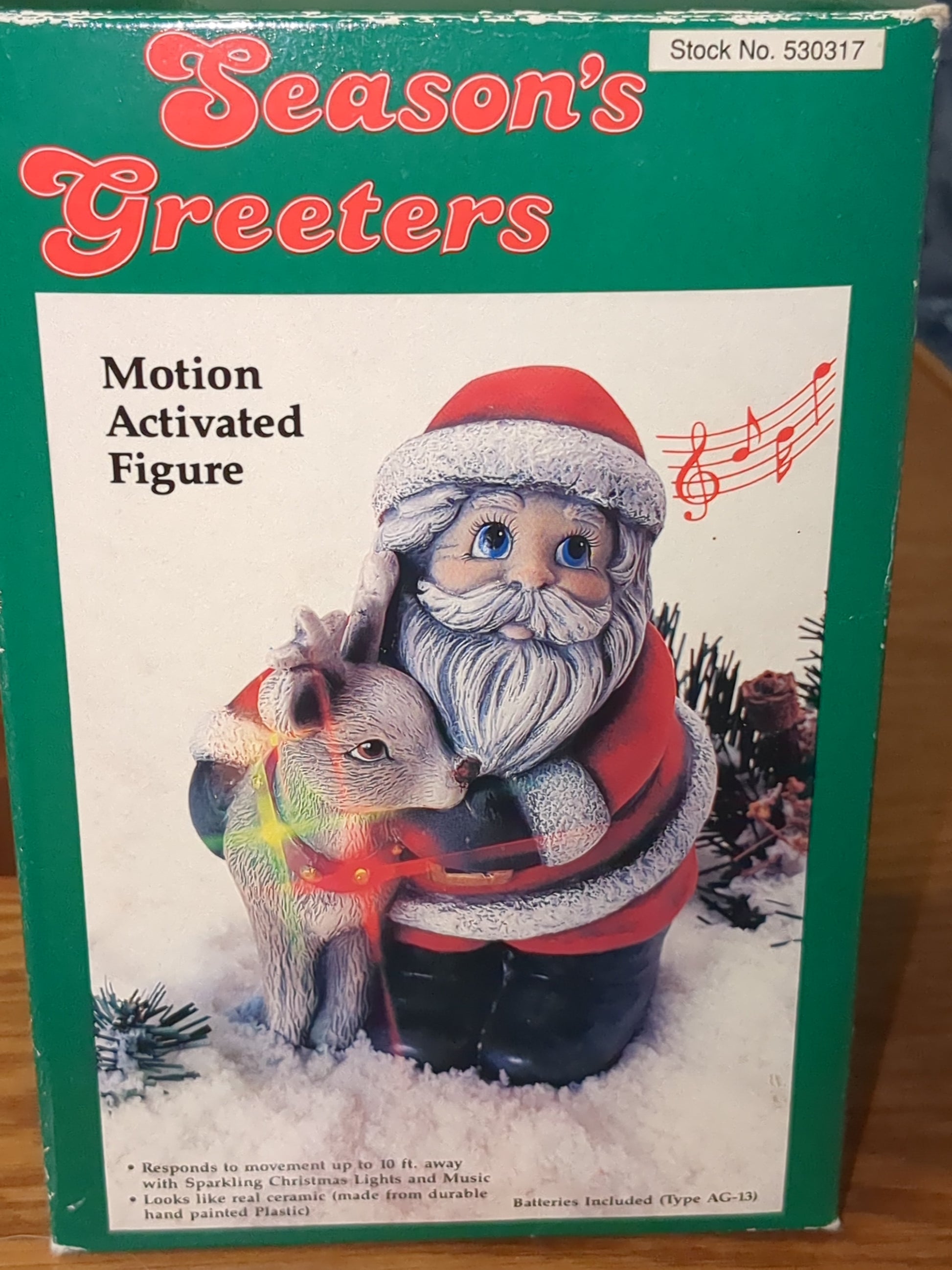 Motion Activated Season's Greeters Santa/Reindeer Figurine. It works great see the video! It looks ceramic but is plastic! No cracks, chips or damage. It has the original box which has seen shelf wear