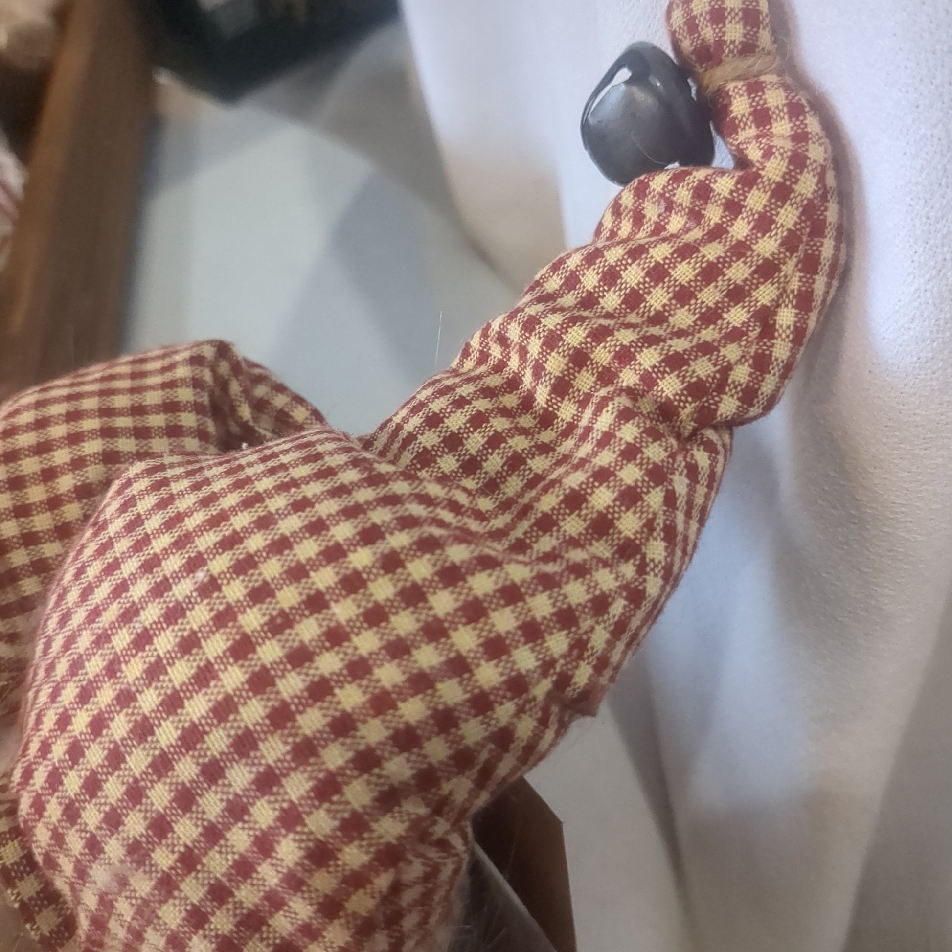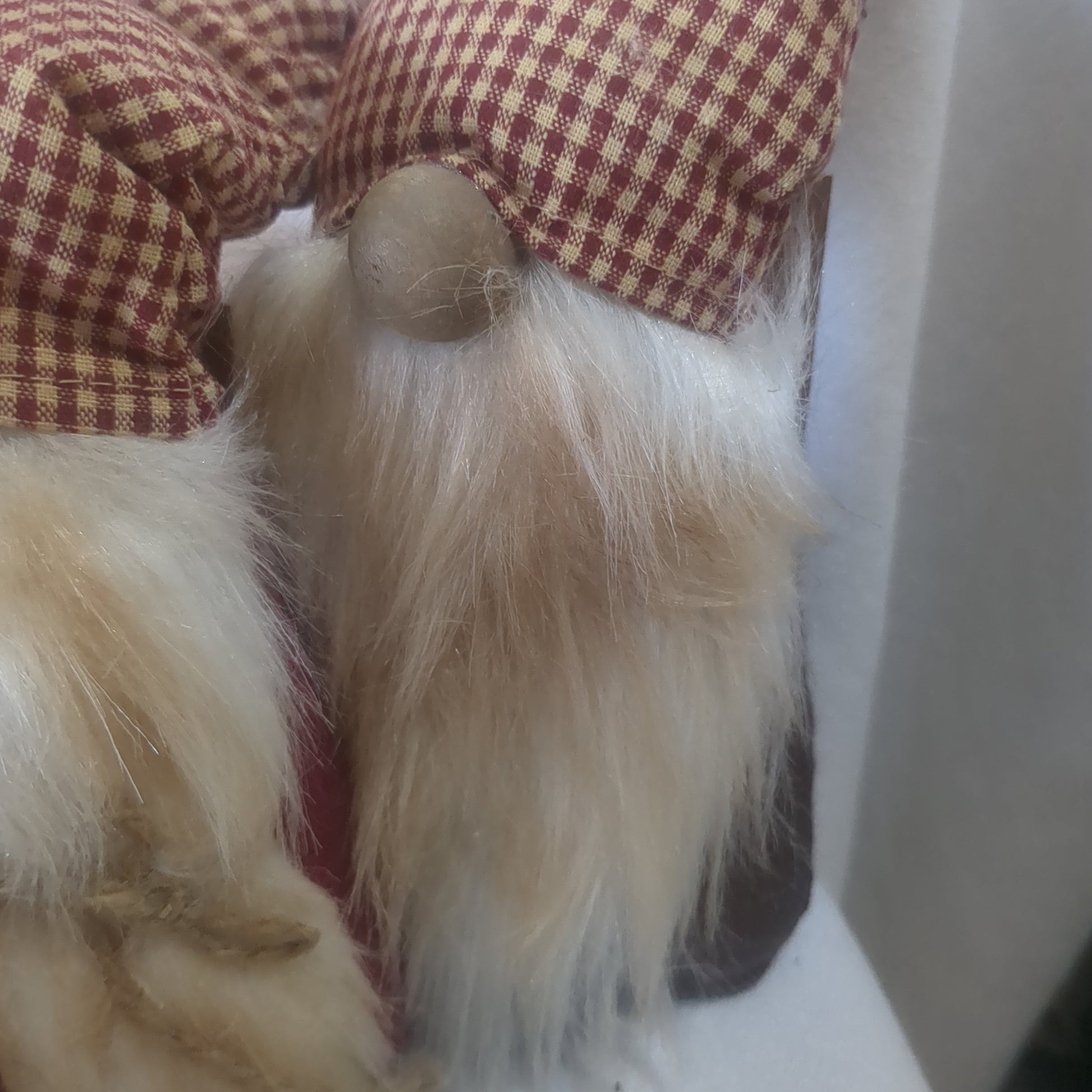 The Mr. and Mrs. Primitive Gnomes are an assortment of two plush tabletop sitters featuring red and cream checkered hats adorned with rusted jingle bells. Mr. Gnome has a fuzzy cream beard and wears brown fabric clothing. Mrs. Gnome has fuzzy cream pigtails with jute bows and wears red fabric clothing. These gnomes make a great pair and can be displayed on any shelf, tabletop, or other flat surface. Each gnome measures 11” high by 4” wide by 2” deep.