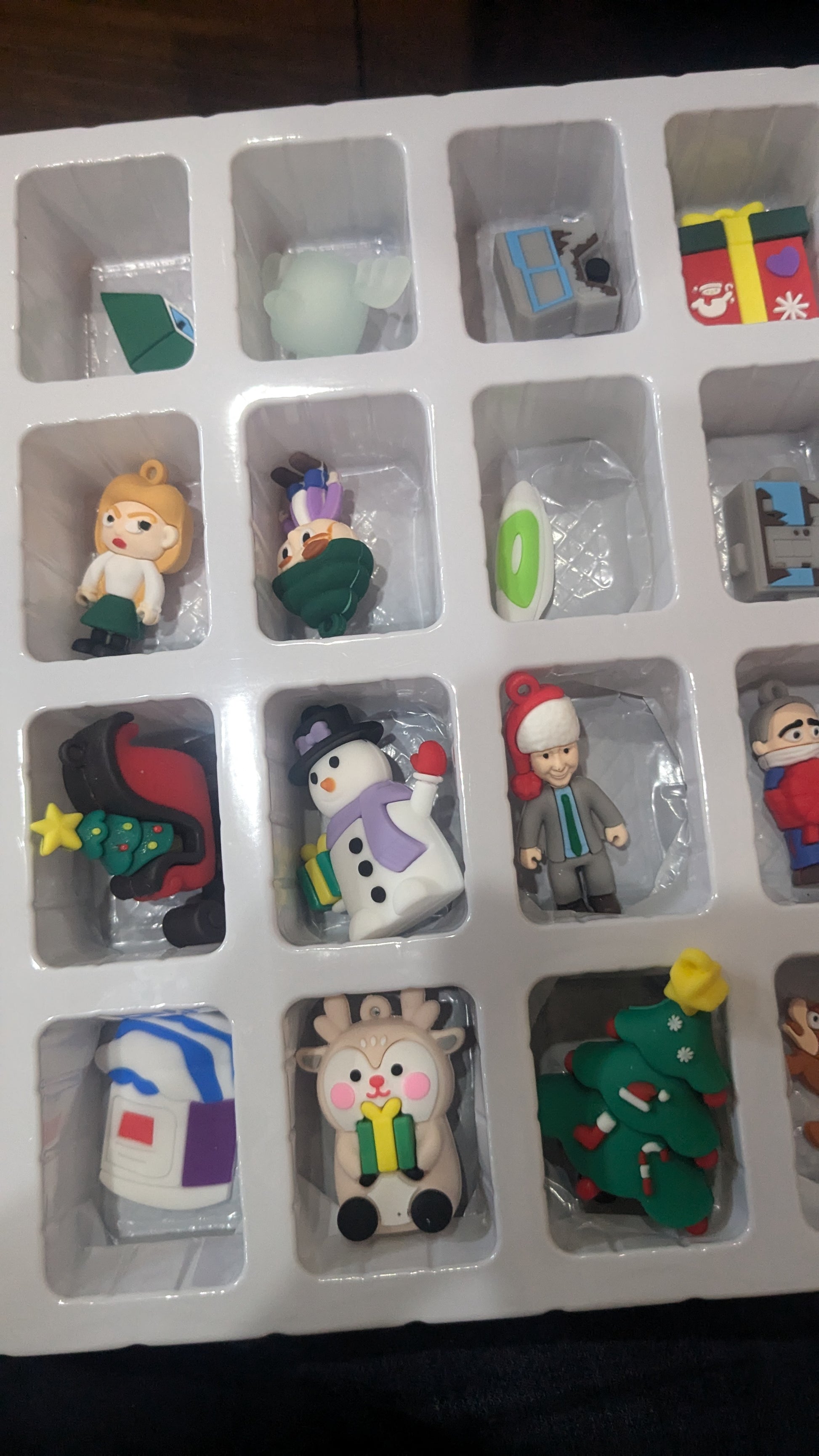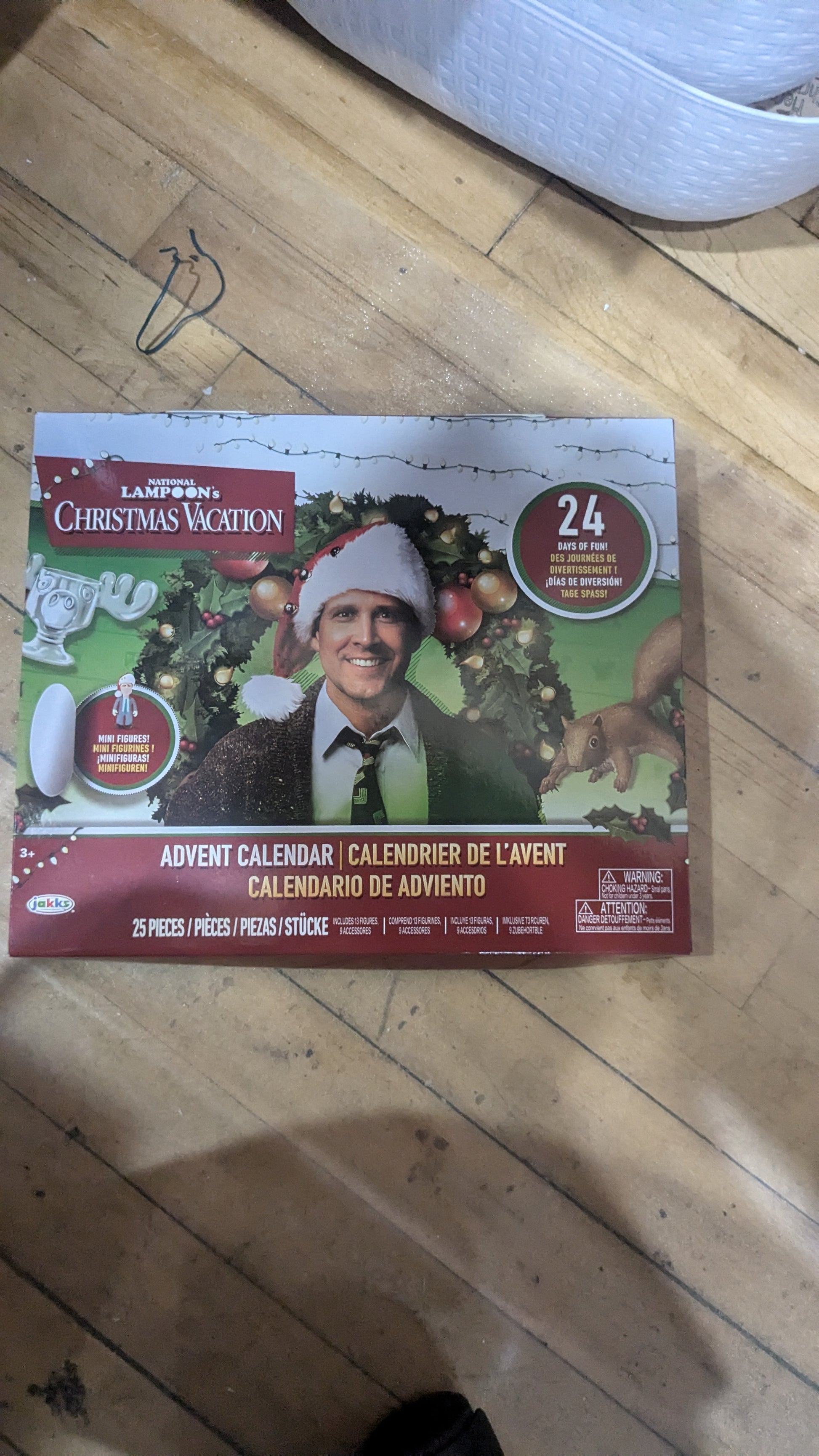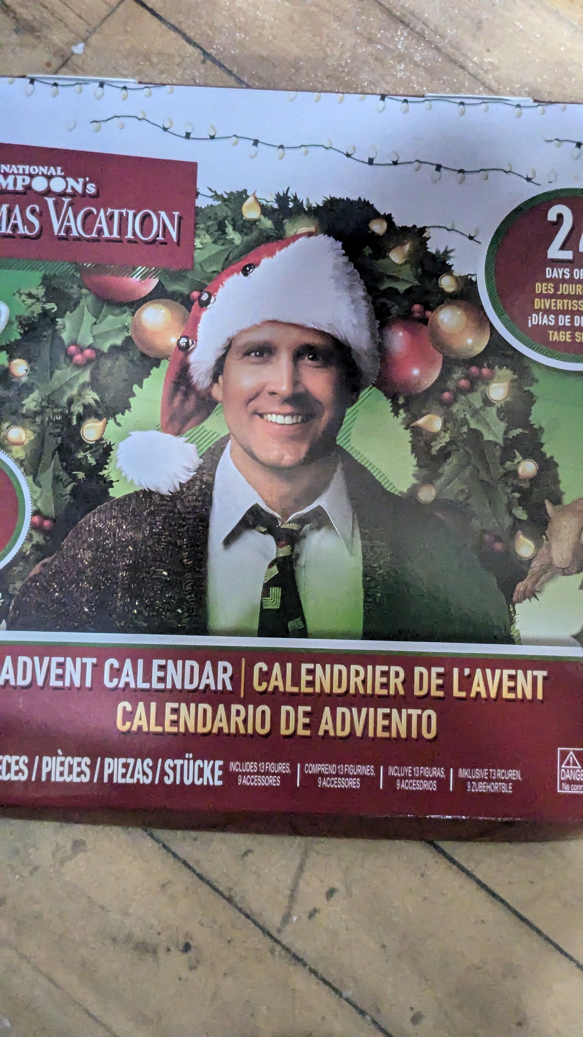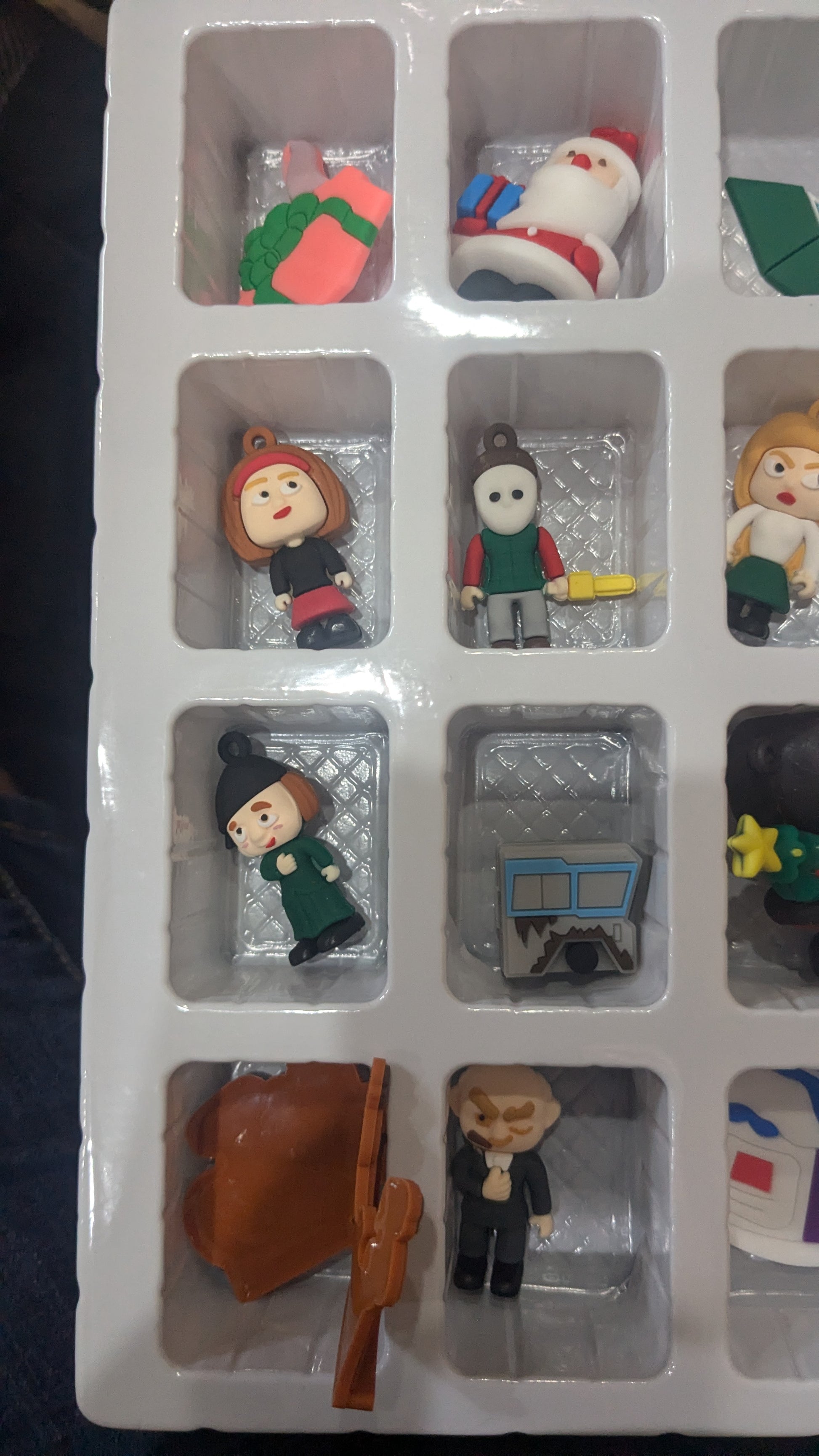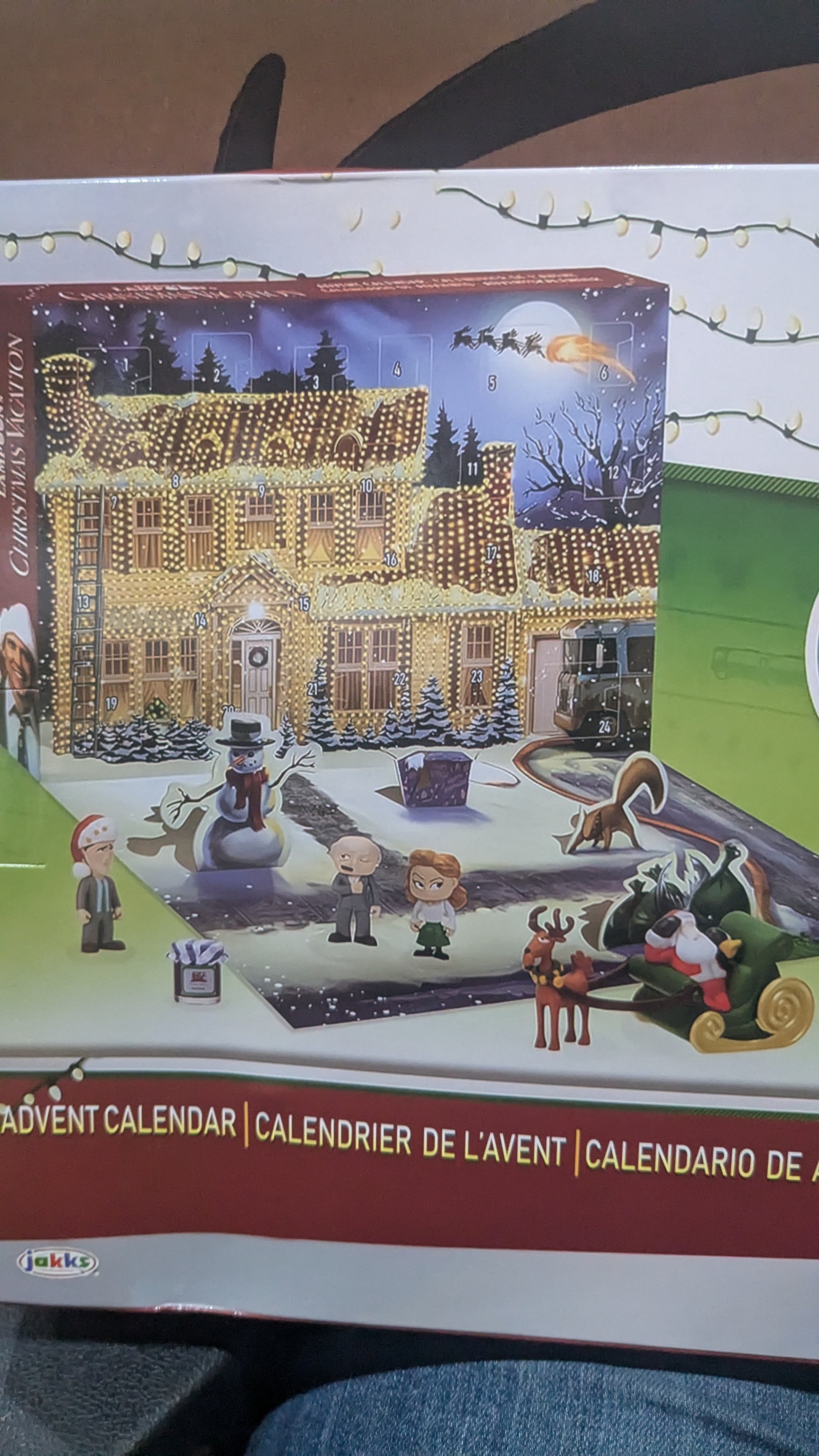 National Lampoons Christmas Vacation Advent Calendar. 24 windows and door to open with a trinket, ornament or part of playset inside, some are really good quality and some are flat pieces, or Christmas characters. There are figures. Flat pieces that you attach to the front drop down panel scene, some of the scene of front yard is somewhat blurry, a few of these blurry scenes has a flat pieces to go over it. If you love the movie, you will enjoy this