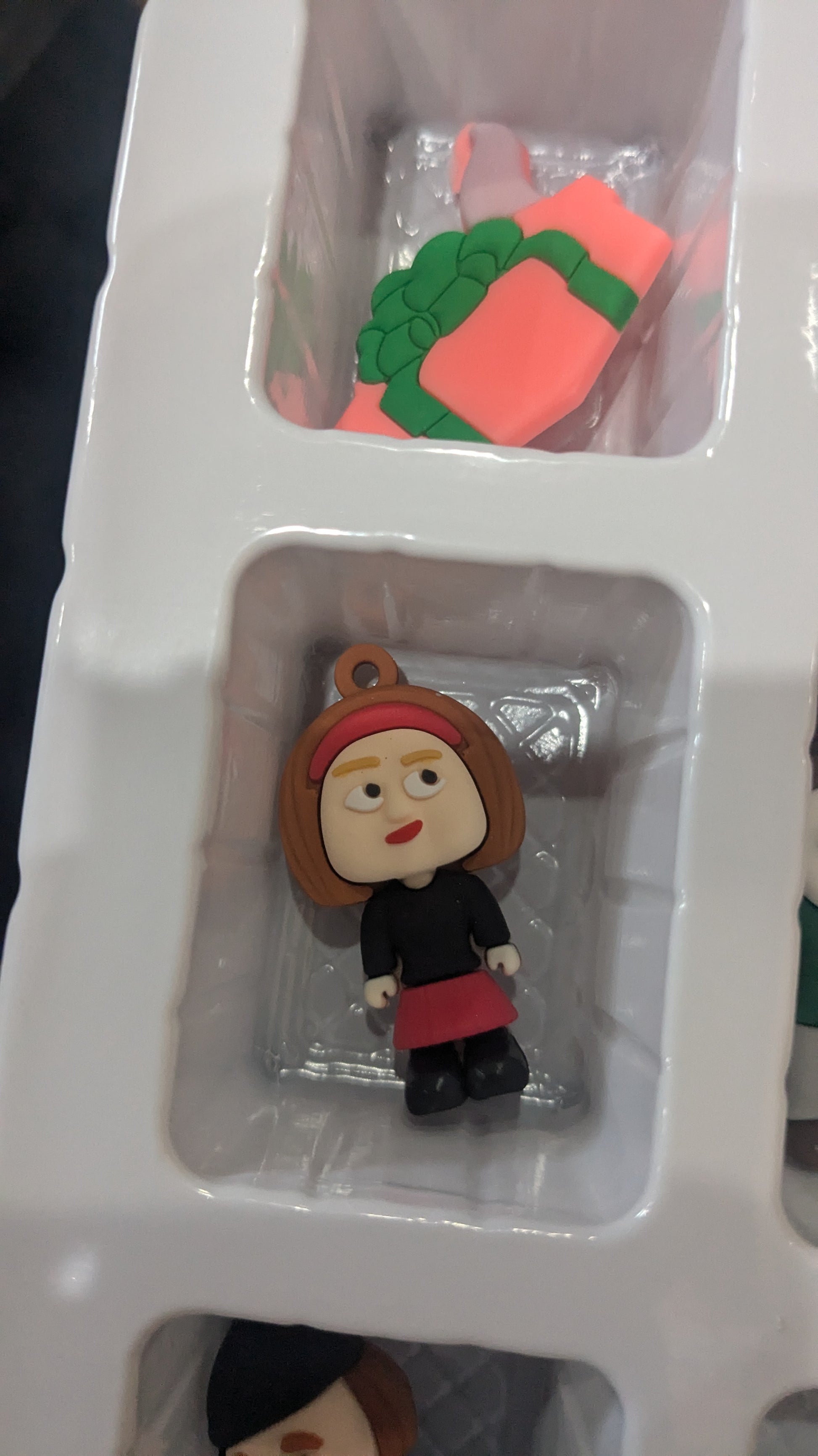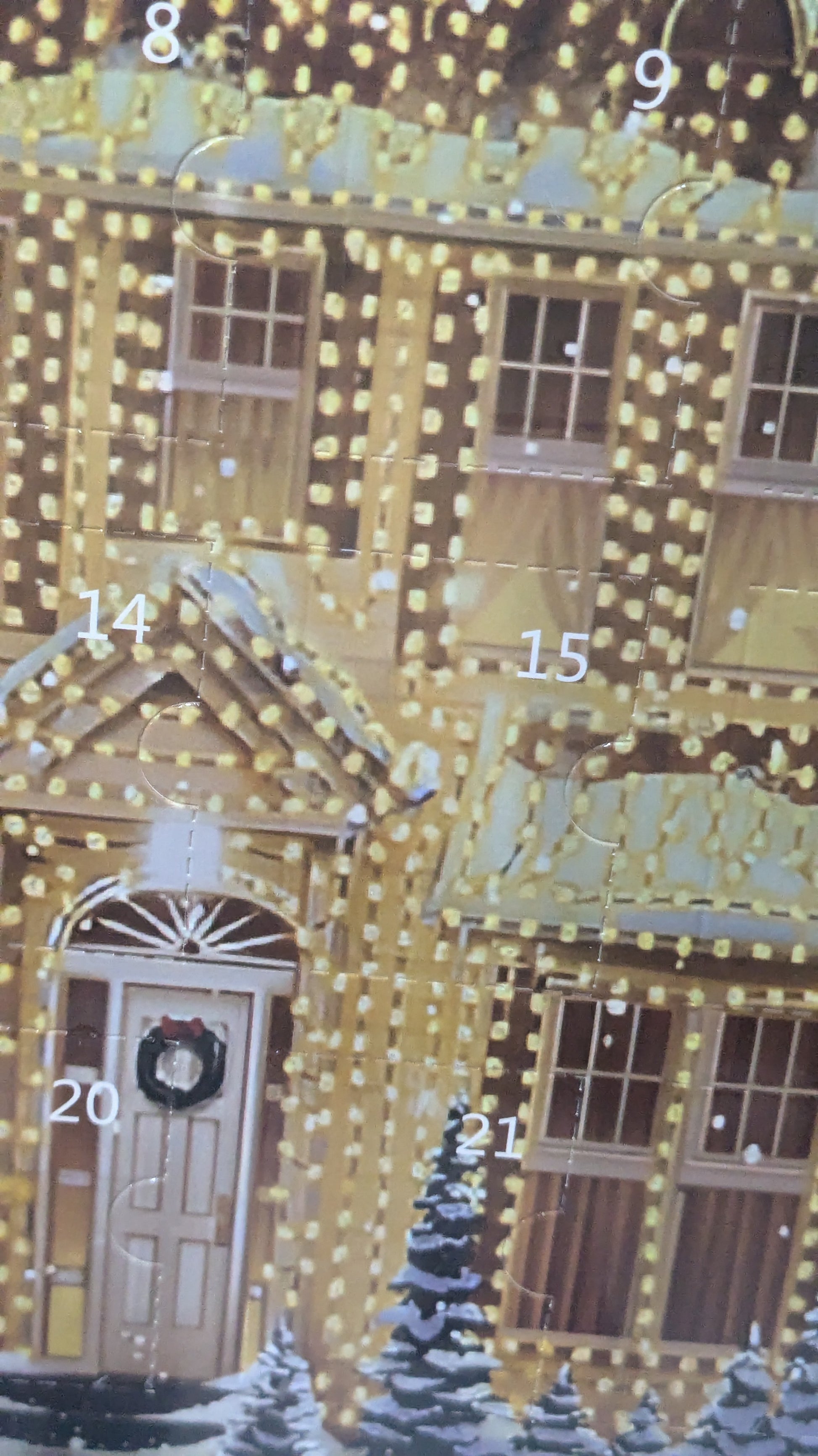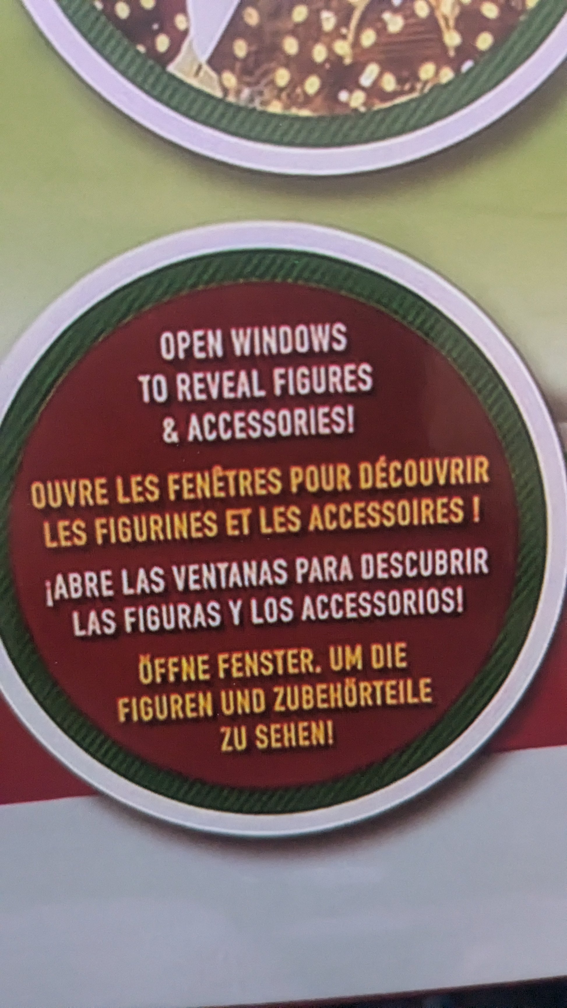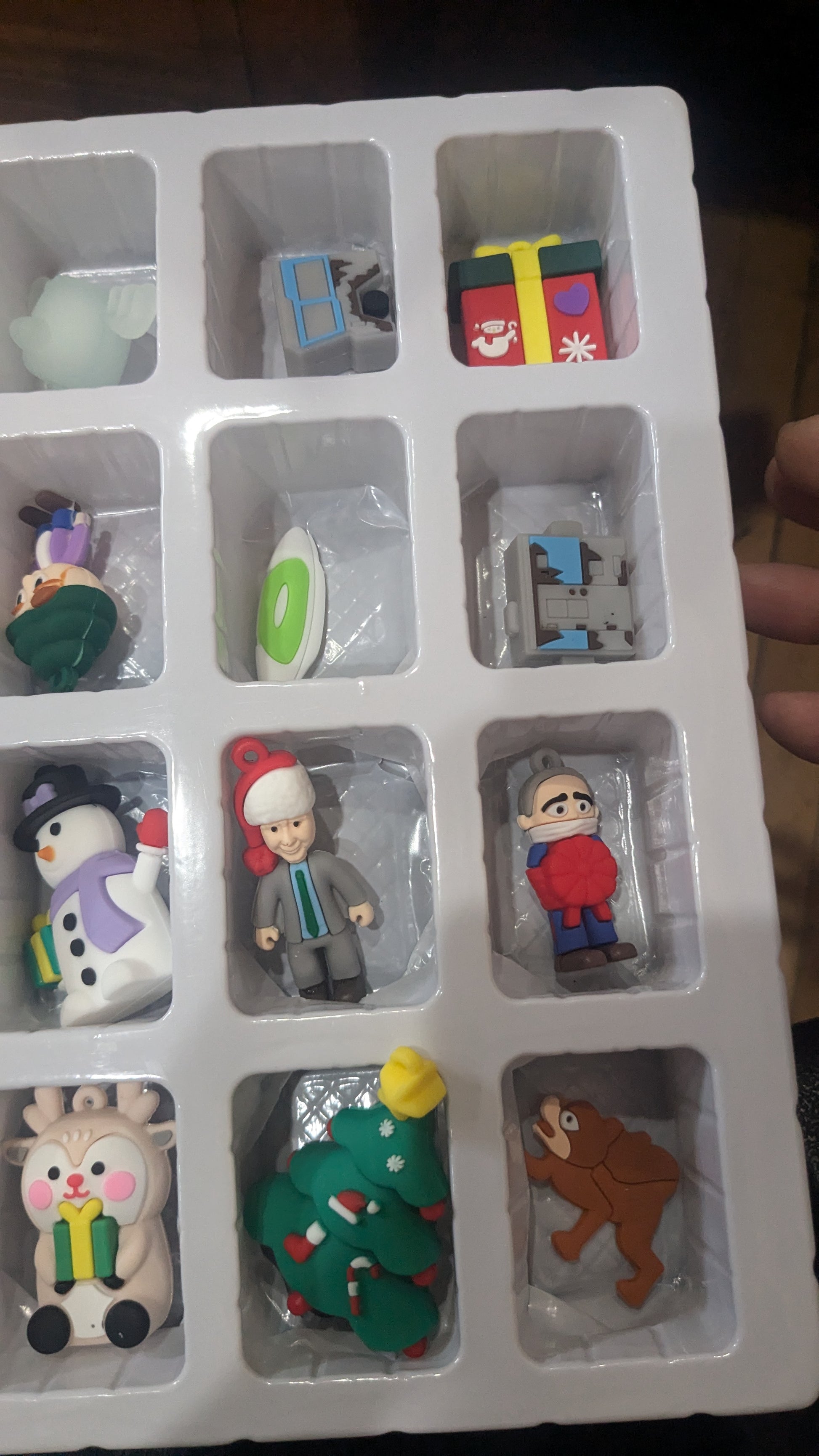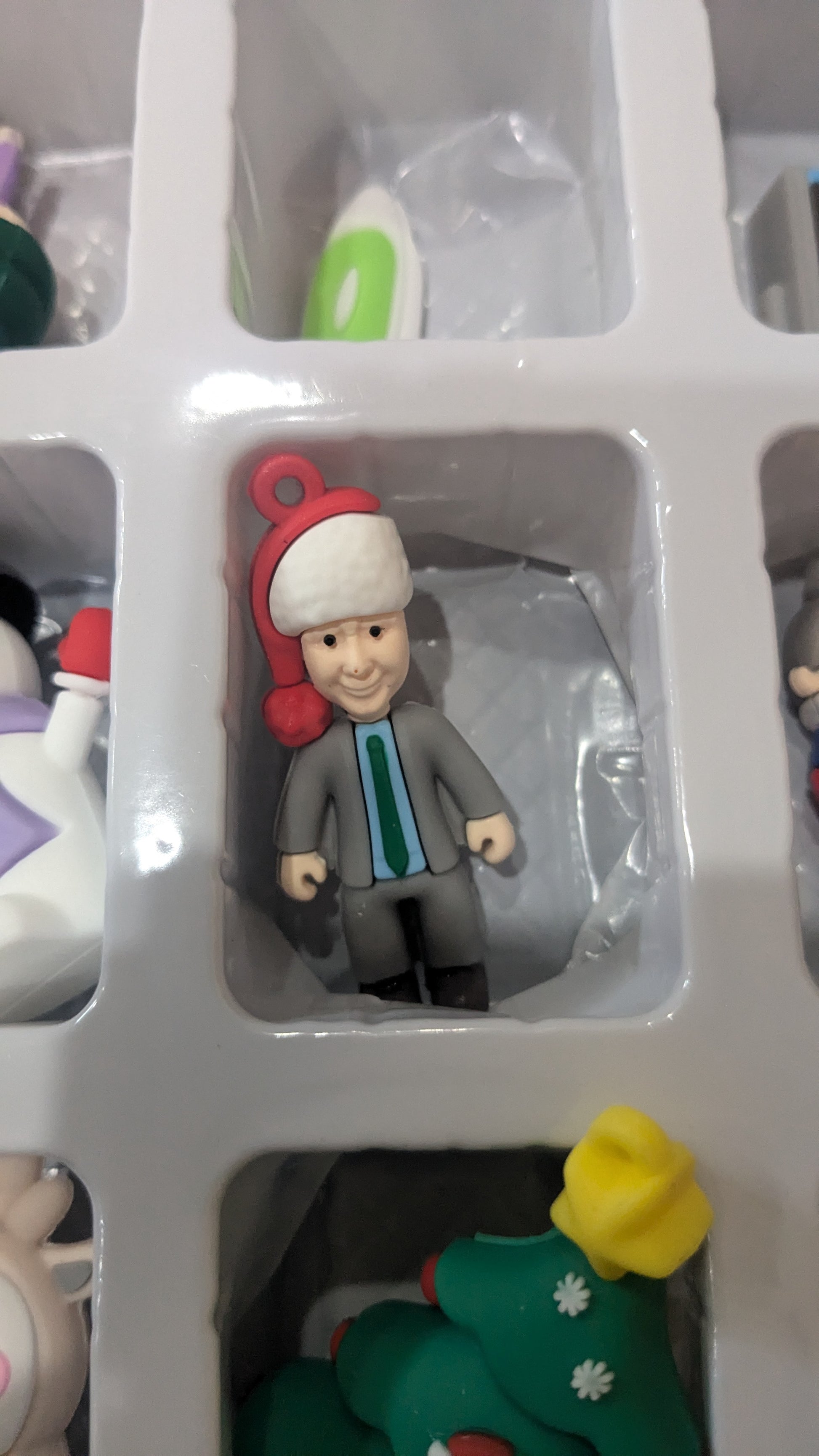 National Lampoons Christmas Vacation Advent Calendar. 24 windows and door to open with a trinket, ornament or part of playset inside, some are really good quality and some are flat pieces, or Christmas characters. There are figures. Flat pieces that you attach to the front drop down panel scene, some of the scene of front yard is somewhat blurry, a few of these blurry scenes has a flat pieces to go over it. If you love the movie, you will enjoy this
