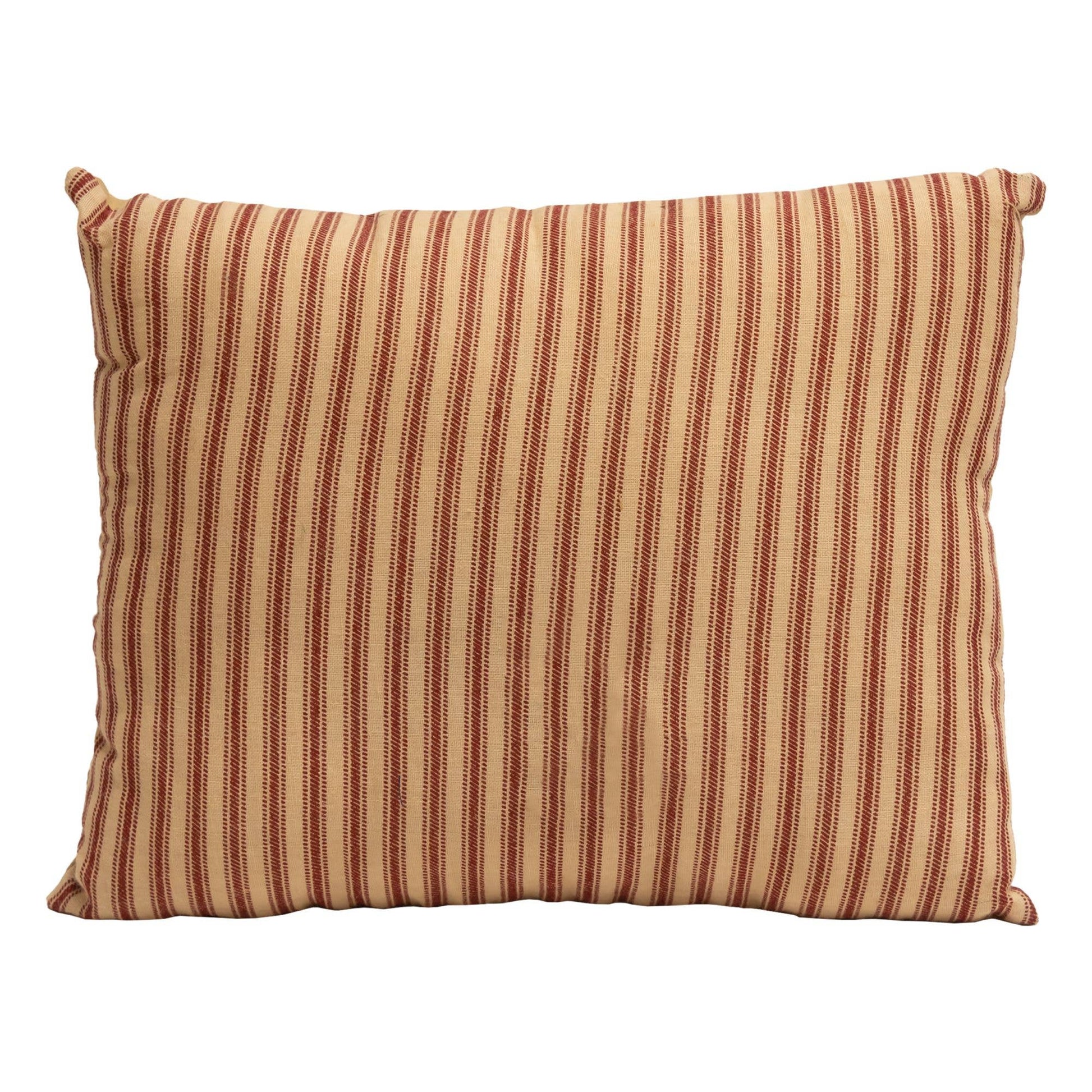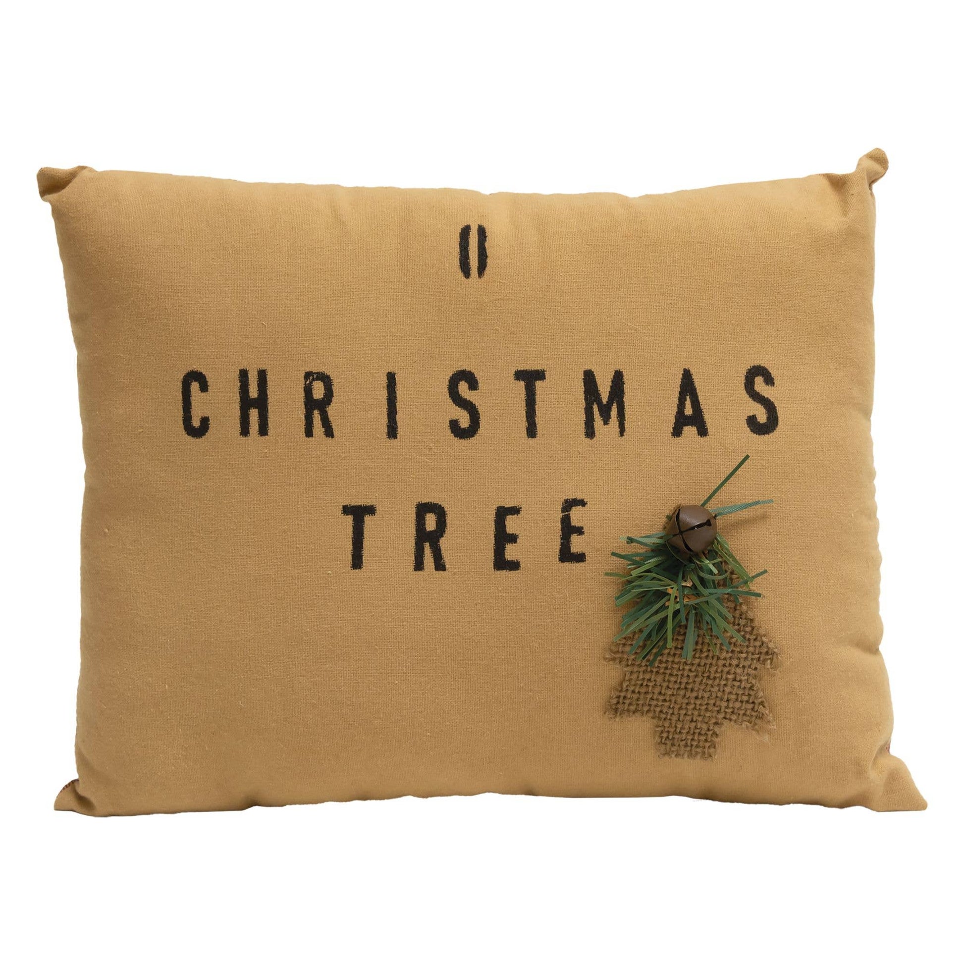 O Christmas Tree Decorative Pillow is a primitive linen fabric pillow, dark tan on one side with festive red stripes on the other. The tan side of the pillow reads “O Christmas Tree” in a rustic stamped black lettering. The pillow is adorned with a burlap Christmas tree cutout with a small pine bough and a bell. The pillow looks beautiful with primitive and rustic Christmas décor, propped on a chair, couch, or shelf. Measures 8” high by 10” wide by 2” deep.