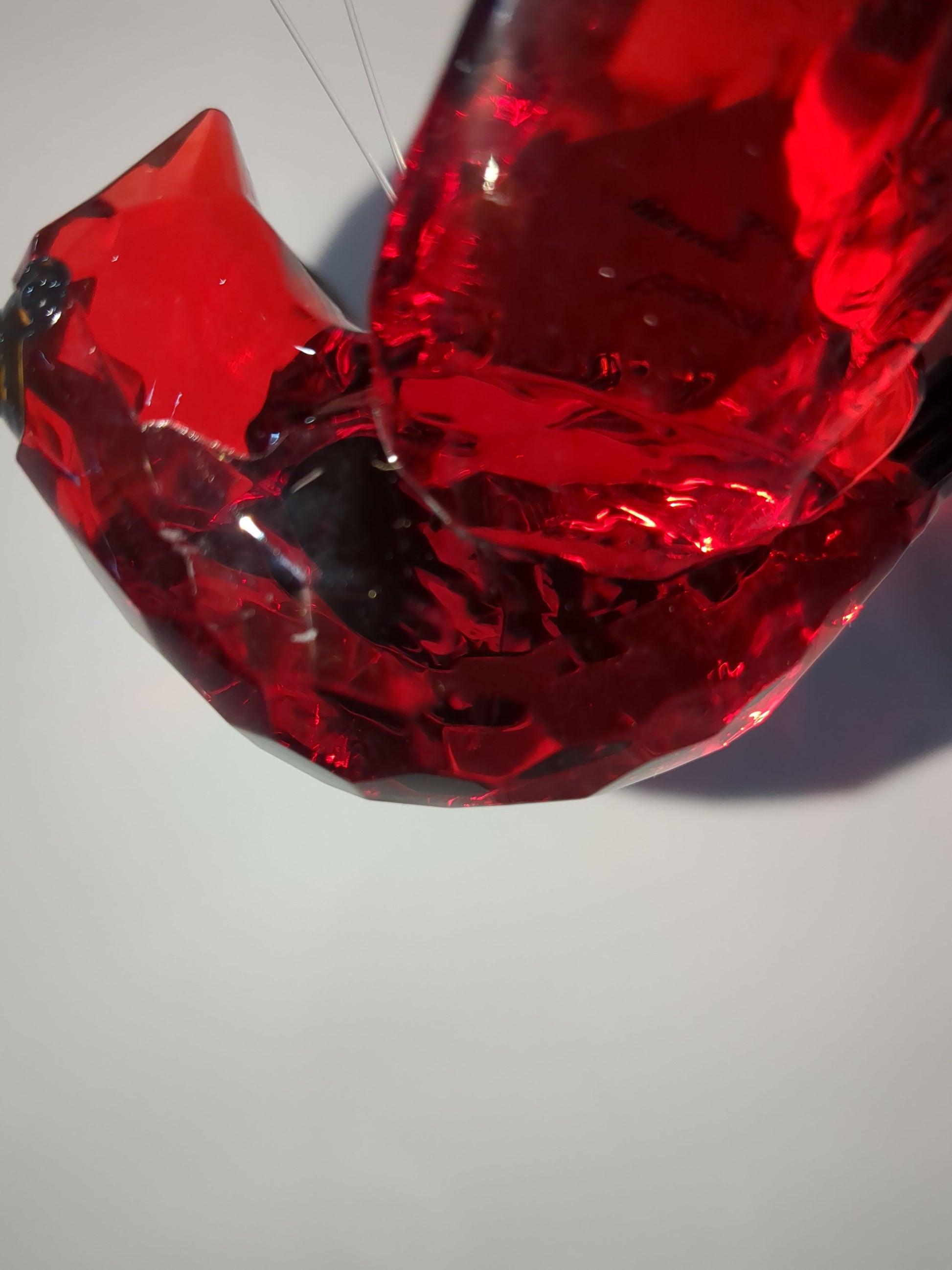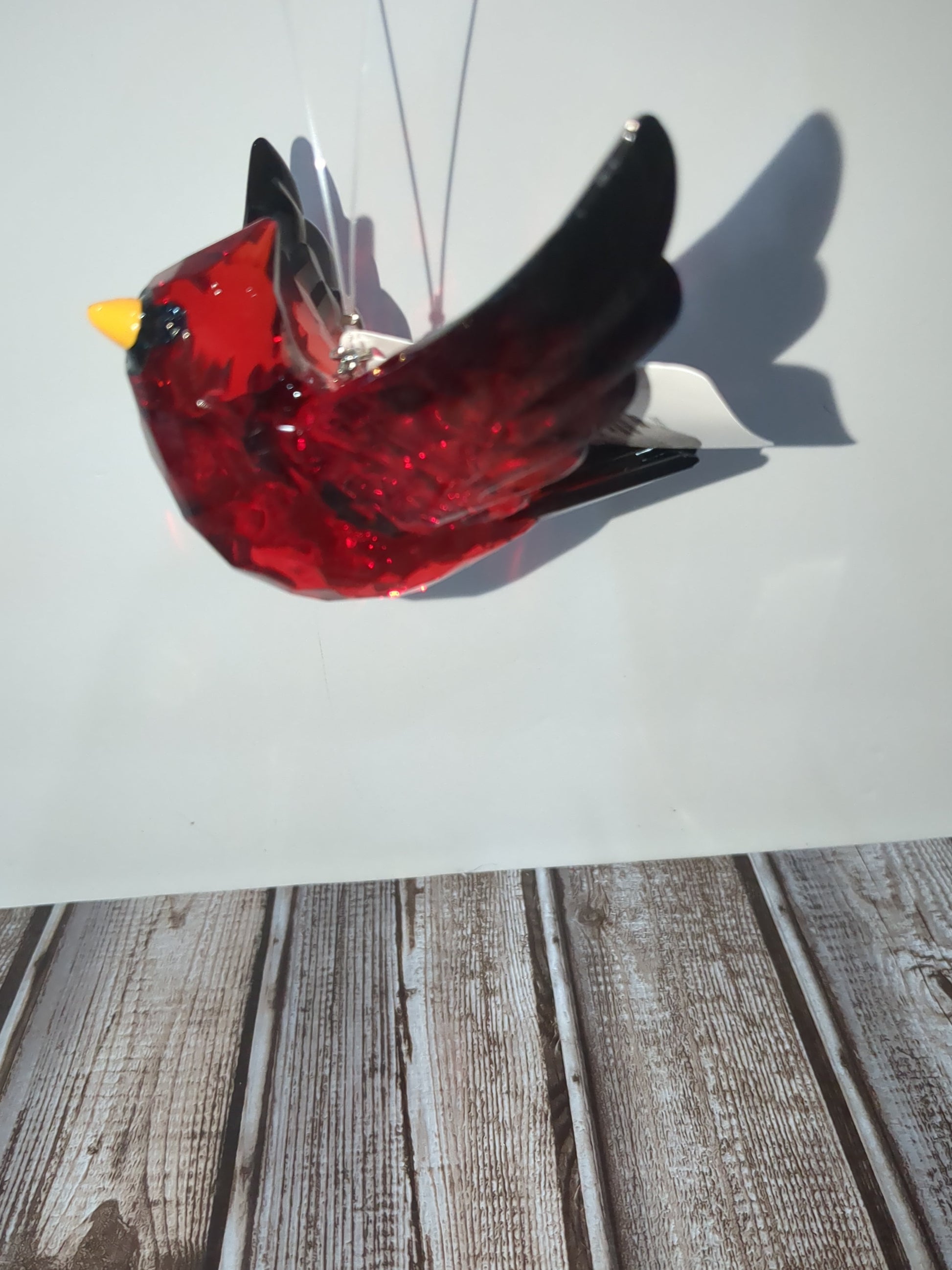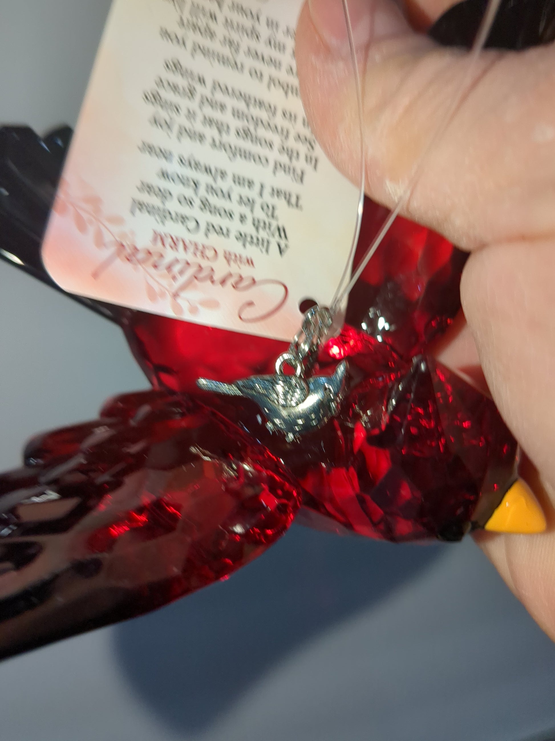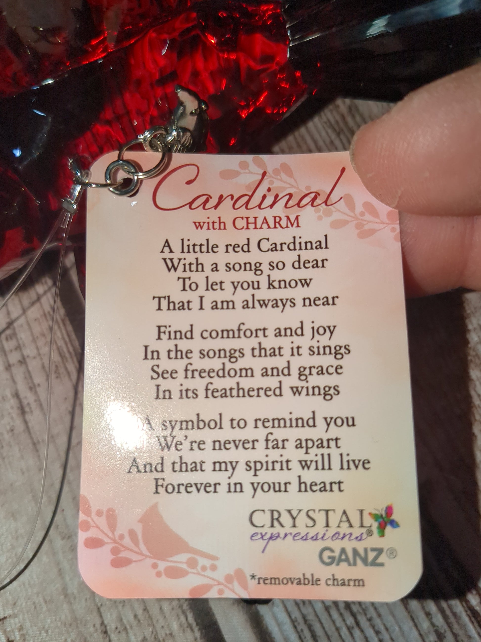 Cardinal with a charm from Crystal expressions just made from a resin is not glass but it looks like Crystal is gorgeous in a window or on a tree wingspan is four and a half inches from tail to beak it's 4 in it has a little Cardinal charm with it and an attached card that reads "a little red cardinal with a song so dear to let you know that I am always near find comfort and joy and the songs that I sing see freedom and Grace in its feathered wings a symbol to remind you we're never far apart and that my spirit will live forever in your heart.