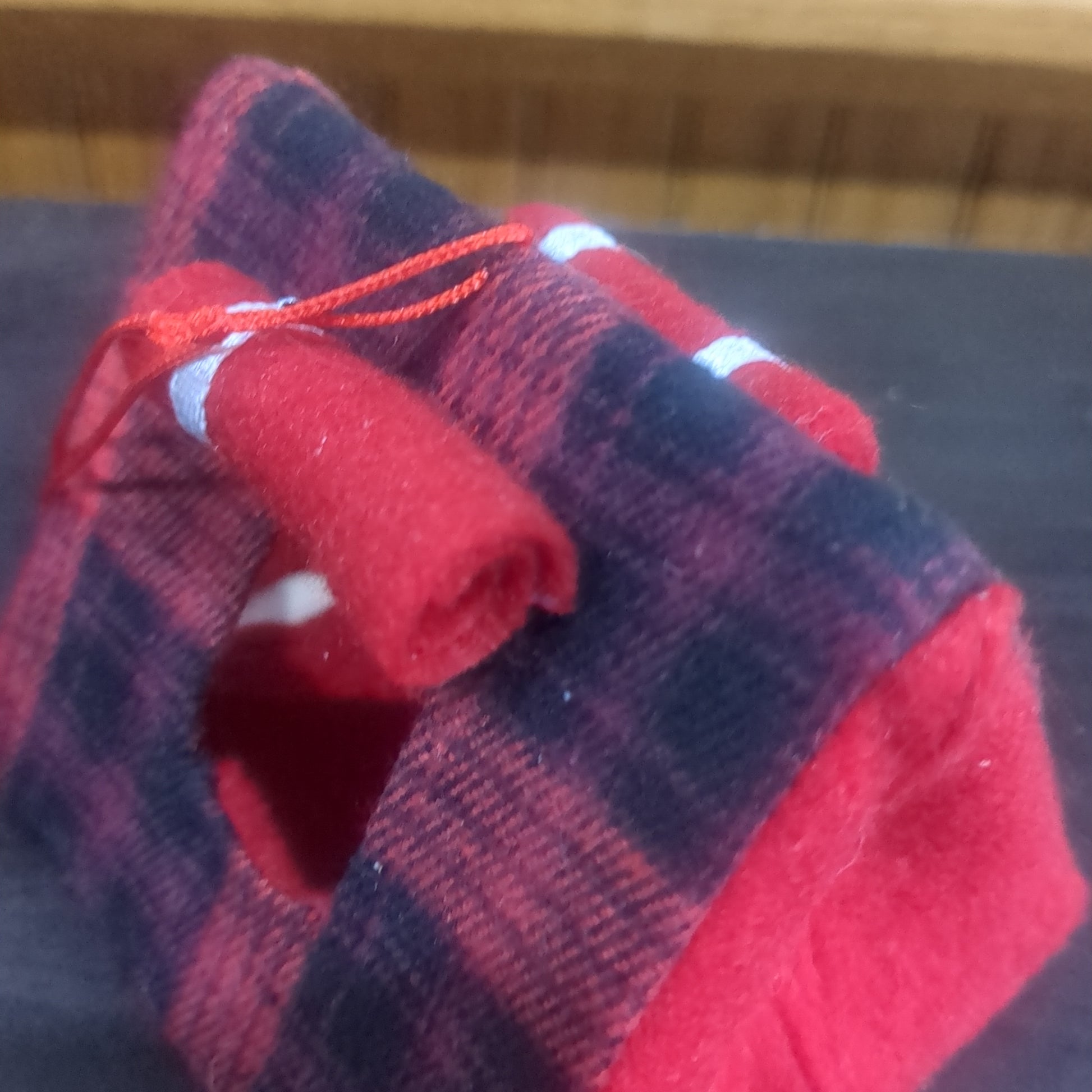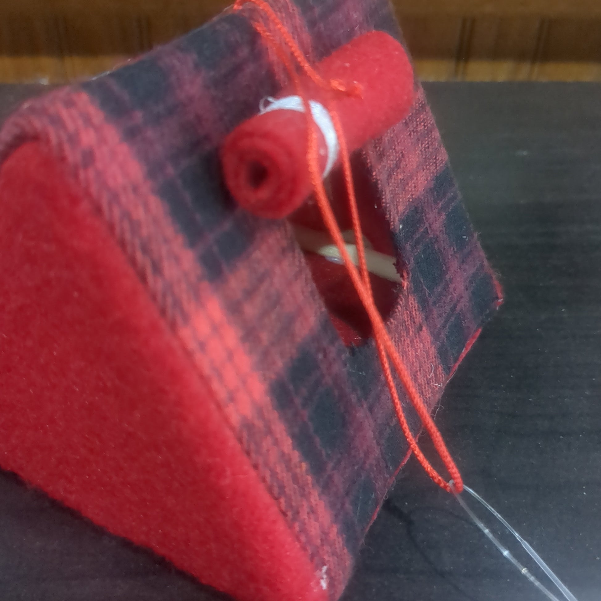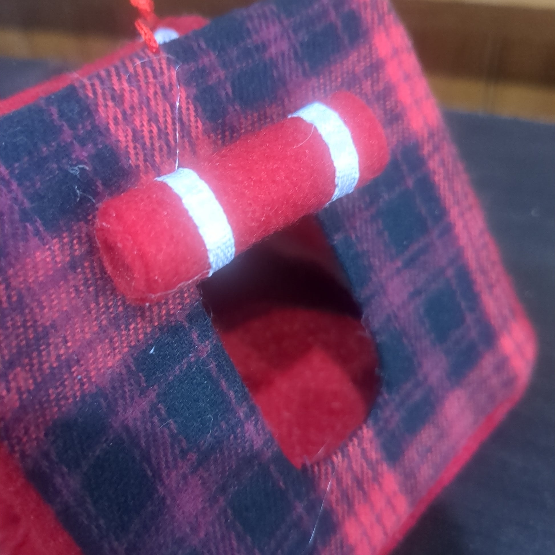 Dark plaid fabric tent ornament with rolled window flap , 5.5 in. Please note the color can vary a little from the picture and each other but will be close.