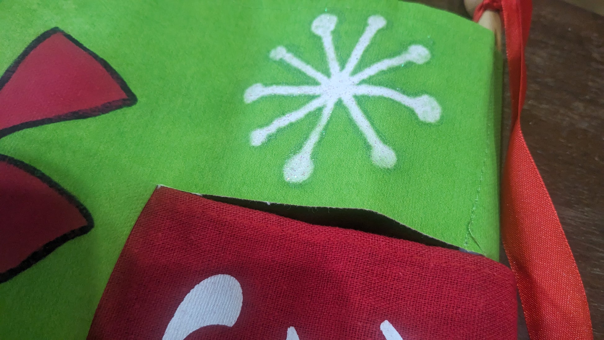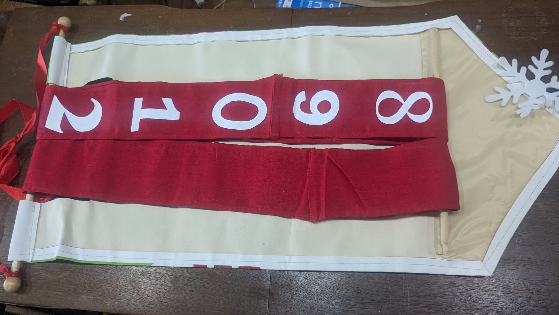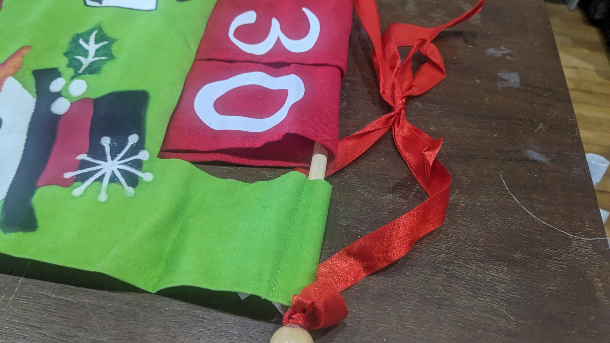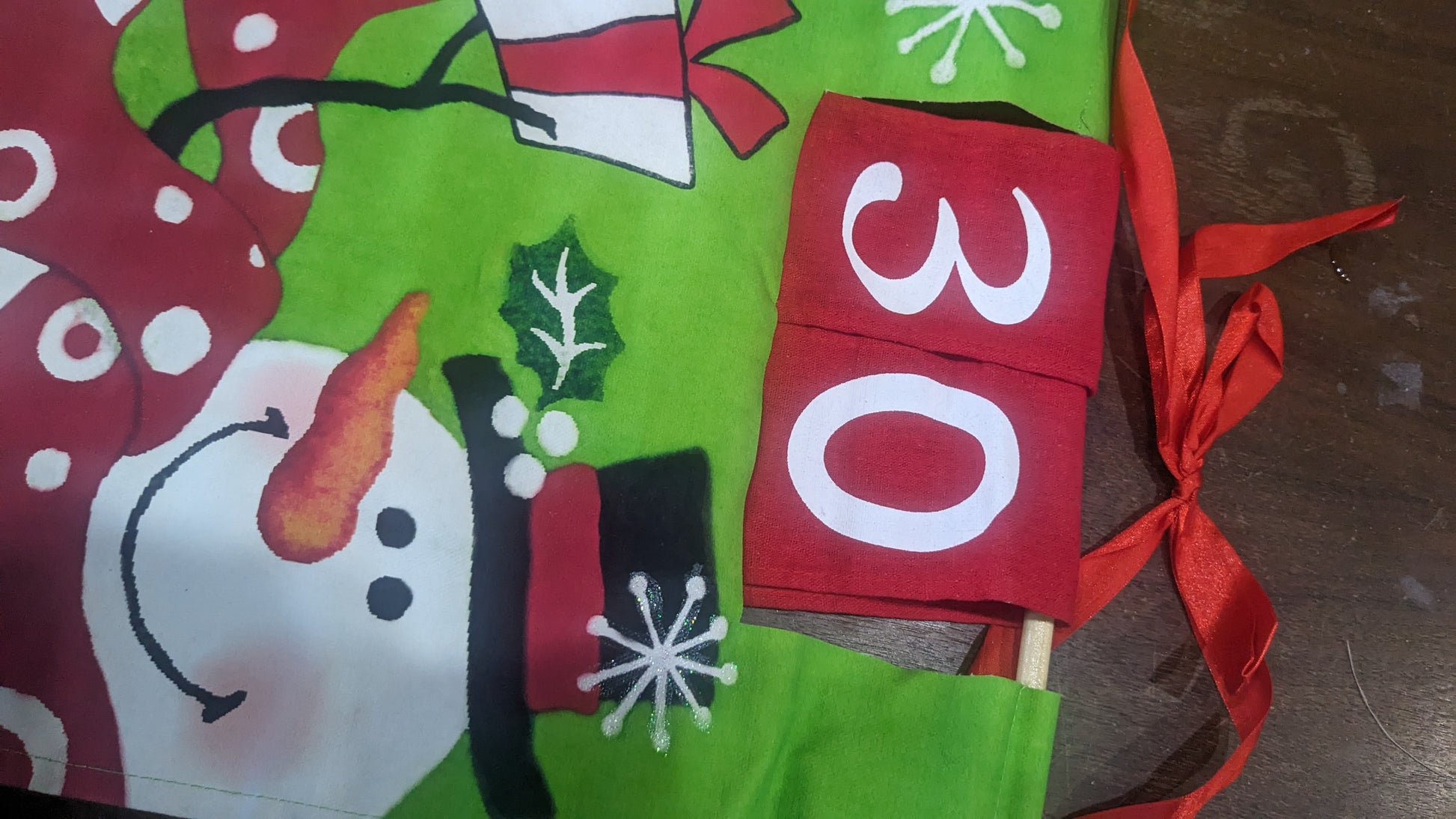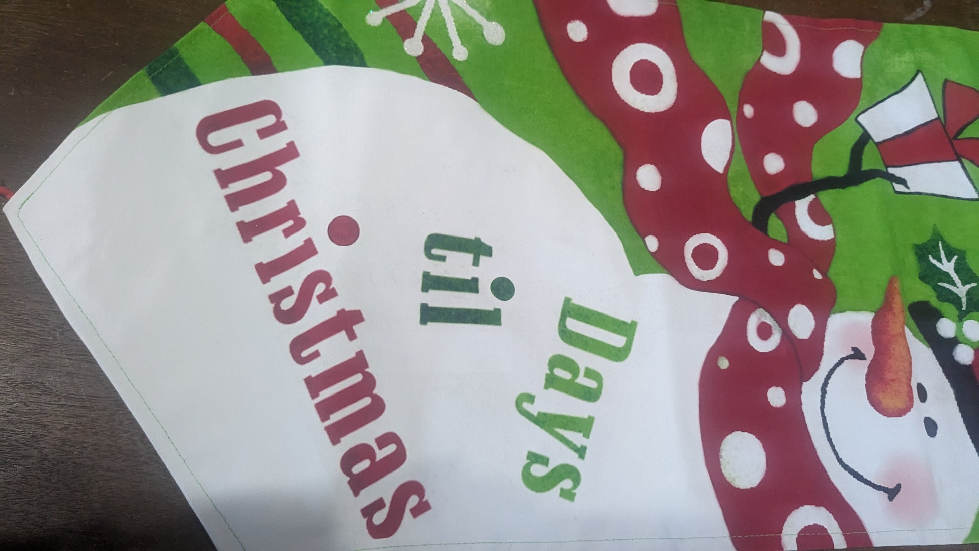 Painted on canvas This snowman countdown counts the days till Christmas with two fabric banners on a system so you can pull the days through. It's a nice quality canvas 28 in long not including the snowflake at the bottom 13 and 1/2 in wide for the canvas. The dowel is almost 17 " wide