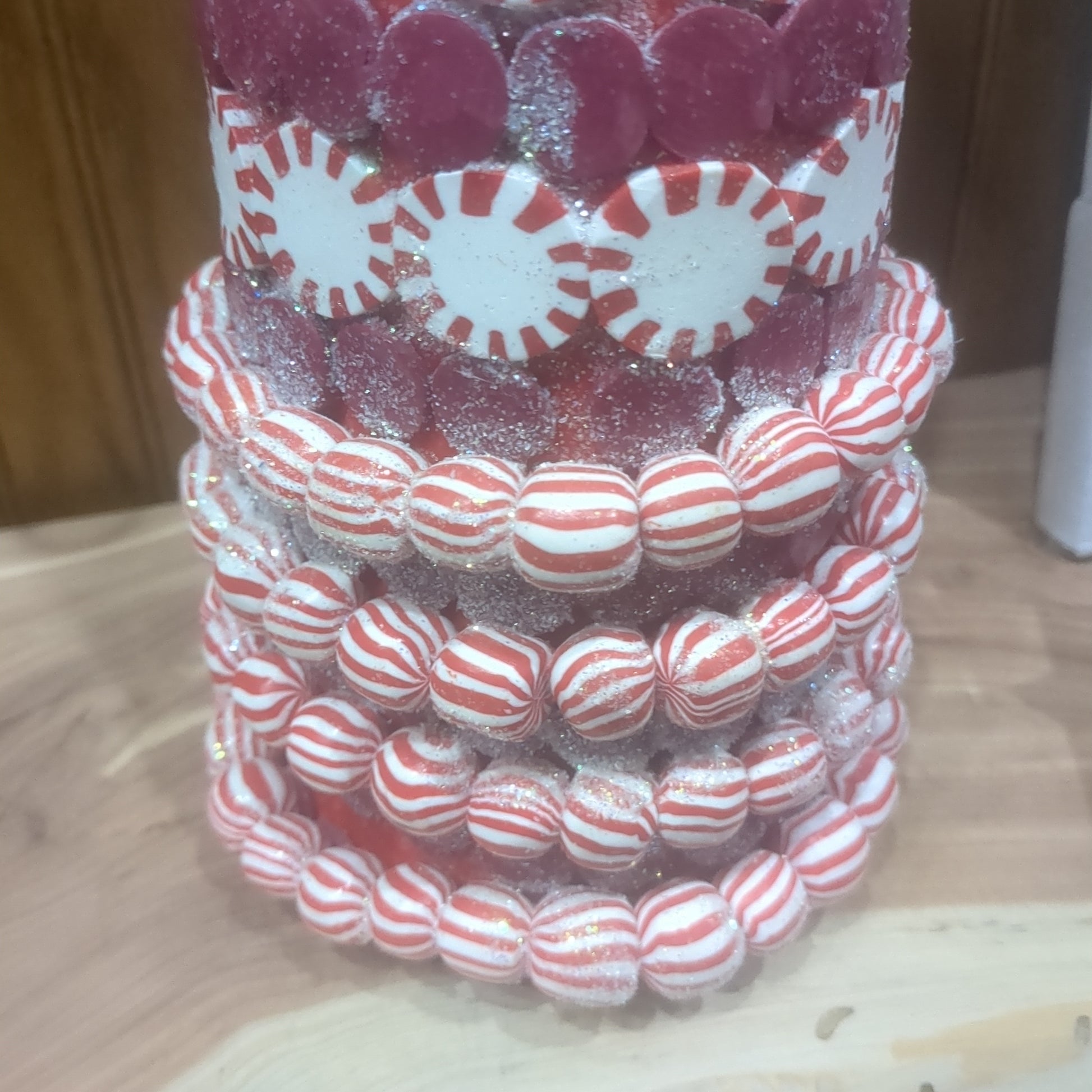A Christmas tree that looks like flattened Christmas candy all over it unique decoration. 18" tall 5 1/2" dismeter