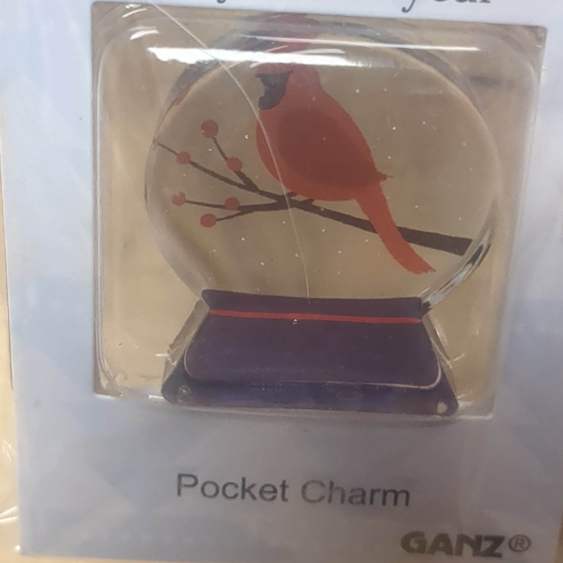 Pocket charm snow globe appearance with cardinal inside. Your friendship is a blessing every day of the year