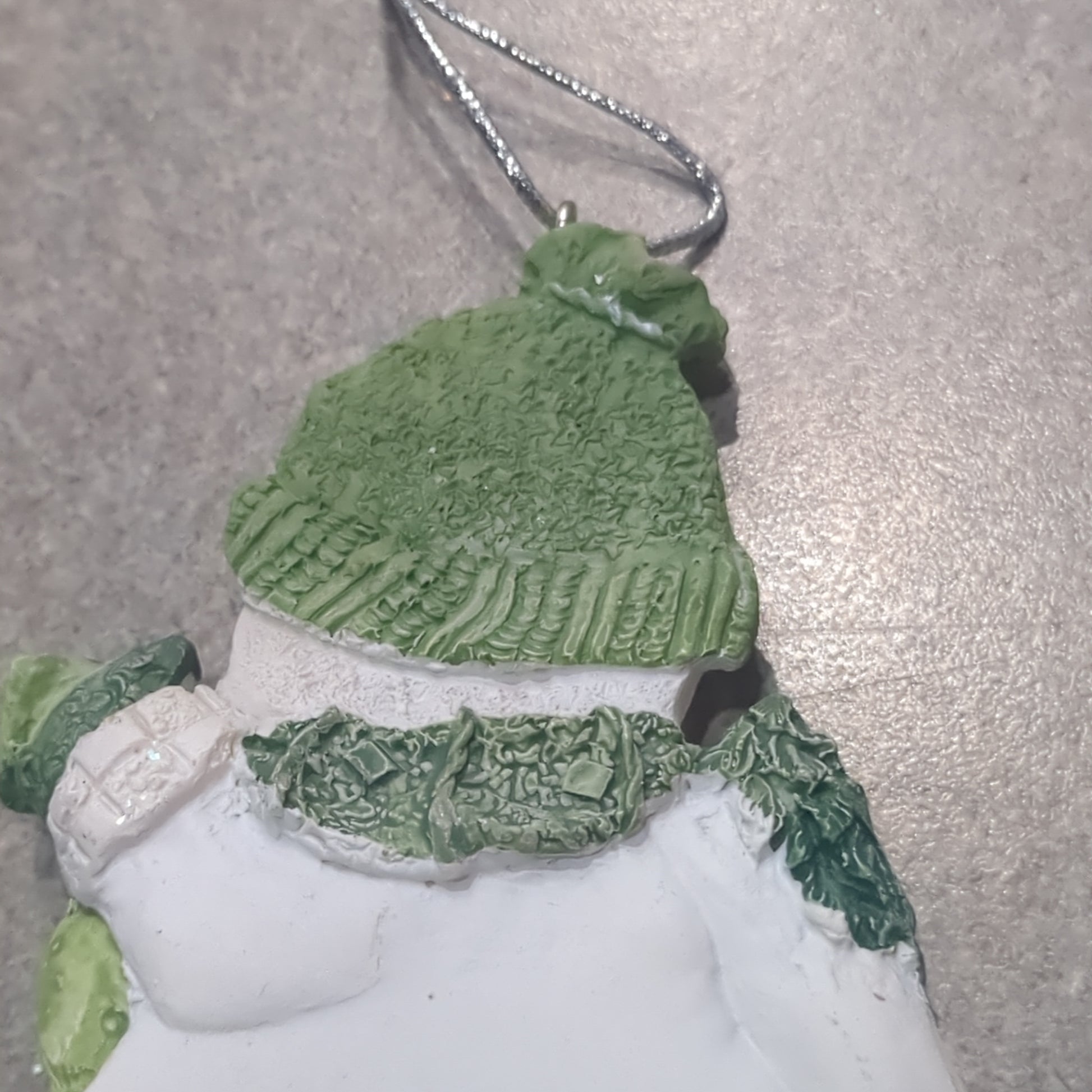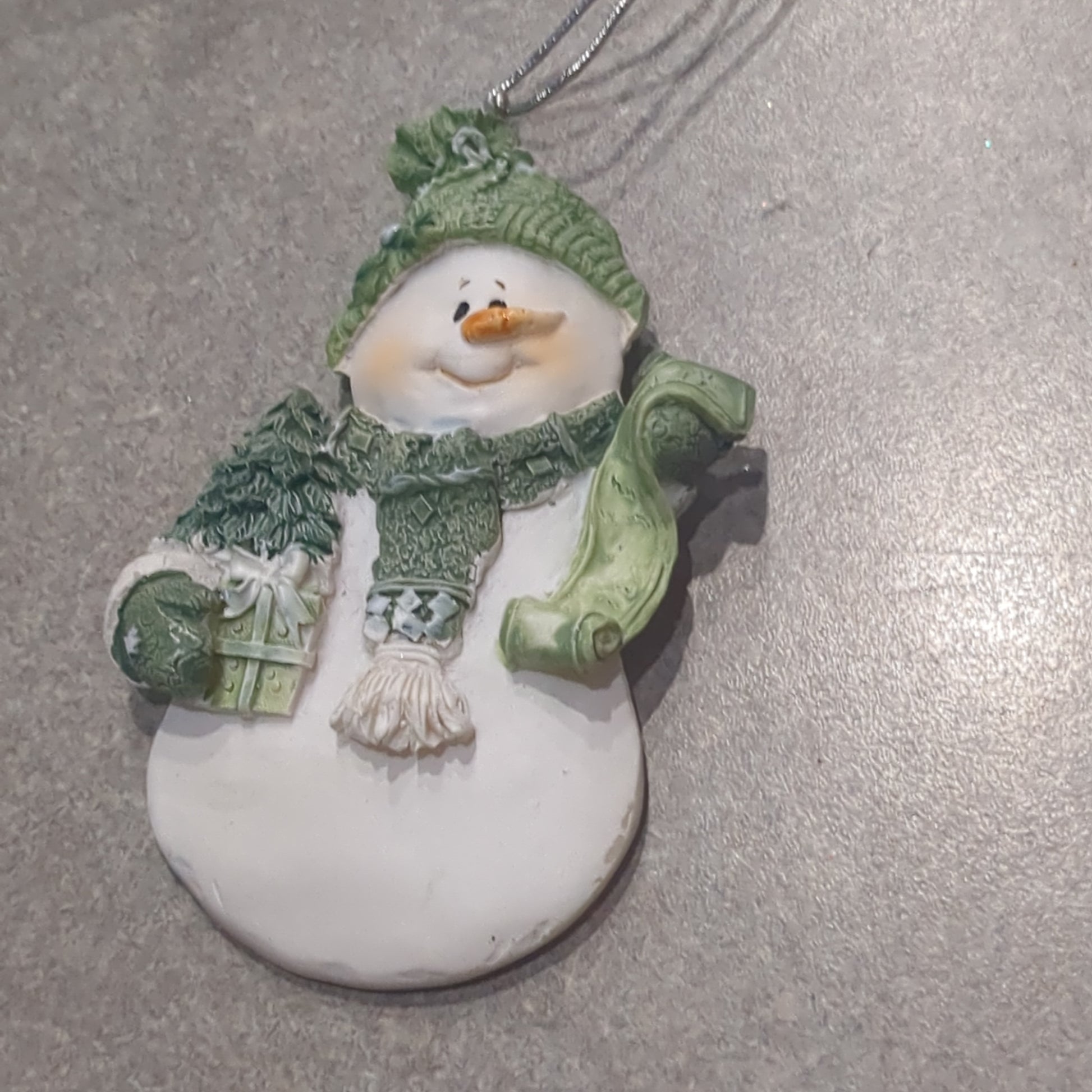 Og1 Polycrylic snowman ornament with a scroll and gift - green