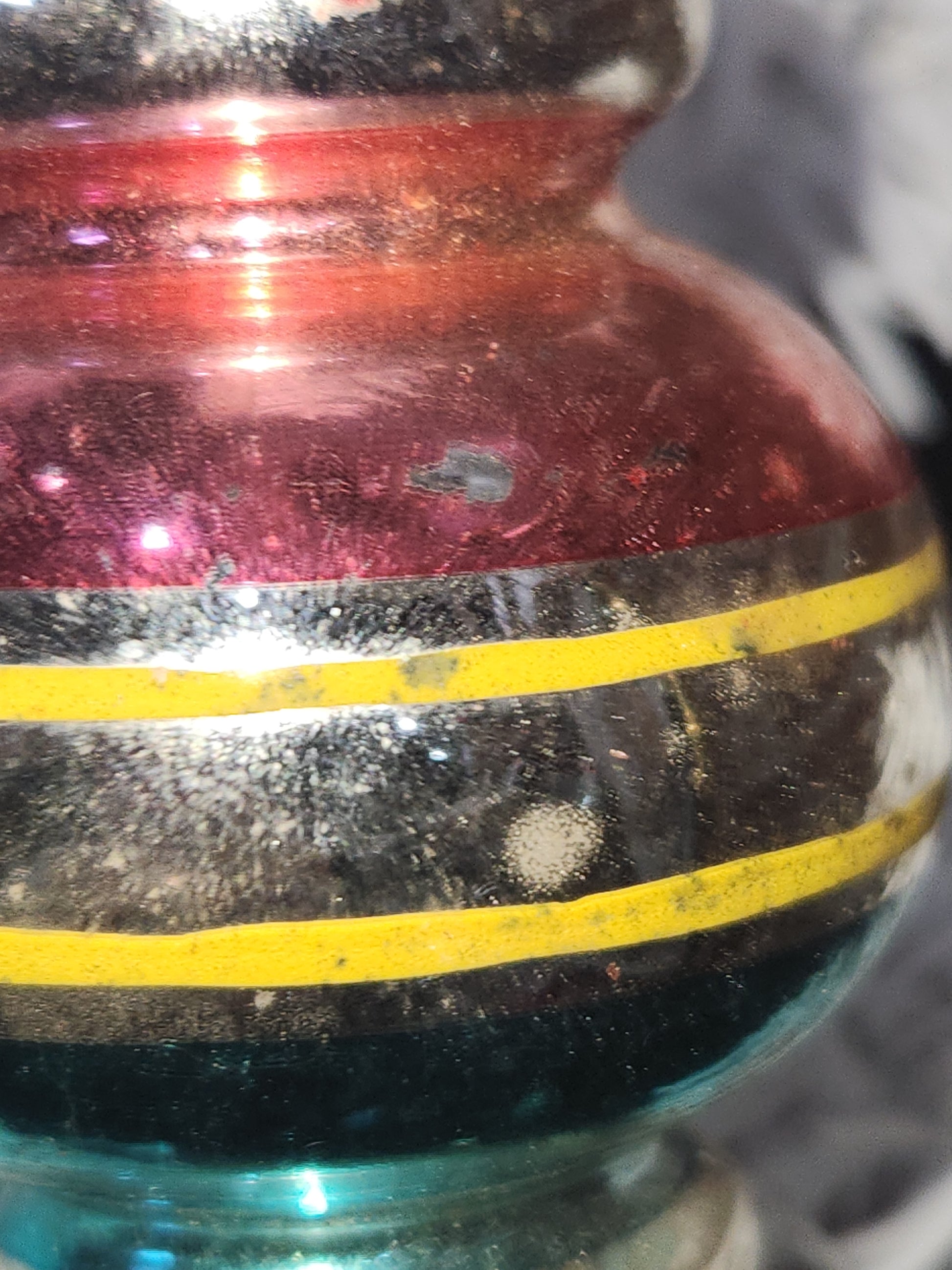 The ornamanet is in fair vintage condition. The colors have faded a but. It has a cap that says Made in U.S.A. it does have a small chip at the neck. When buying vintage ornaments, you may be getting discoloration, paint loss, crazing, please be aware of this before ordering. Please see photos as they part of the description.