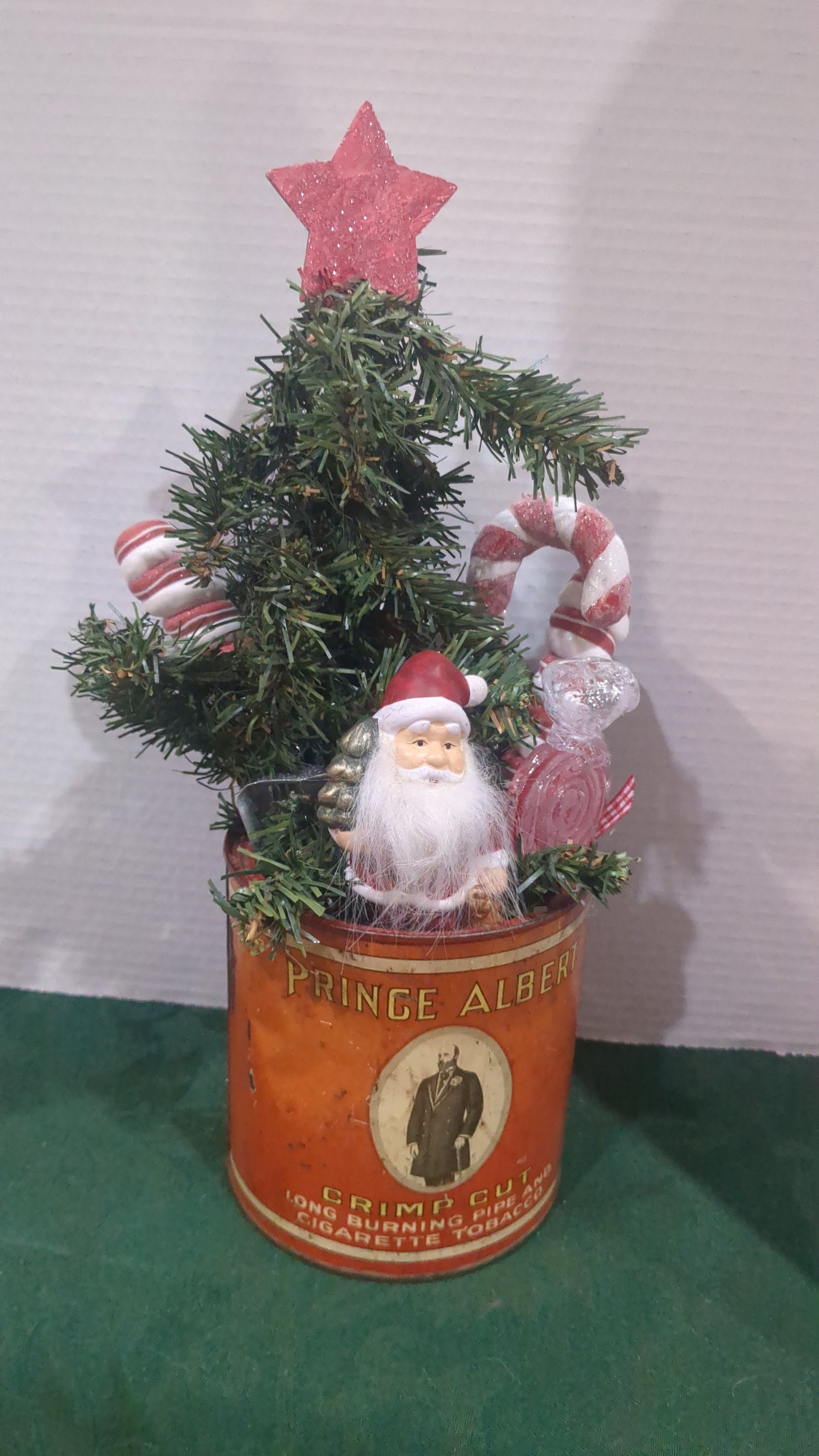 One of a kind Christmas decor handcrafted here at our store Christmas sculpture made from Prince Albert can. Hot glue added only to the bottom of can to hold floral foam.
