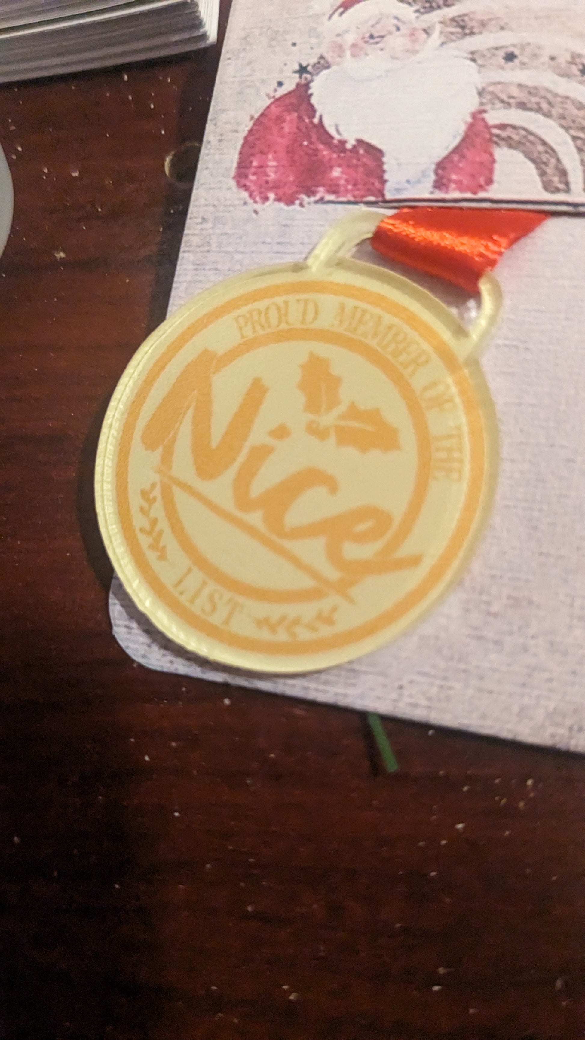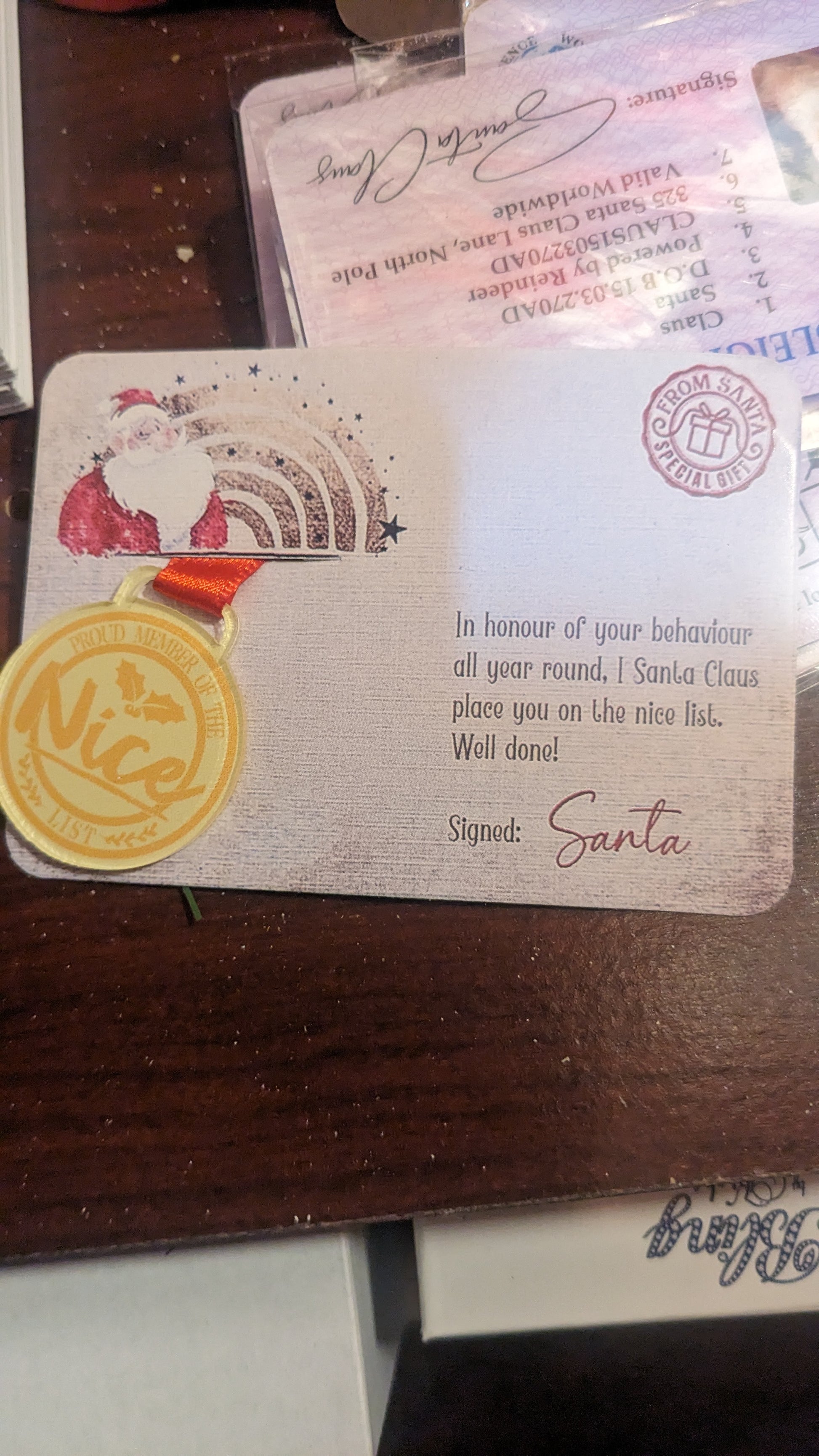 Children will be so excited when they receive this card that says an honor of your behavior all year round I Santa Claus place you on the nice list well done sign Santa and it has a little plastic medallion with a ribbon