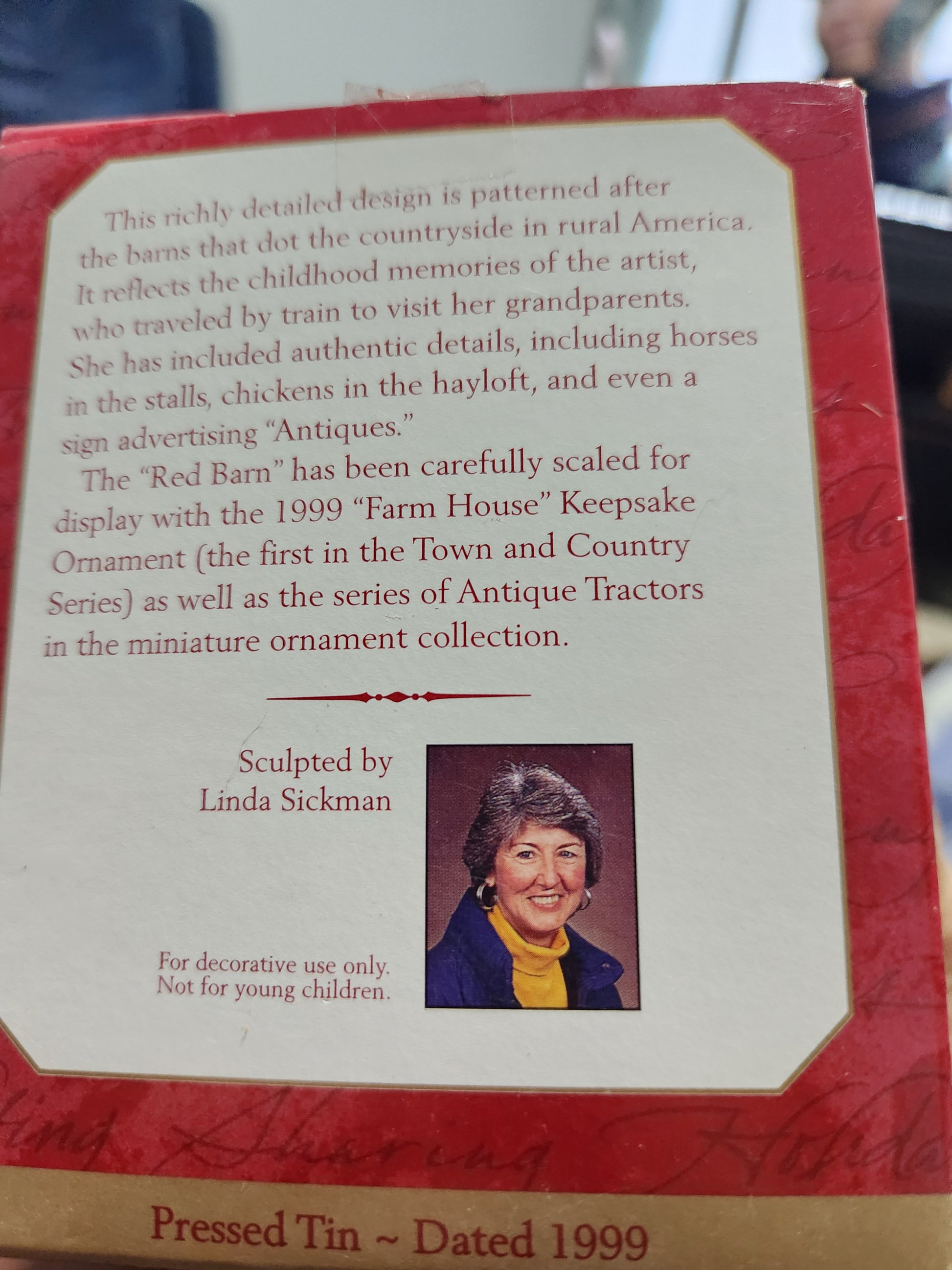 Vintage Hallmark Keepsake Ornament Red Barn 1999 complimentary to Farm House Town and Country Series. Cones in original box. Pressed Tin sculpted by Linda Sickman