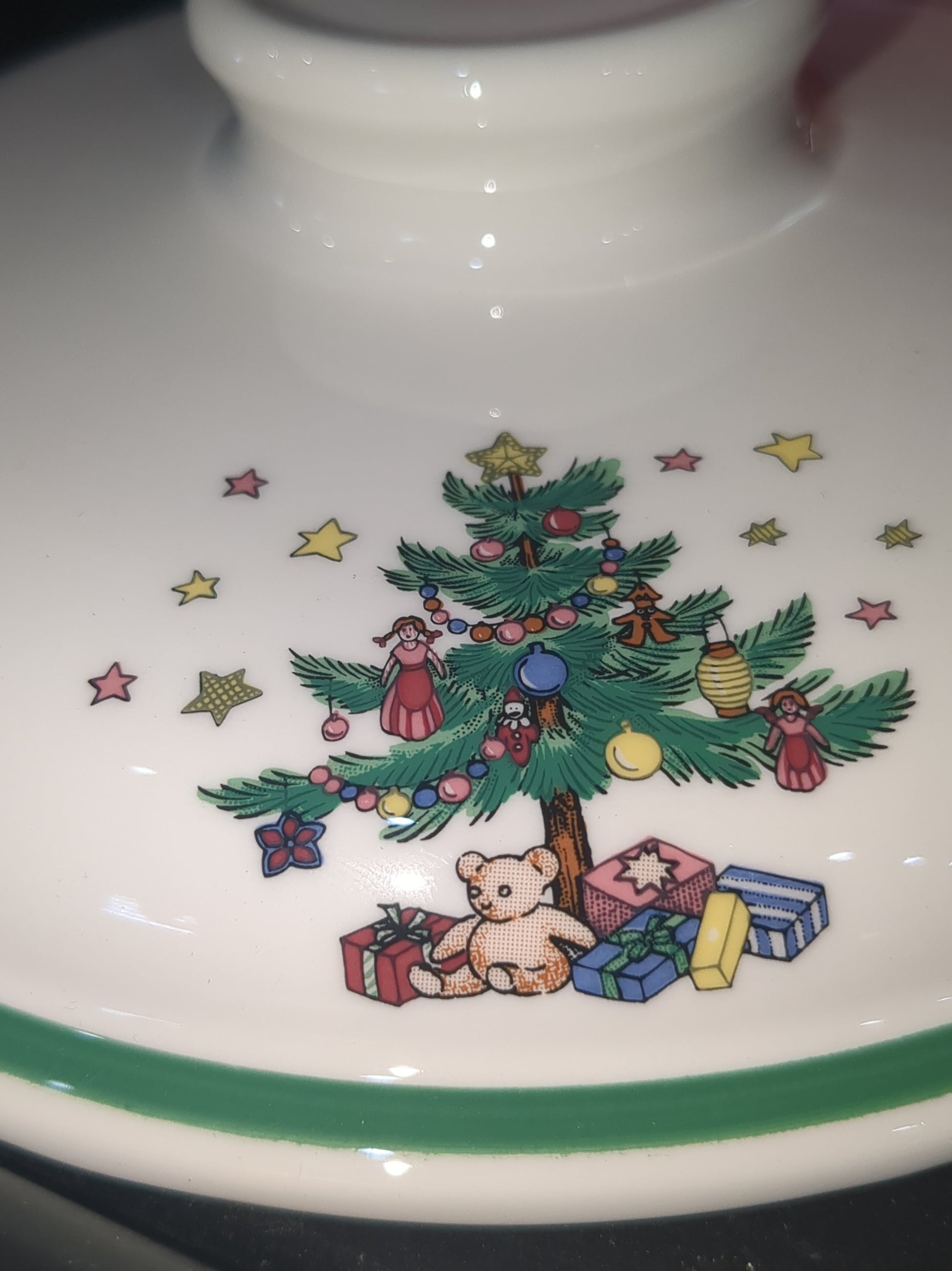 Nikko Happy Holidays Christmastime 1 1/2 qt Casserole replacement lid. The casserole dish broke but the lid did not so I'm selling the replacement lid it does have its original box and lid but it does not have the casserole dish. Please see photos as they a part of the description.