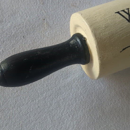 This is an 18-in standard rolling pin found in a thrift store We have painted it and painted on the graphics. It is getting harder and harder to find wooden rolling pins, If you have a wooden rolling pin that you would like us to decorate for you just bring it in! Some cute ideas would be grandma and Grandpa's kitchen with handprints from the kids which we can size down to fit or we can put a base of color on you get their handprints and we'll seal it up for you. There are so many ideas just Pinterest rolling pin upcycle.