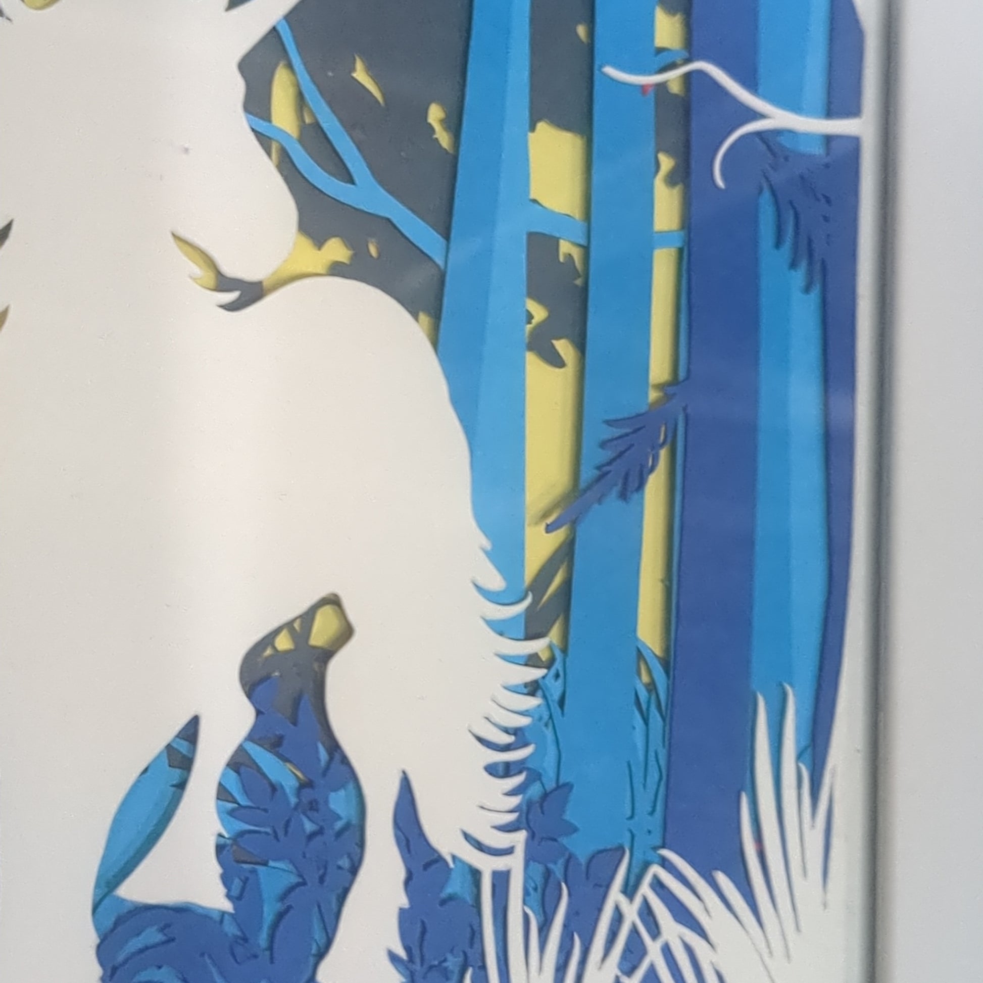 Roughly 5 x 6” white shadow box with paper cut unicorn in Forest serene