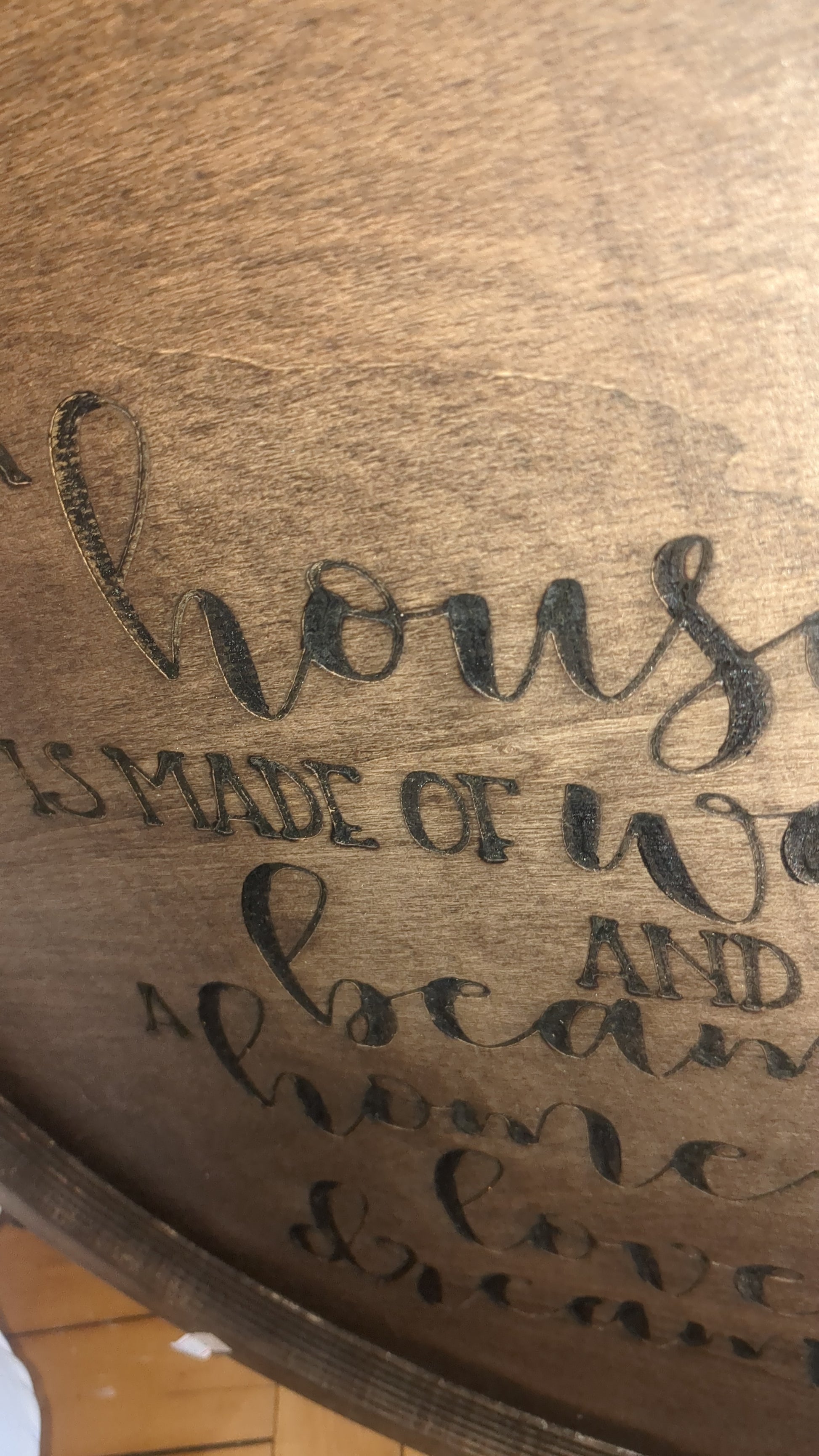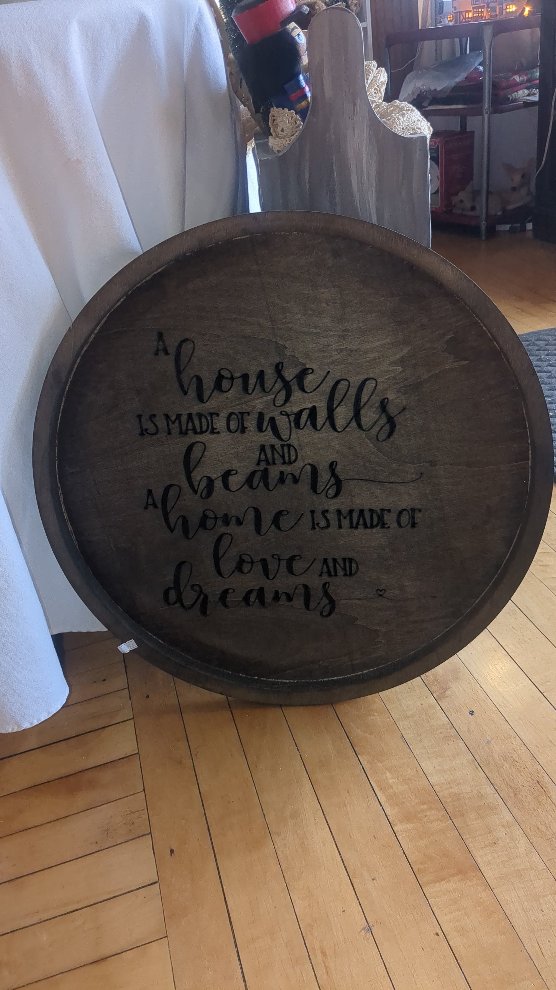Round wooden sign a house is made of walls and beams at home is made of love and dreams with a little heart has a hang around the back. 22inches in diameter