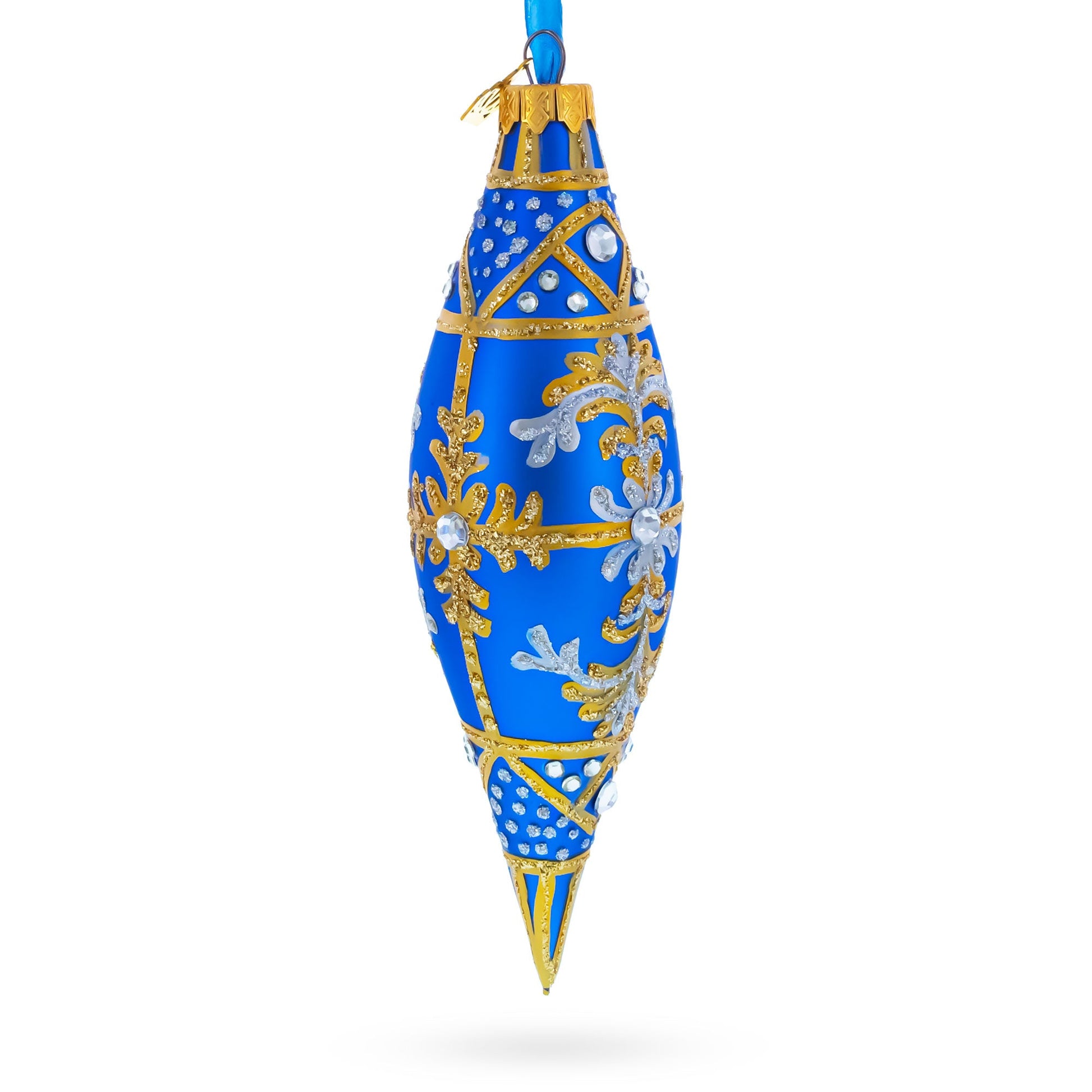 Royal Blue and Gold Snowflake Jeweled Elongated Pointed Teardrop Finial Glass Christmas Ornament