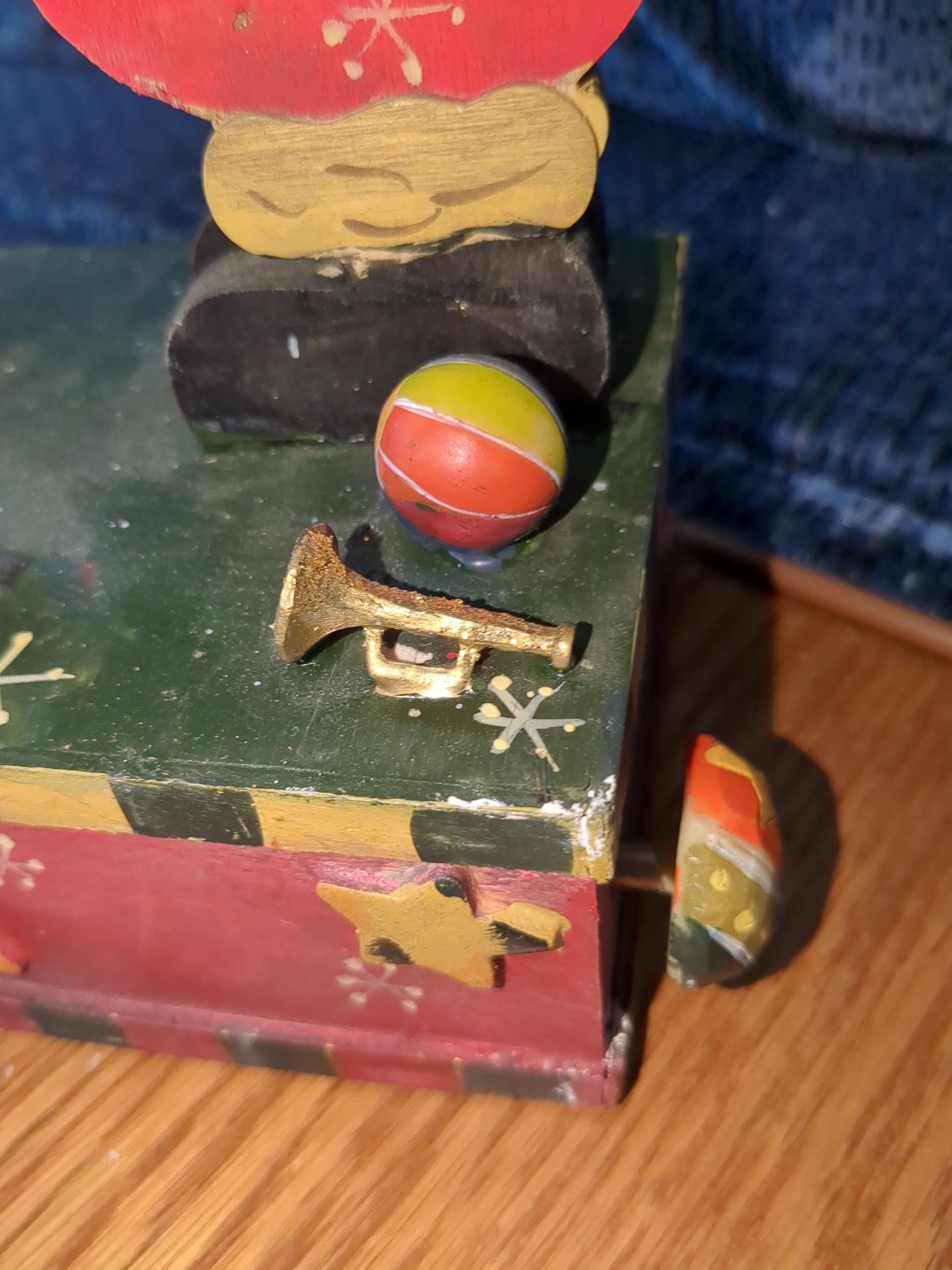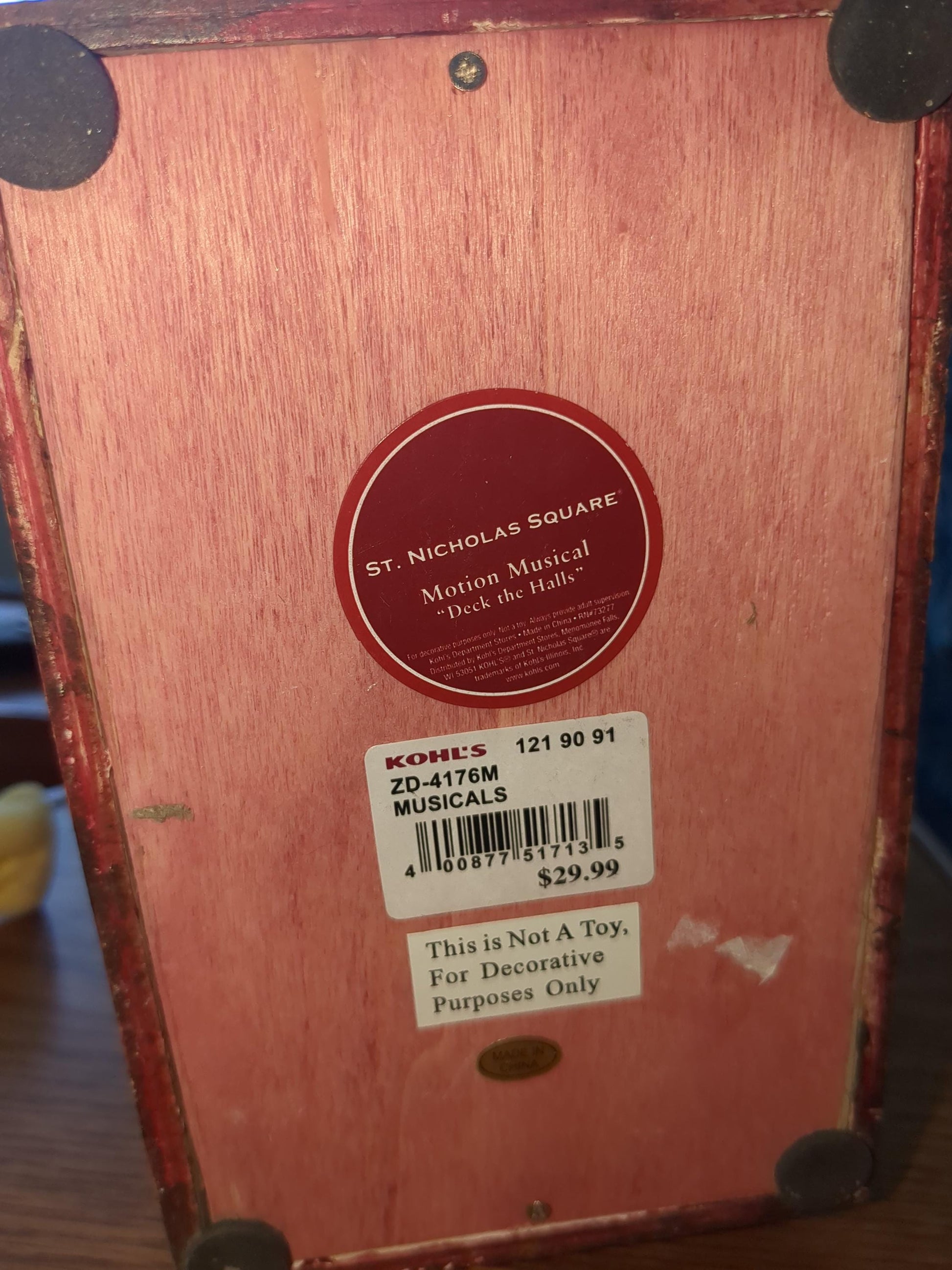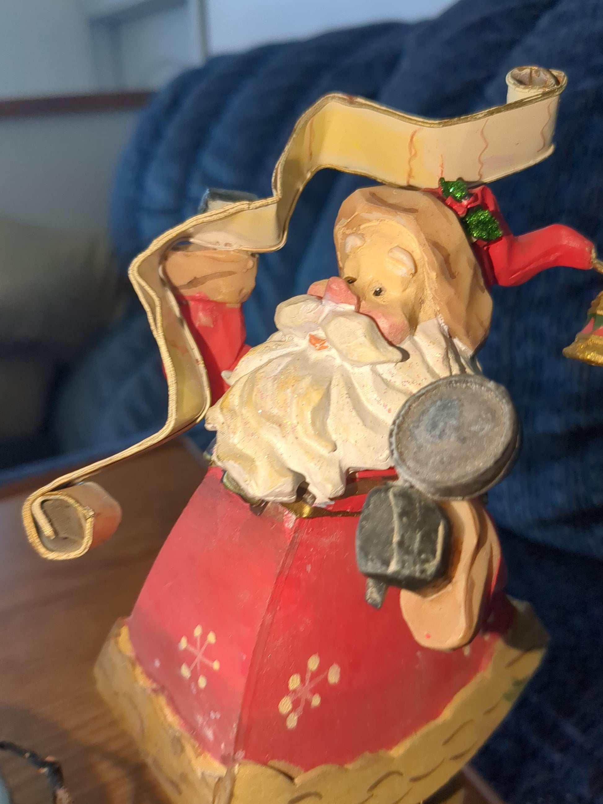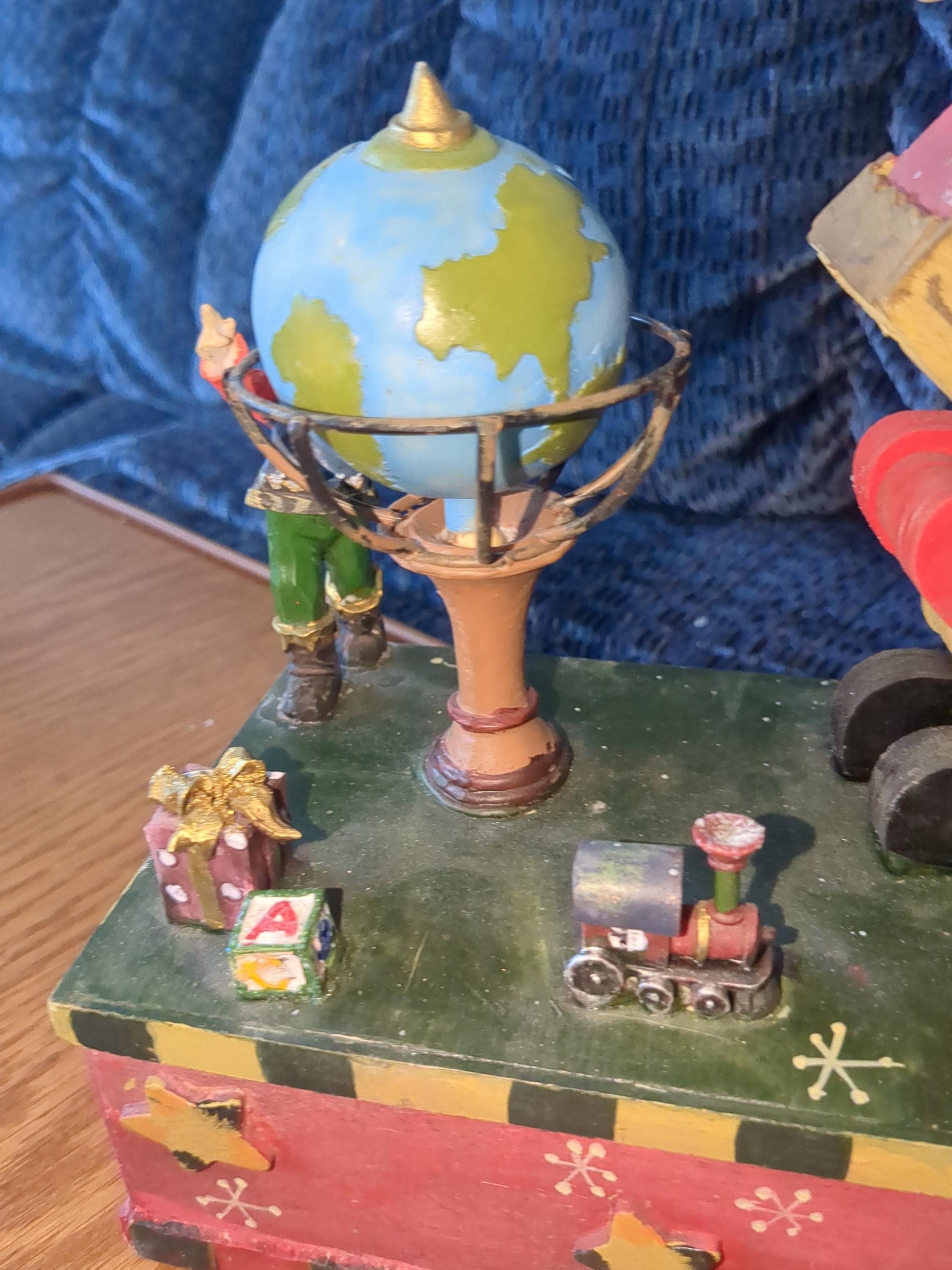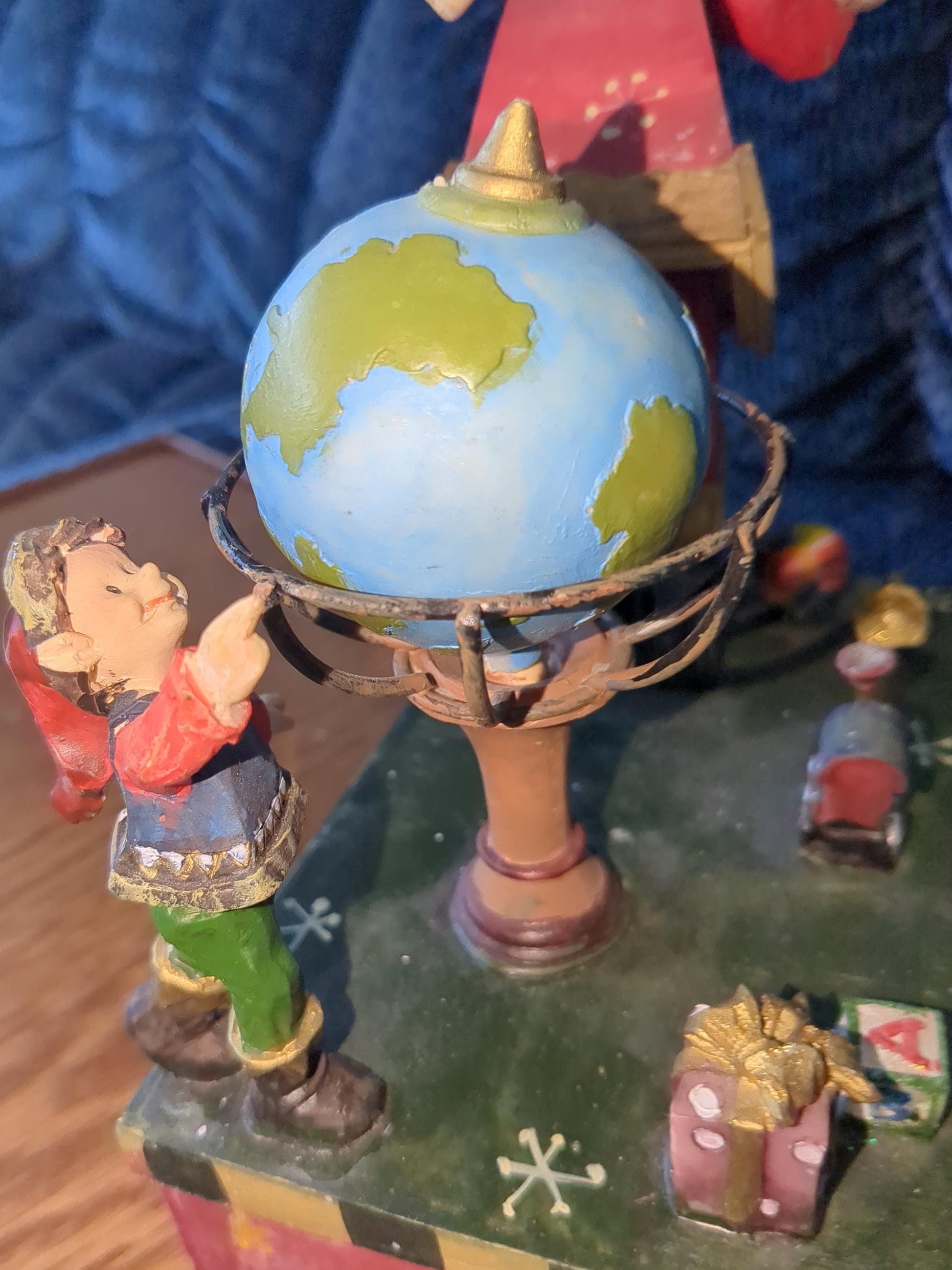 Saint Nicholas Square animated Santa music box. This piece is labeled “Deck The Halls” and features Santa and an elf. Santa has a magnifying glass and is looking at the globe where he will be delivering presents to his long list of boys and girls. List is also depicted as well as some toys and gifts. There is a knob to turn to start the music and animated feature. When activated Santa rocks back and forth but when first wound the music plays pretty quickly and Santa rocks back and forth pretty quickly. the globe spins while the music plays. This is a preowned piece in good condition for its age. Some minor wear ( see photos). The music box measures approximately 6 3/4” long x 4” wide x 9 1/4” tall.