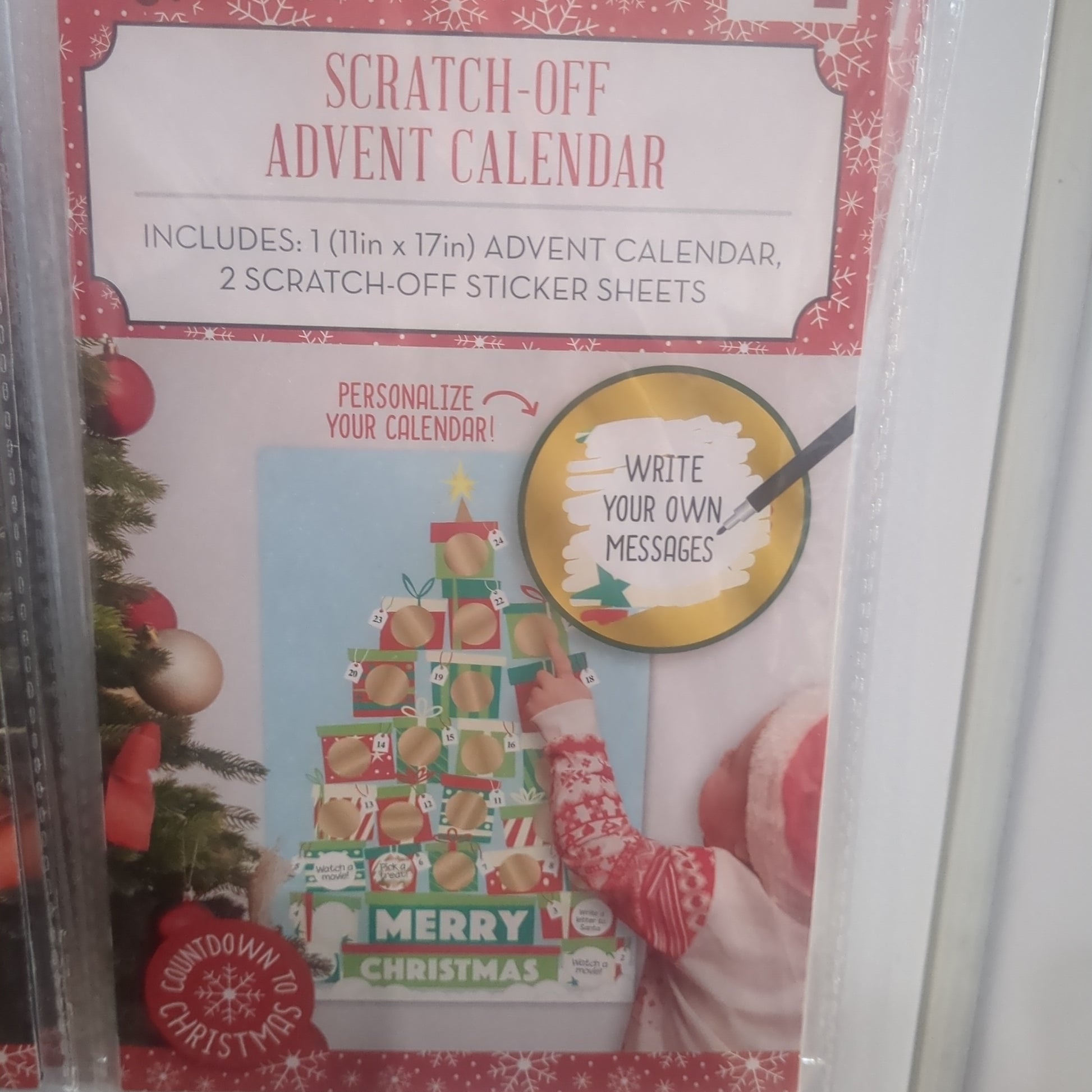 This is a scratch off Advent calendar. You write your own messages put the sticker on and then you scratch off each day of December until Christmas. It includes two sheets of scratch off stickers