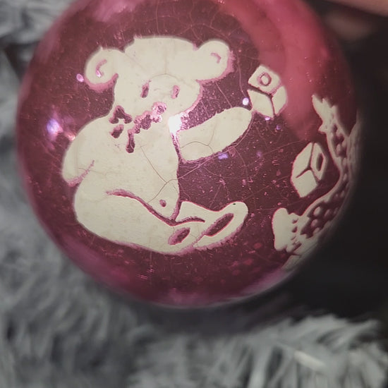 Vintage Shiny Brite Pink Christmas Ornament Stenciled Toy Bear Duck Toy Horse Clown Sailboat GLOWS vo26