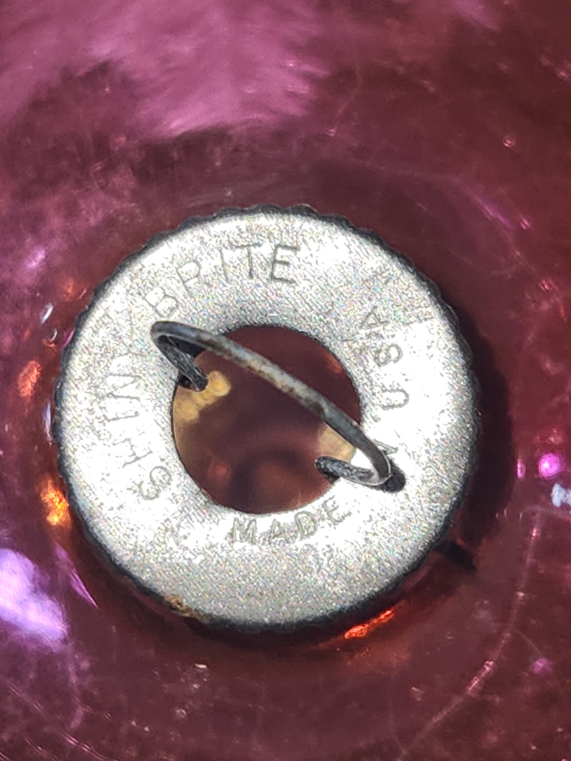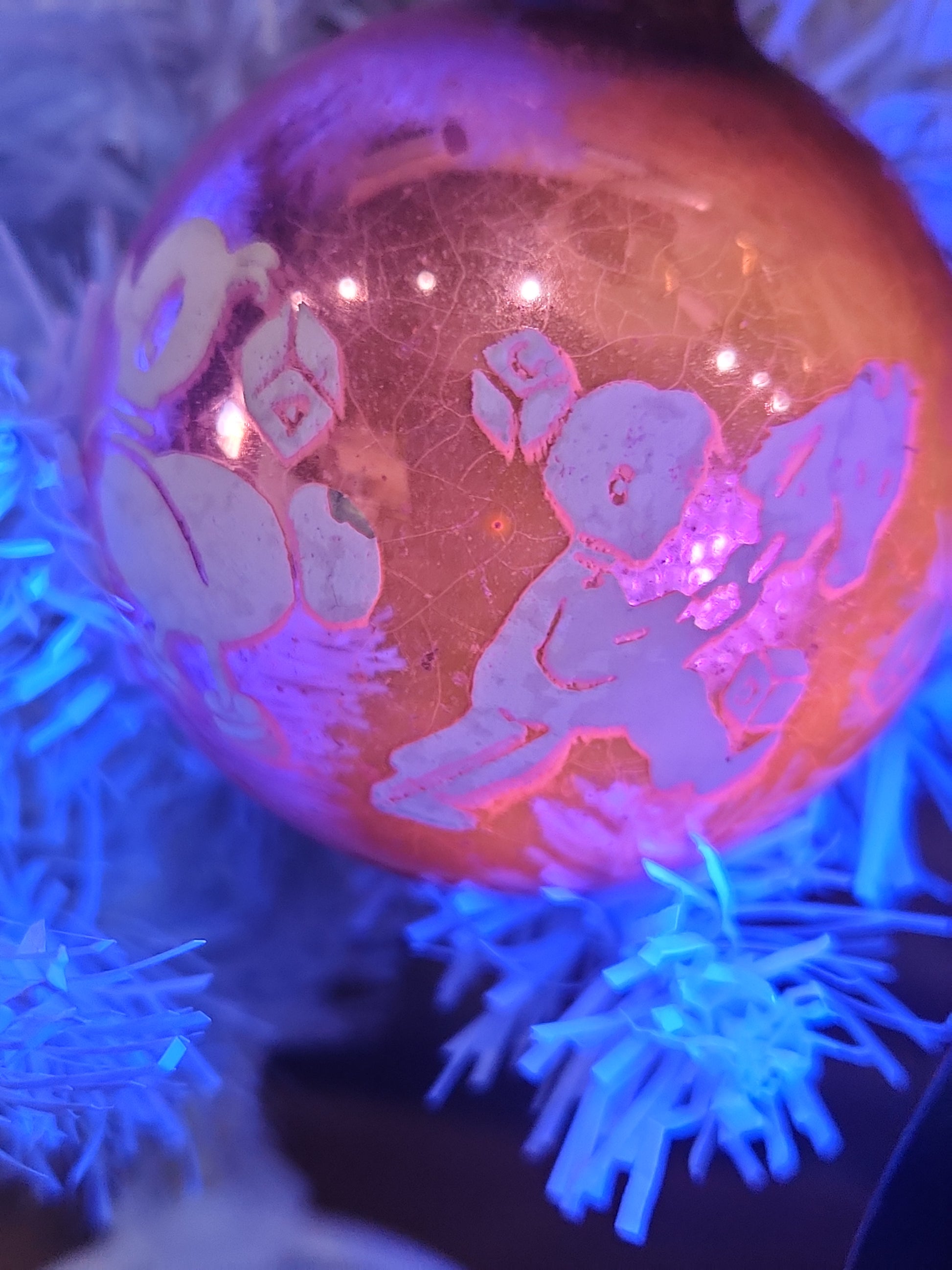 The ornamanet is in fair vintage condition, with discoloration. The stencil is mostly intact, there are just a few areas of loss. It has a cap that says Shiny Brite Made in U.S.A. It is 2 1/2" diameter. it has a pink orange glow under UV light. When buying vintage ornaments, you may be getting discoloration, paint loss, crazing, please be aware of this before ordering. Please see photos as they part of the description.