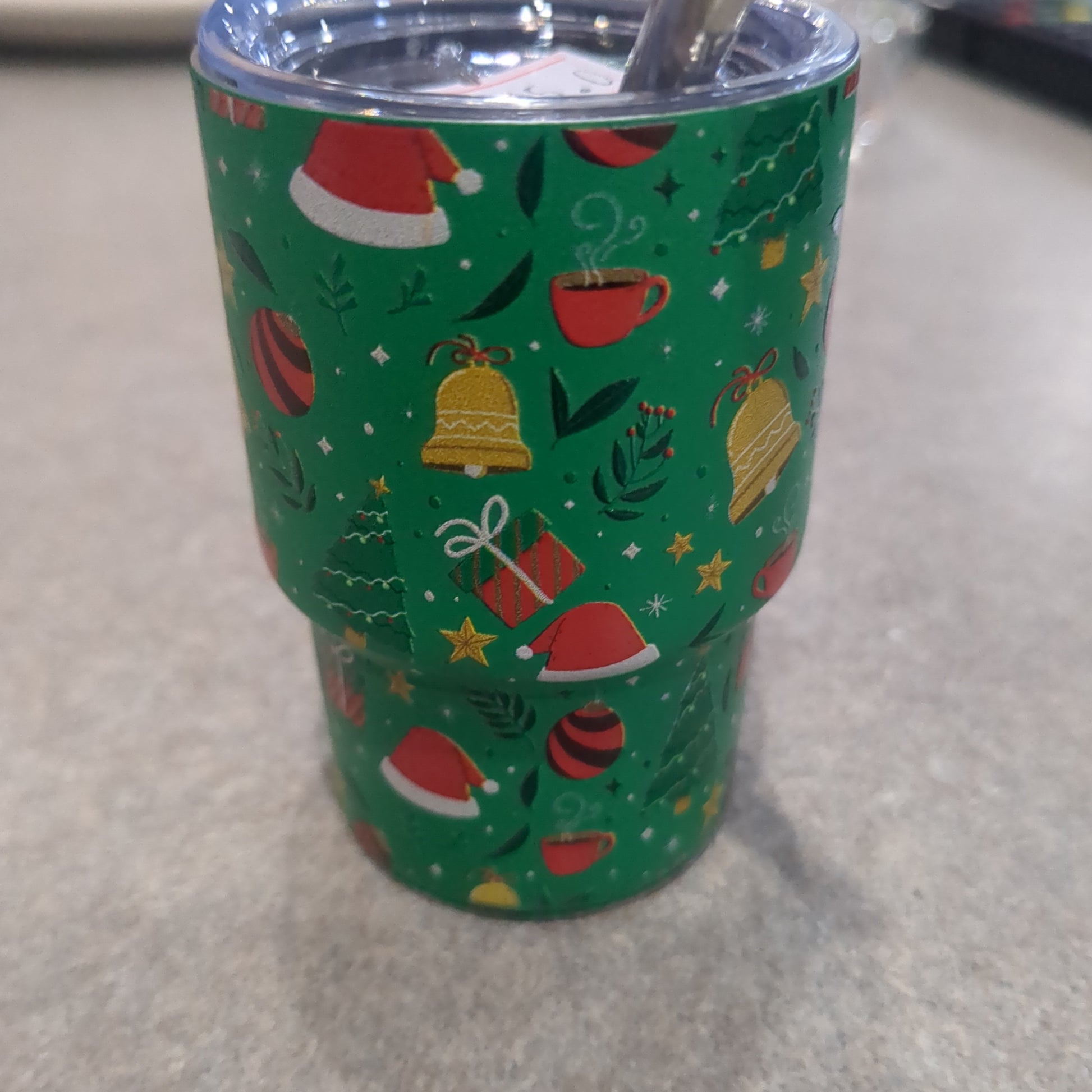 These cute shot glasses or mini tumblers for dolls and Barbies are stainless steel and insulated and are 3 oz they have a little plastic lid and a Little stainless steel straw This one is red with Christmas icons symbols throughout is that powder coat finish It does lightly say 2023 on the very bottom