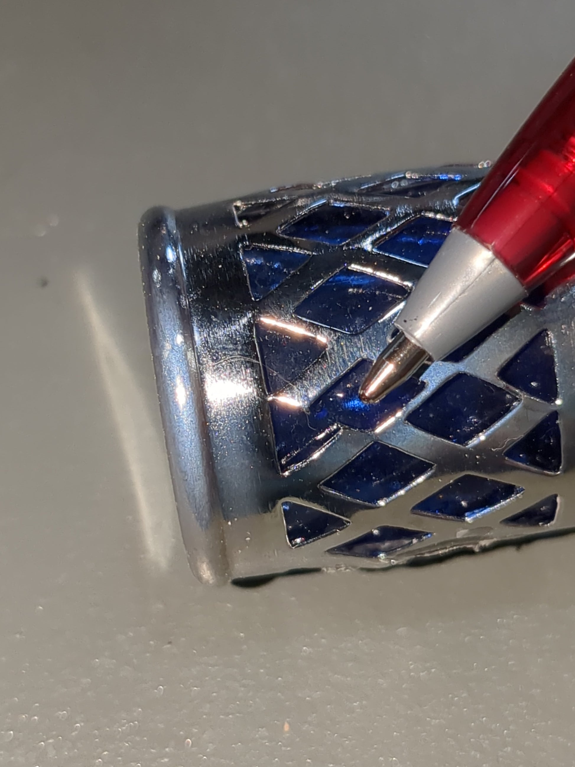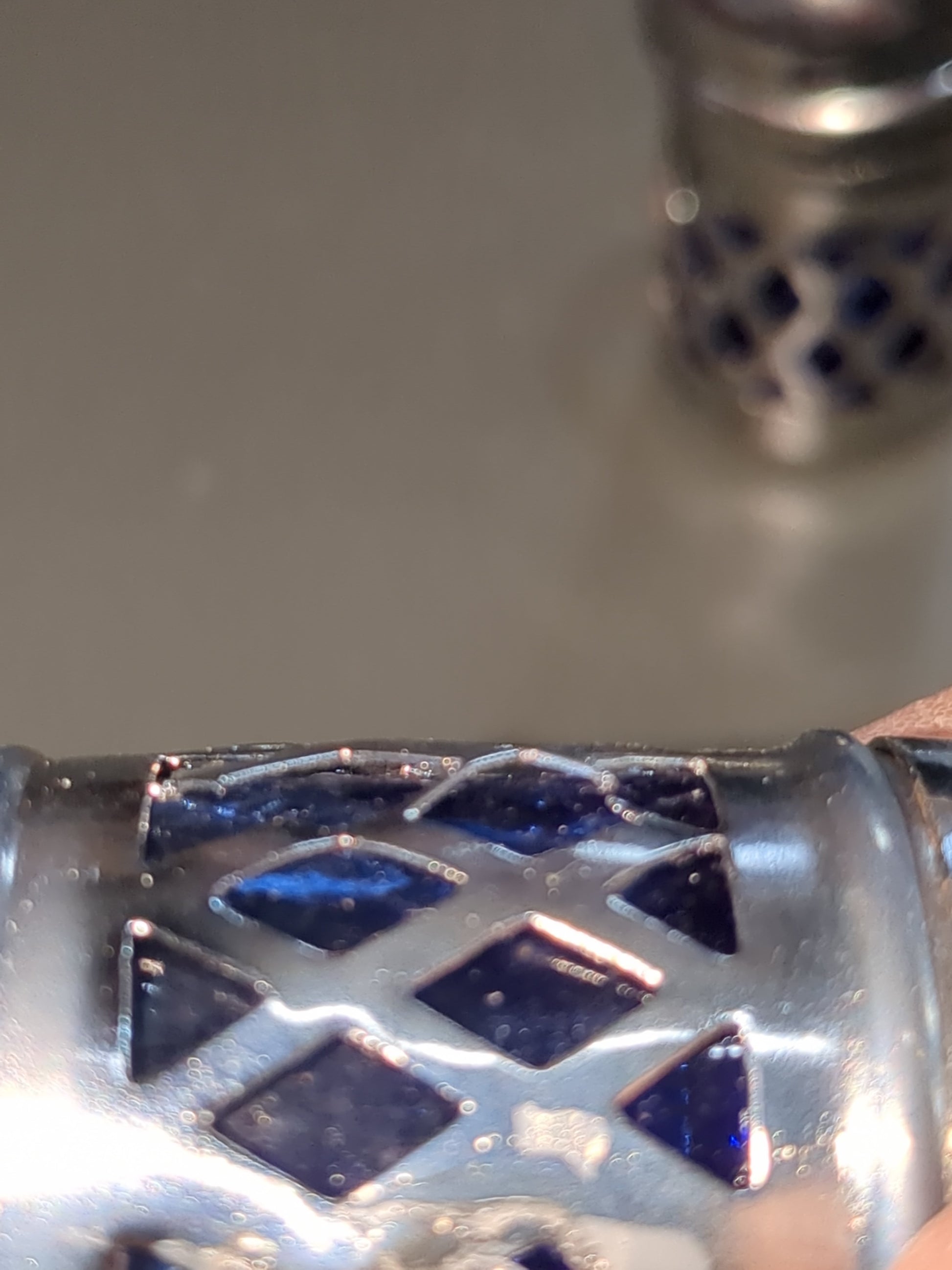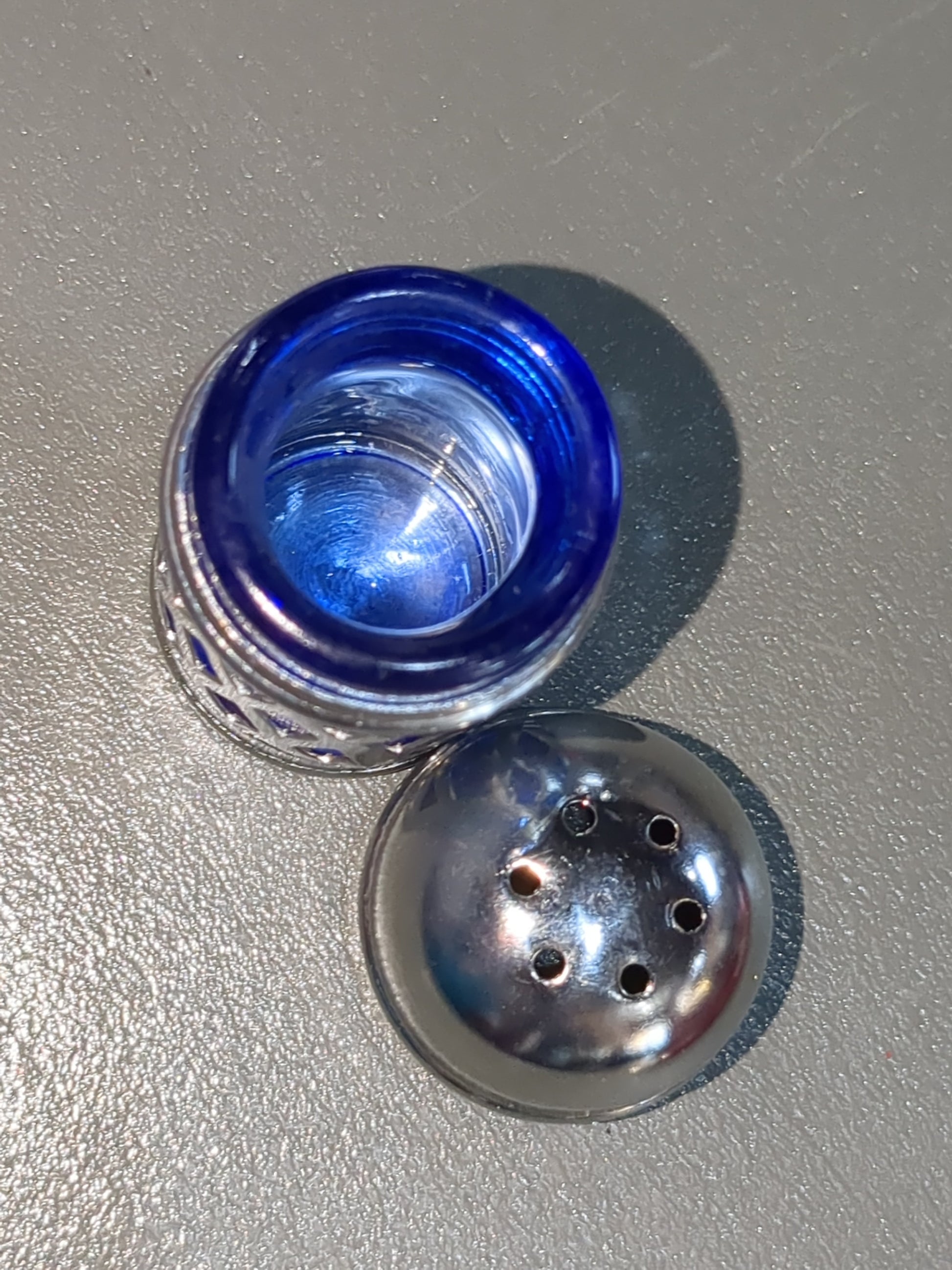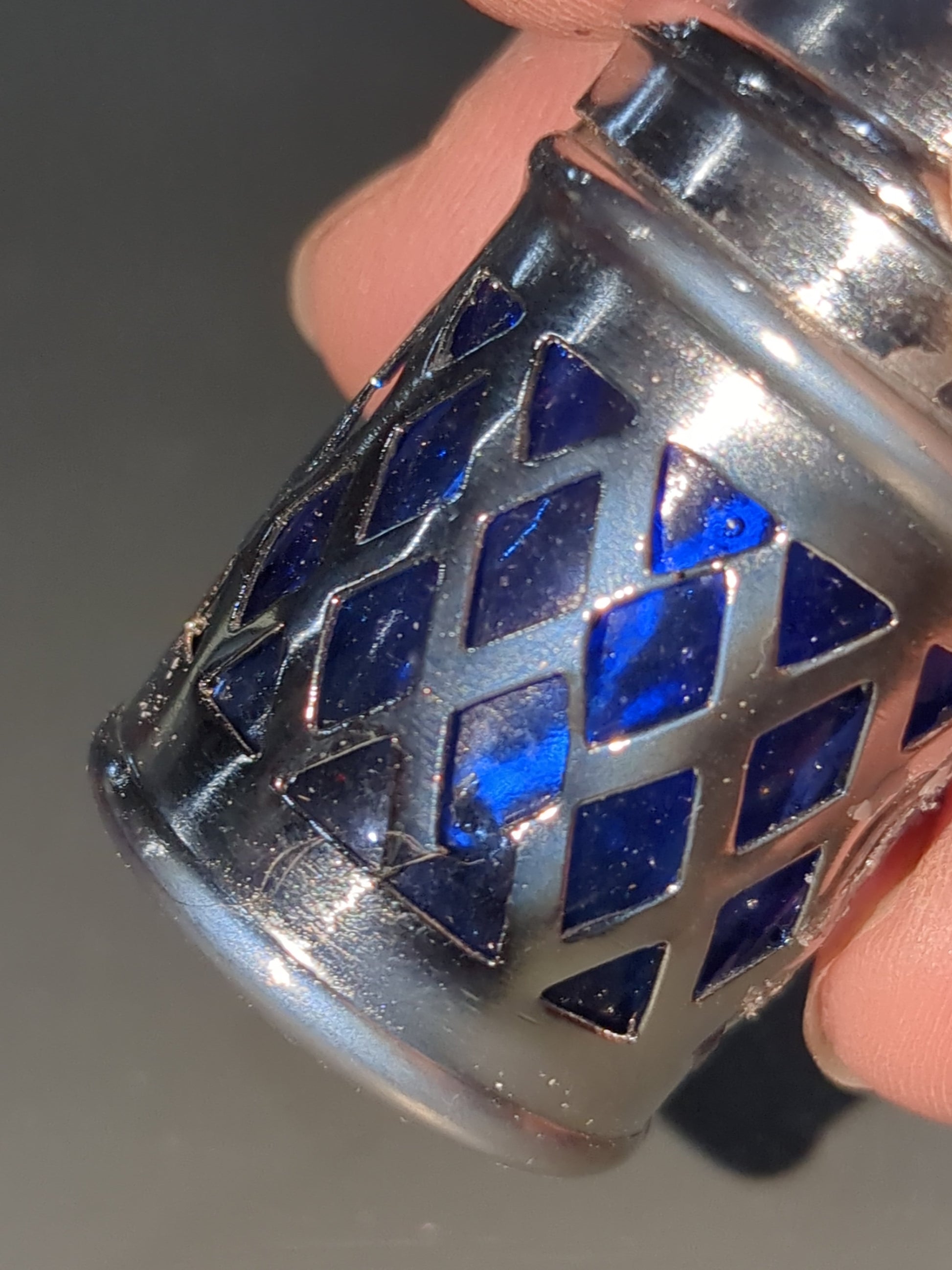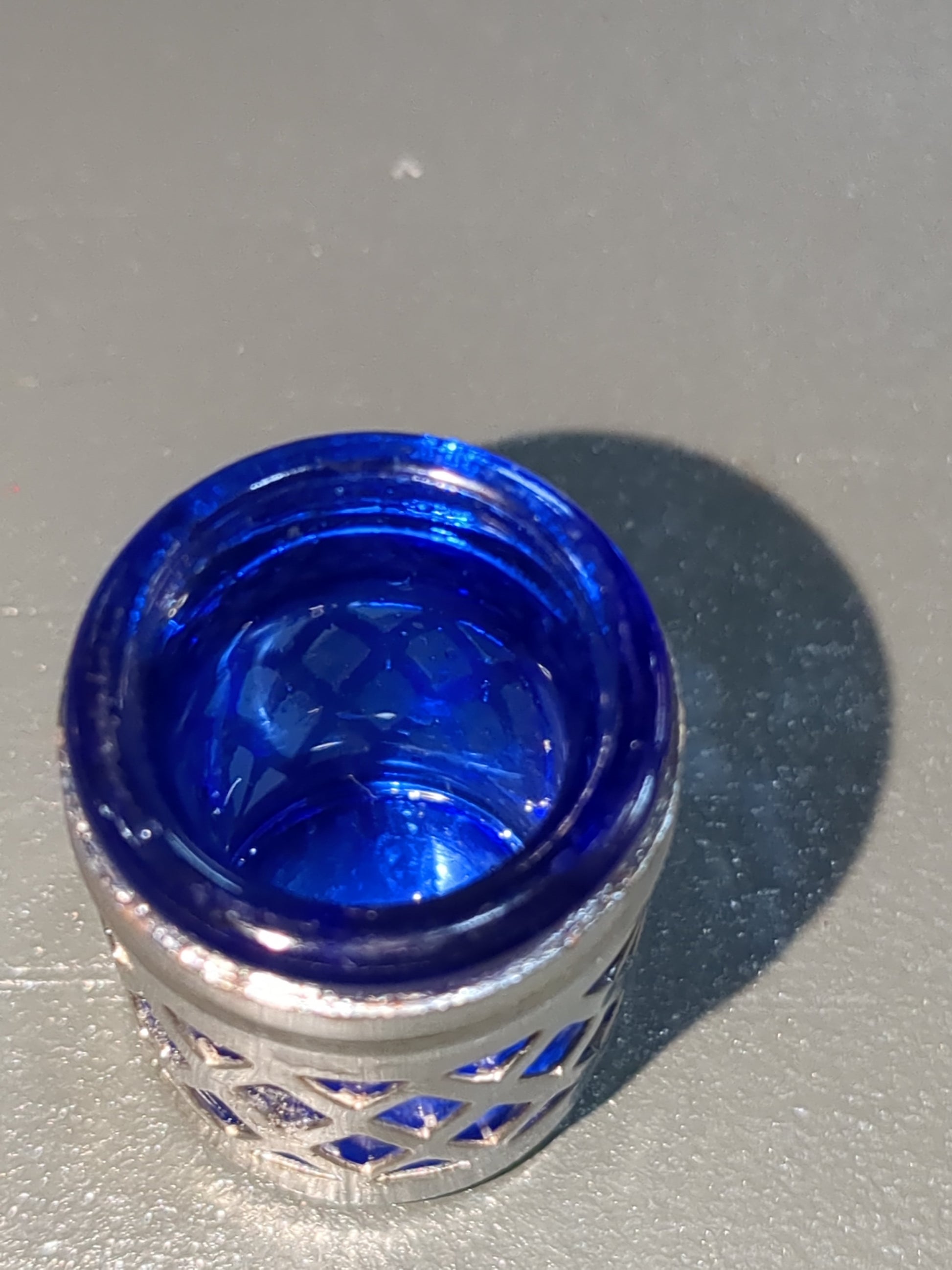 With cobalt Blue, glass Insert. No Maker's Mark seen.