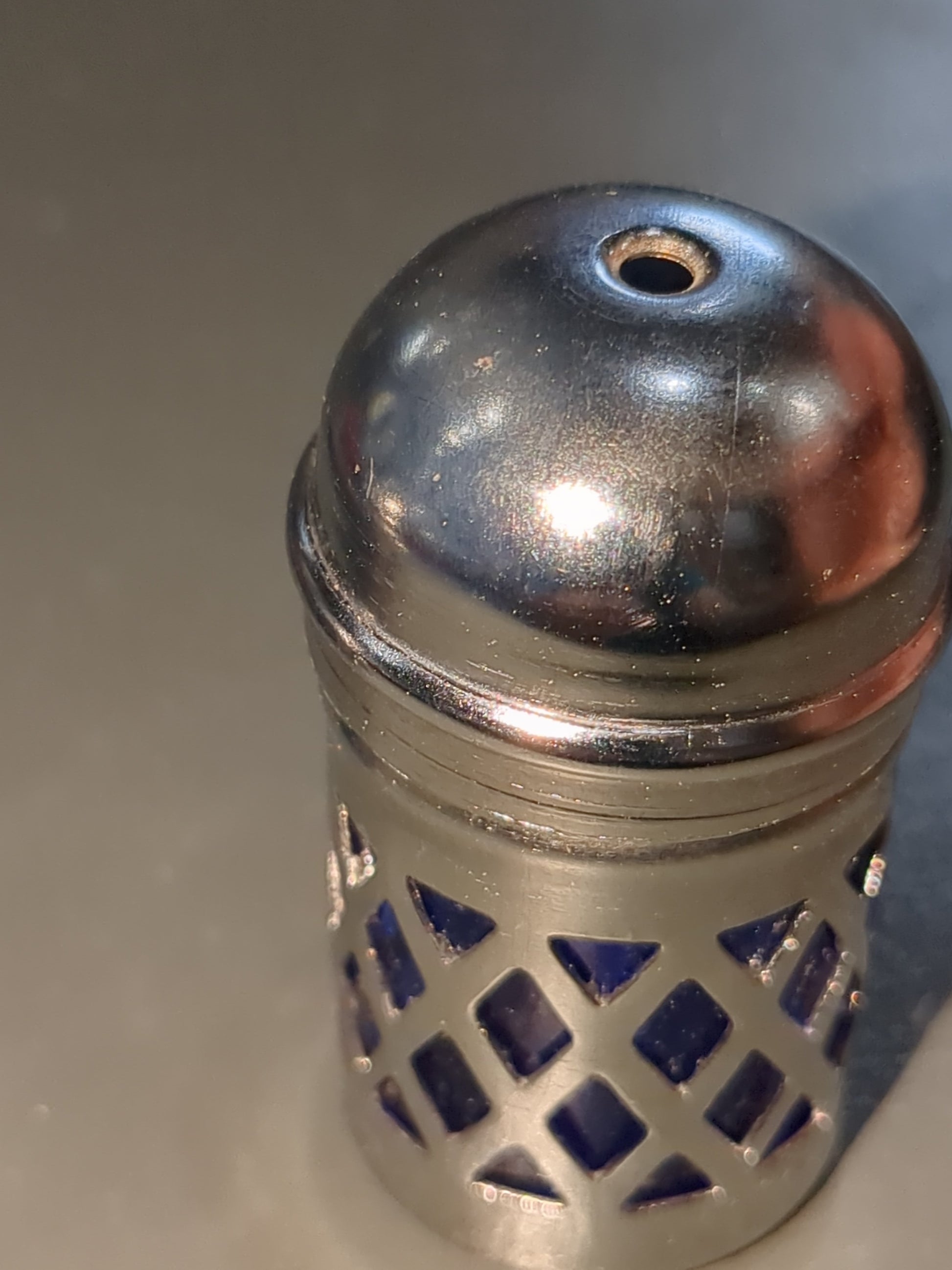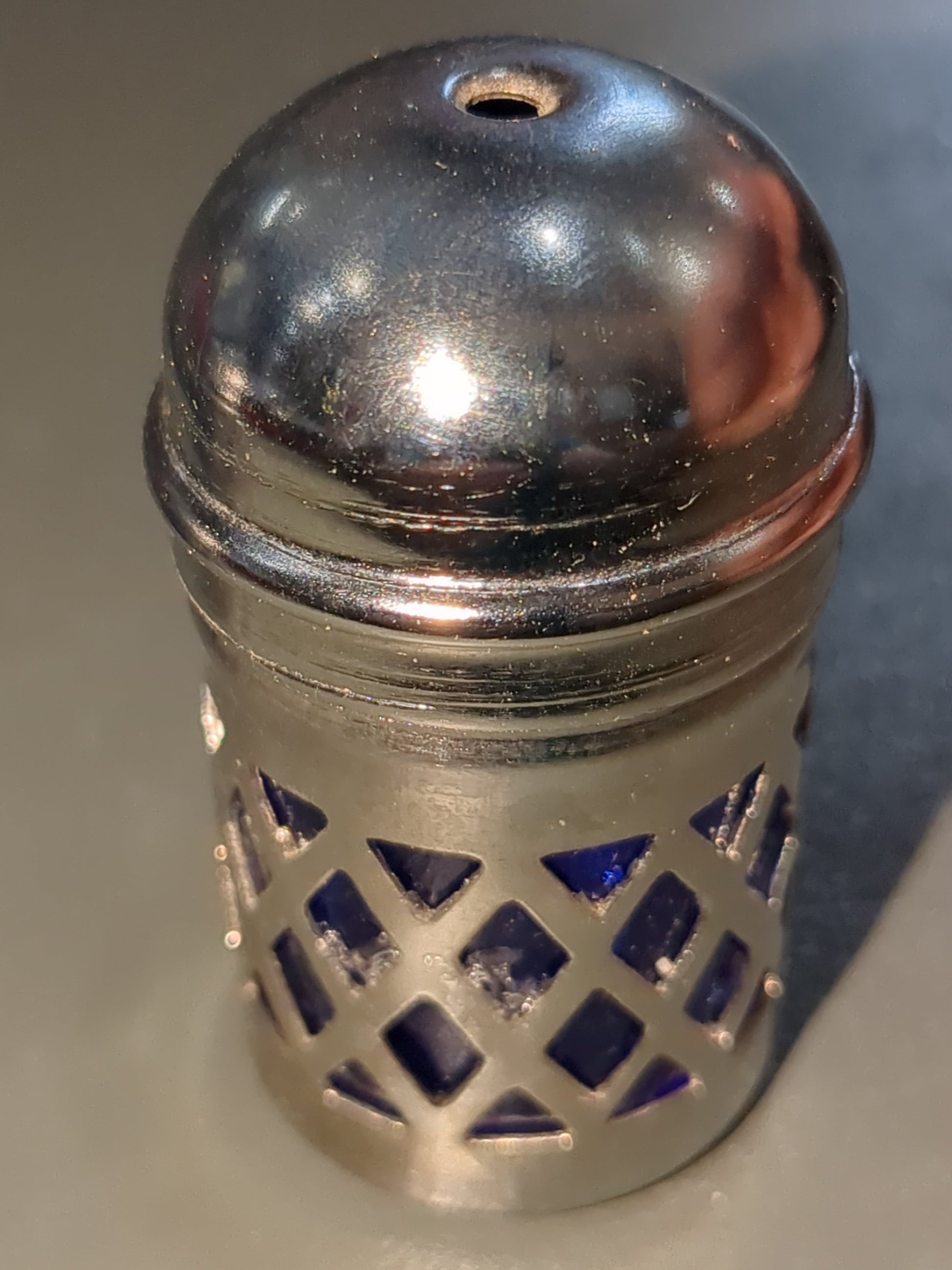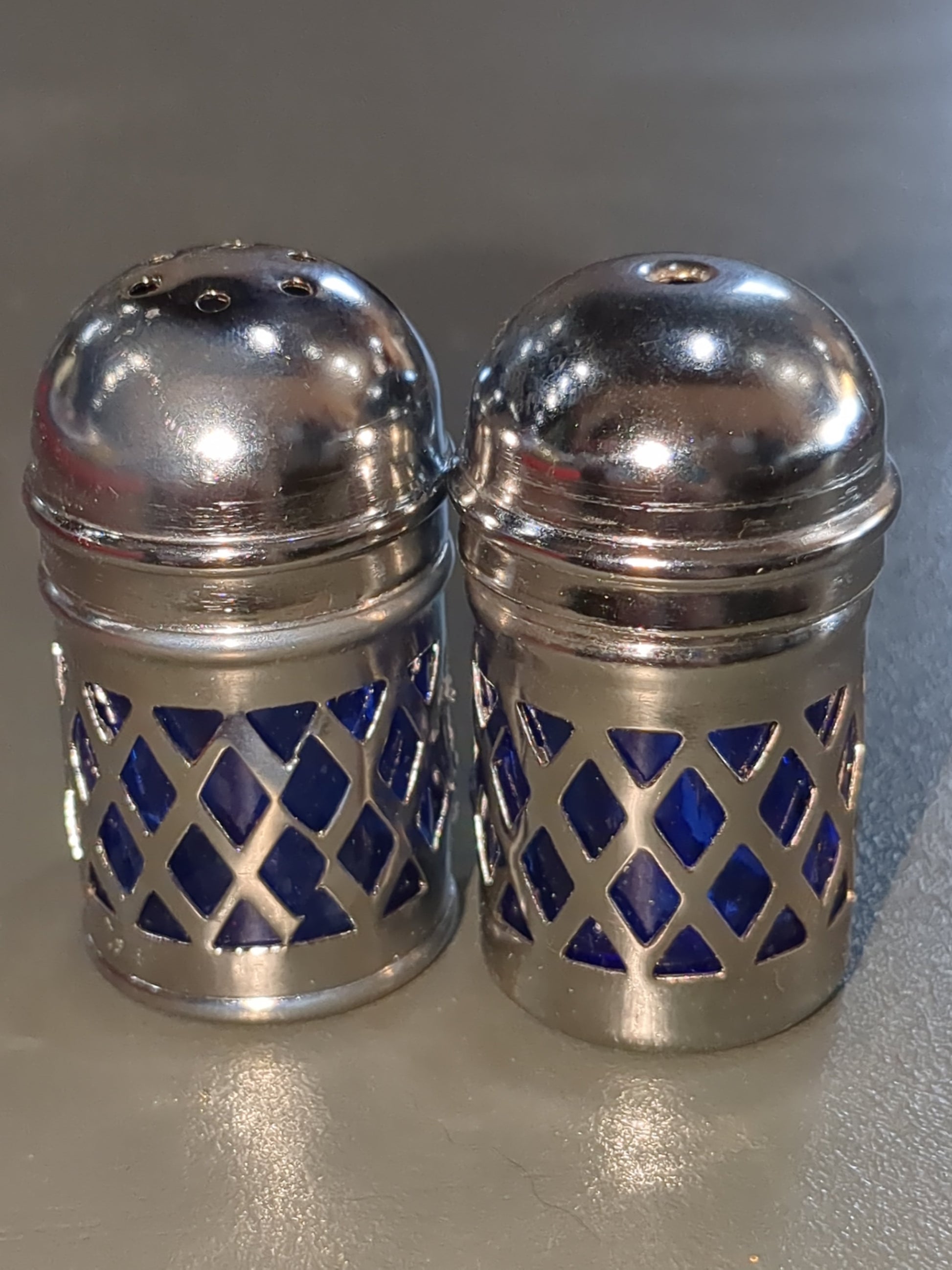 Silver and cobalt Blue glass and metal Lattice Salt and Pepper Shakers