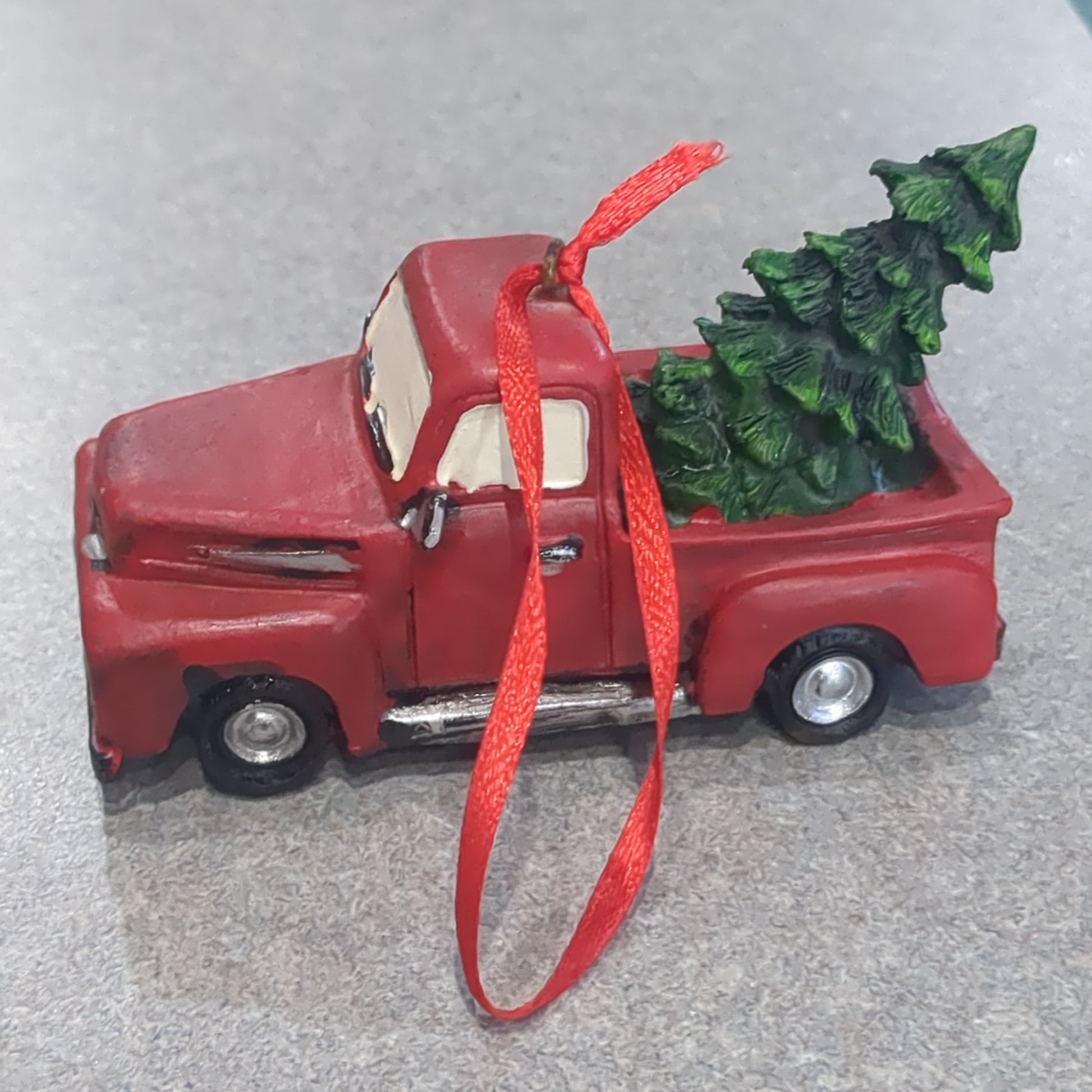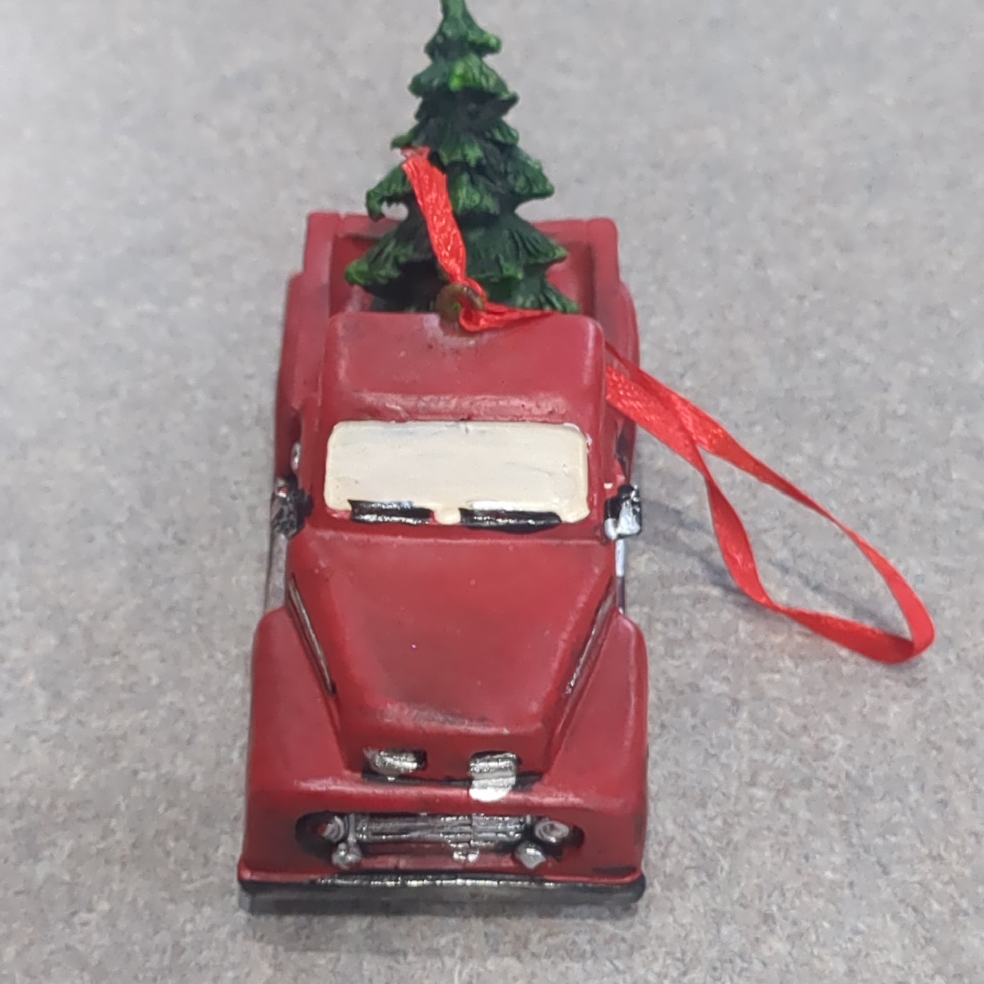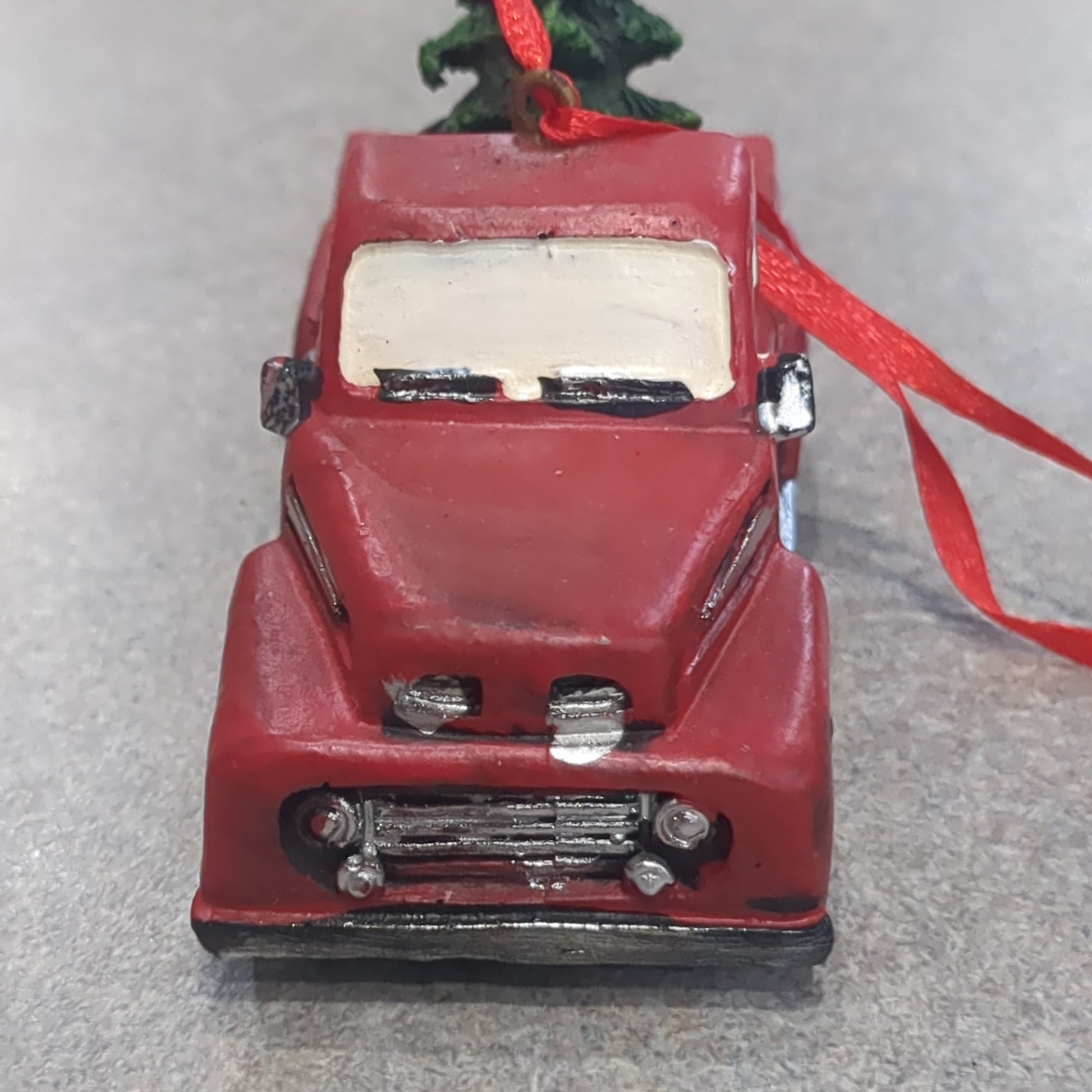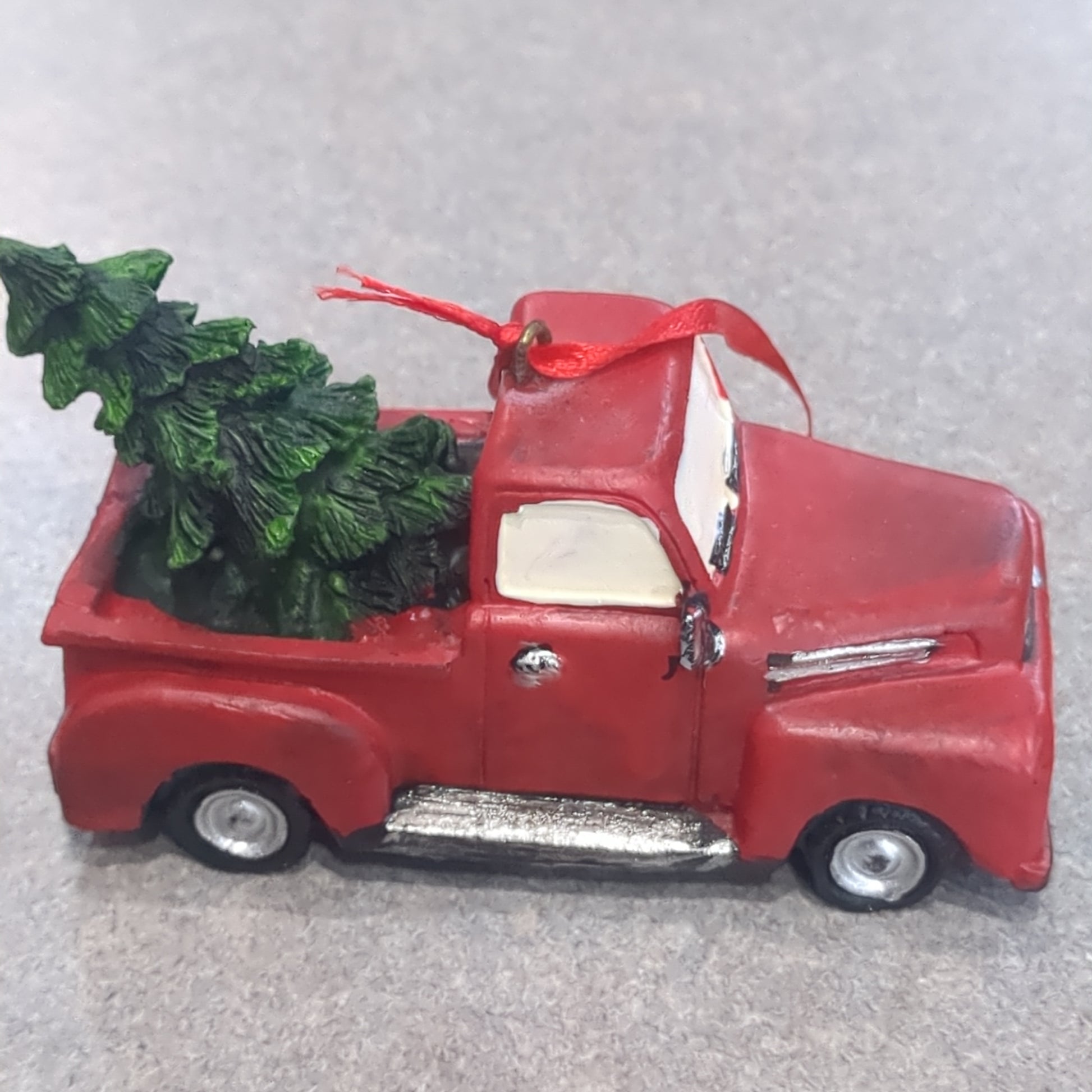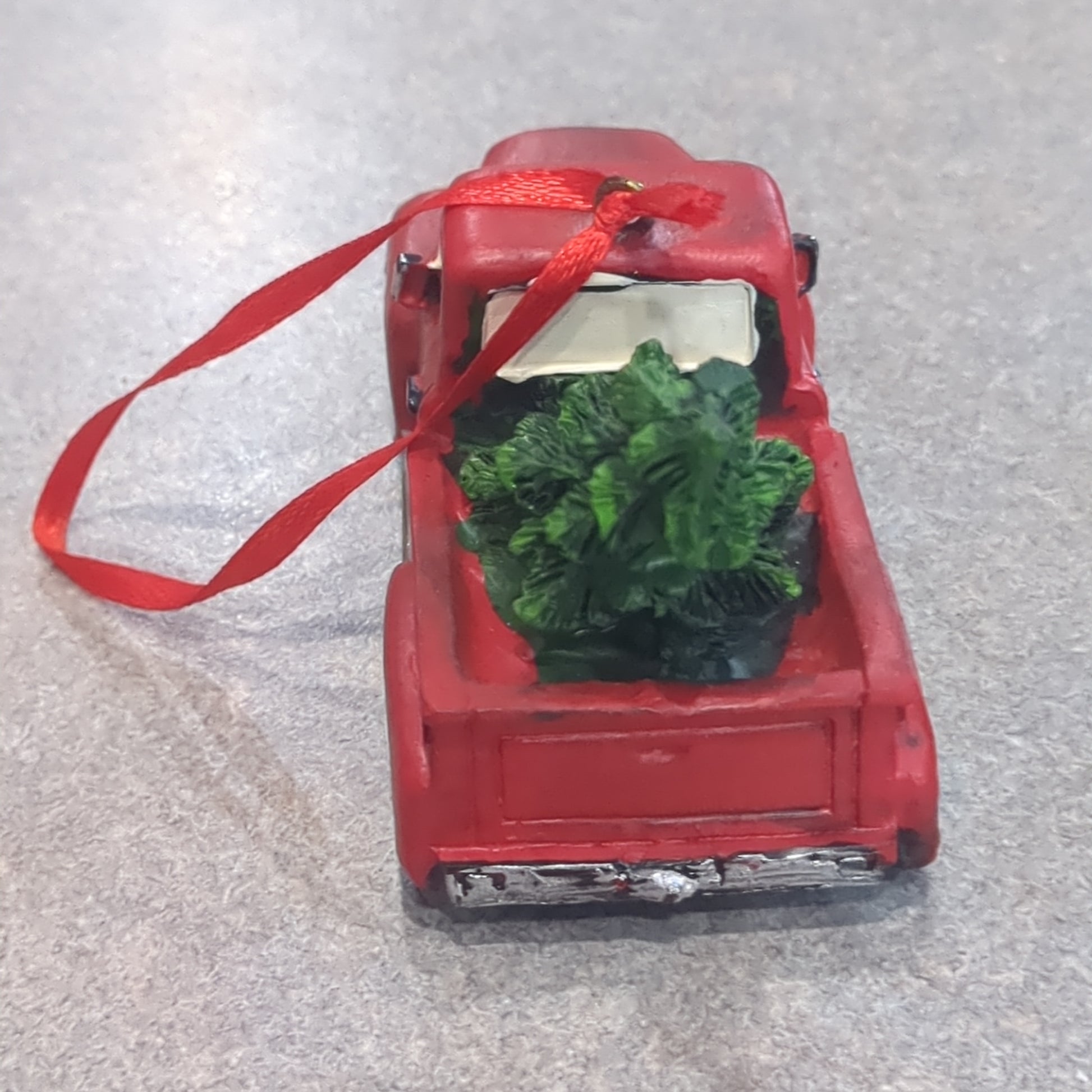 This is a red polycyclic truck for decor The wheels do not move it does have a Christmas tree in the back. does have a hook at the top of the cab if you wanted to hang it. 3.5 " long. 1.5" wide. 2" tall