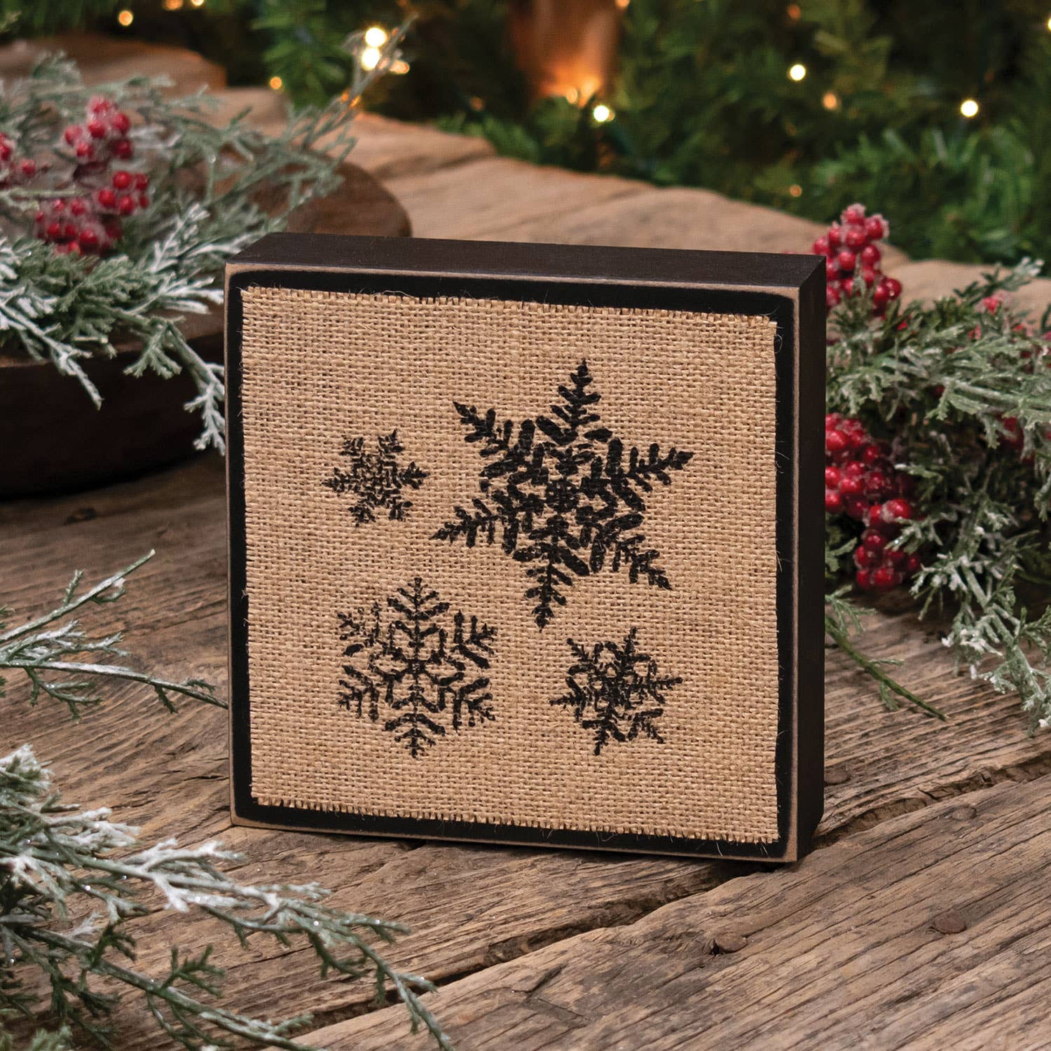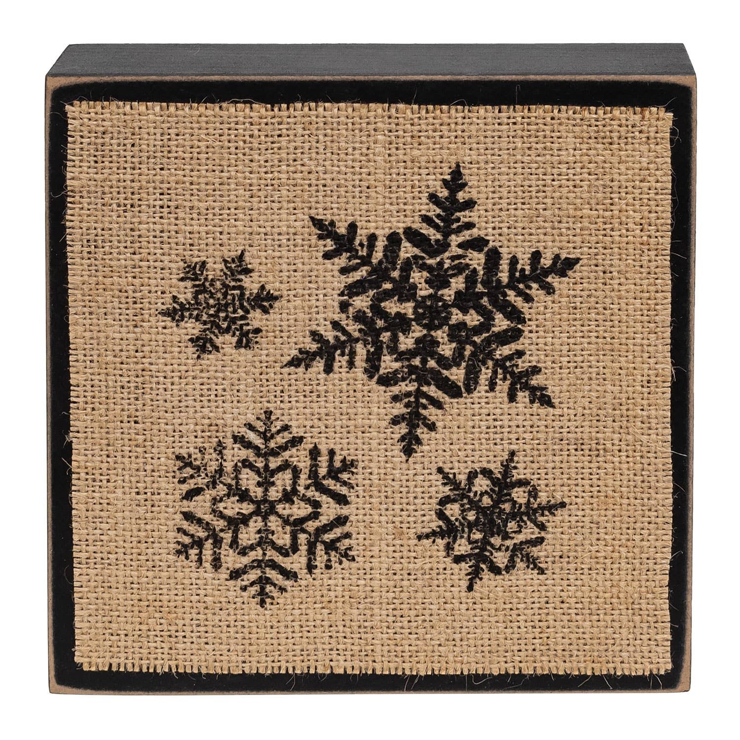 This box sign features snowflake artwork on a patch of burlap. The texture and natural color of the burlap material combined with the bold, black paint creates a striking piece of Winter farmhouse decor. This freestanding sign has distressed edges and measures 6" square and is 1.5" deep with an open back.