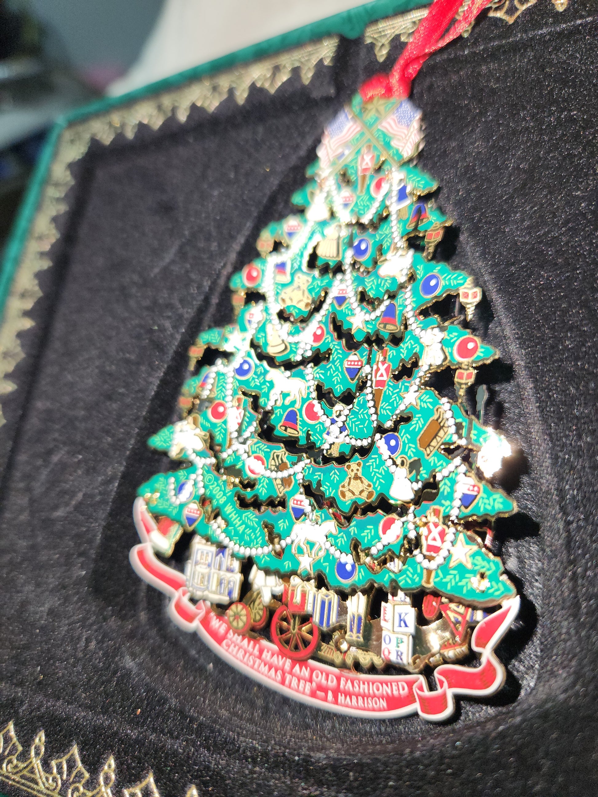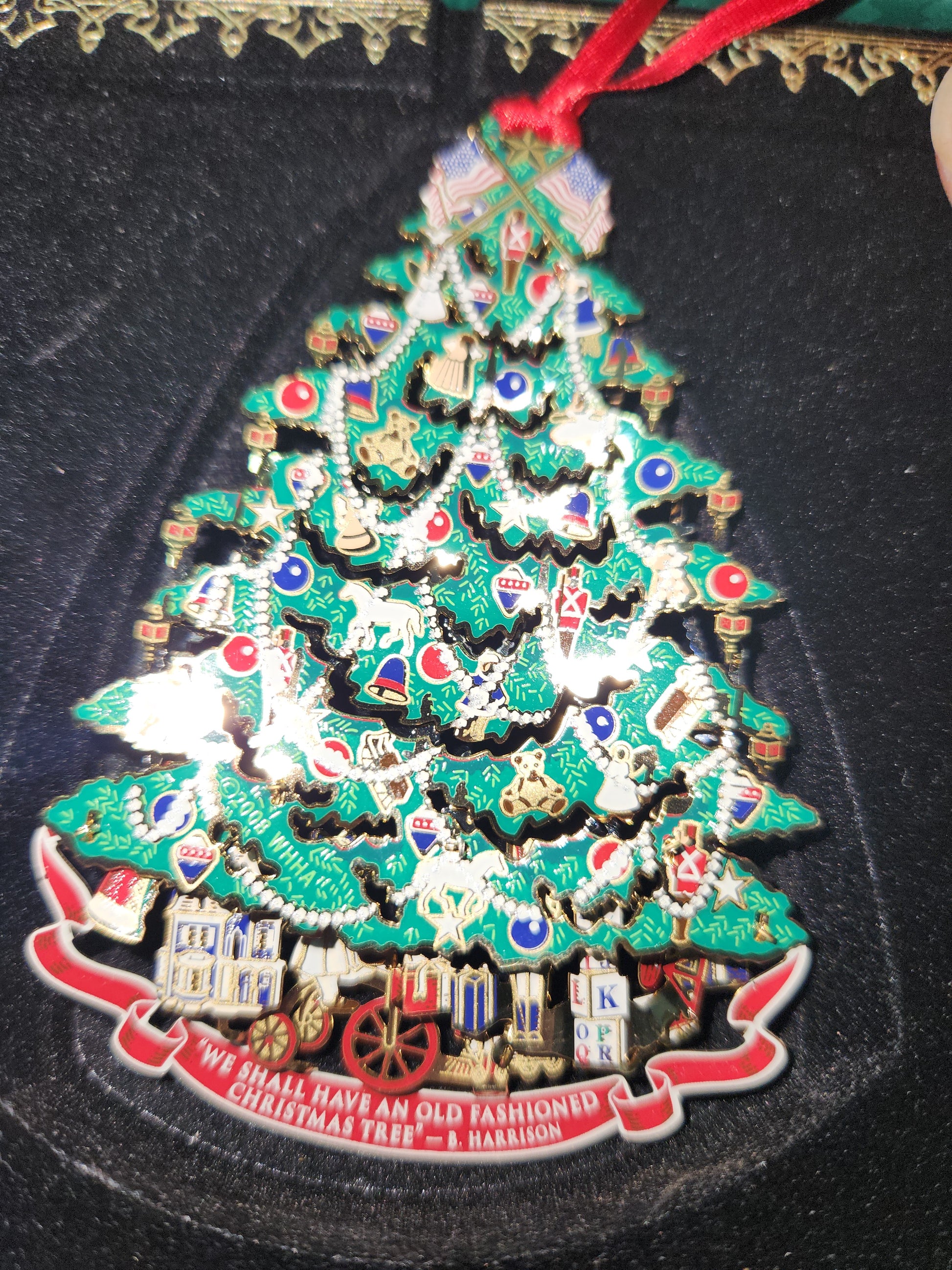 This is the annual white house historical association christmas ornament. It is beautiful and full of detail and is double sided. It is in new condition, I do not know if it was used or not. It has its original box, but it does have a spot of damage. Please see photos as they are part of the description. This ornamanet does have the little booklet President Grover Cleveland with info about his presidency.