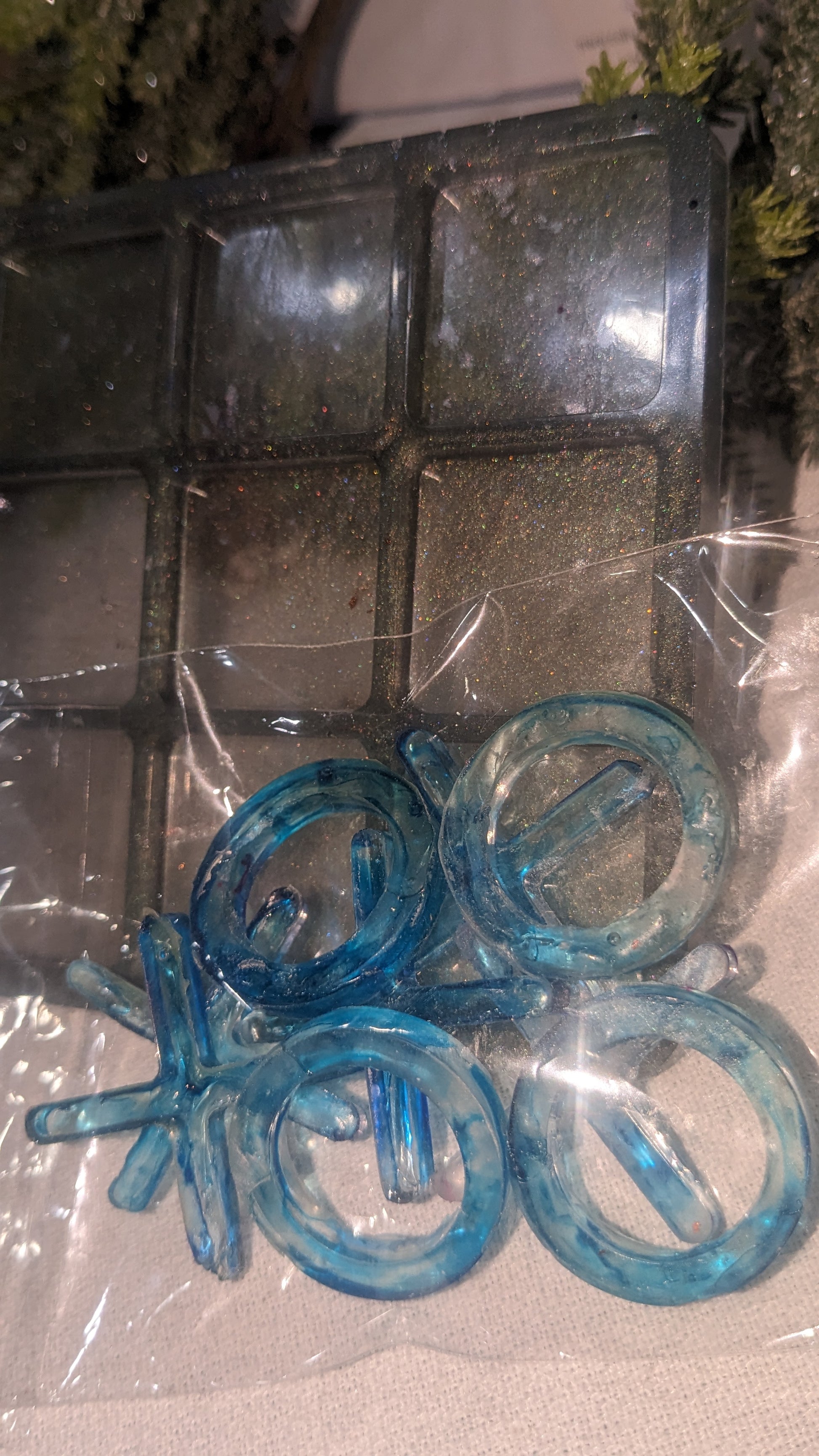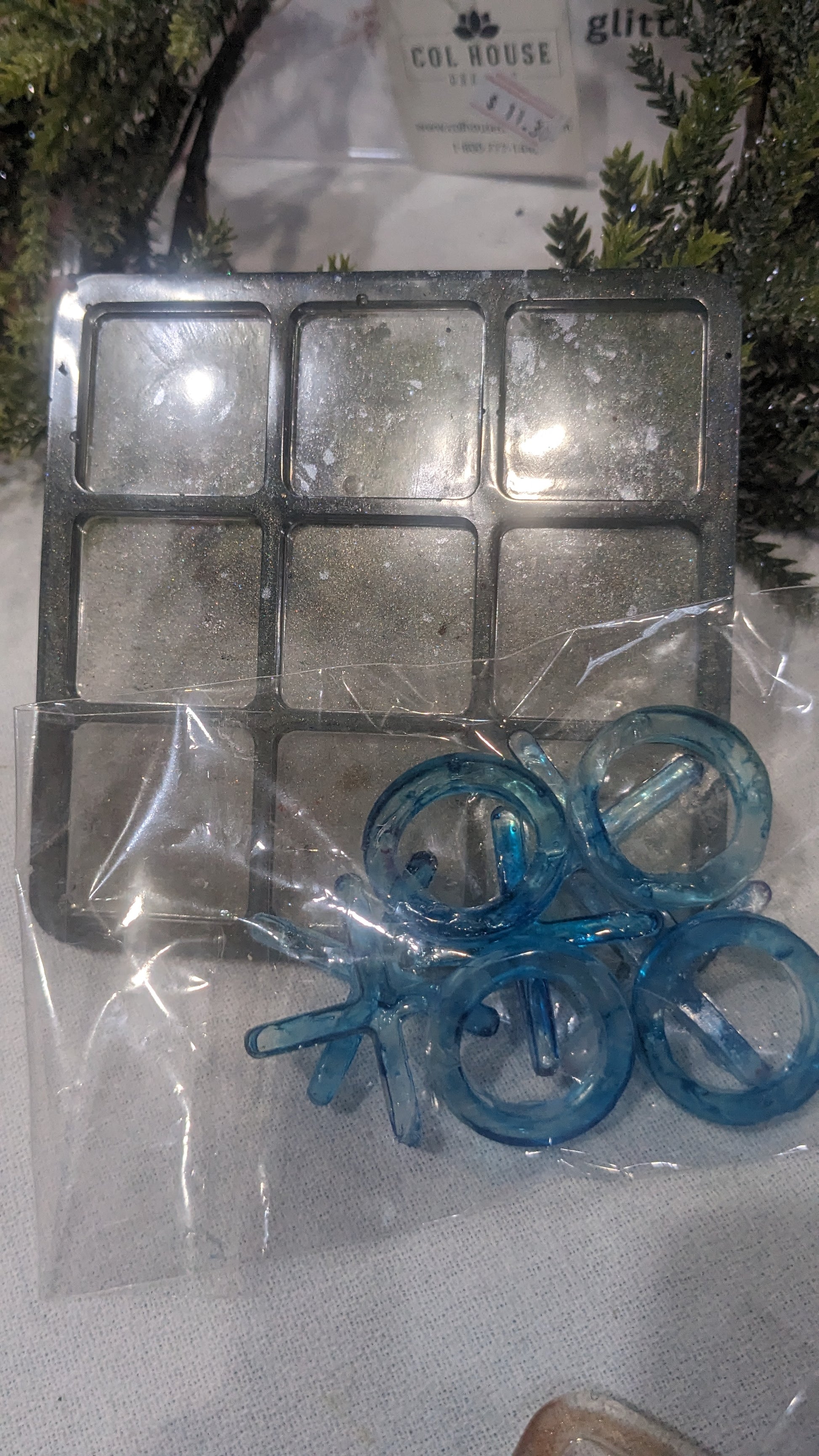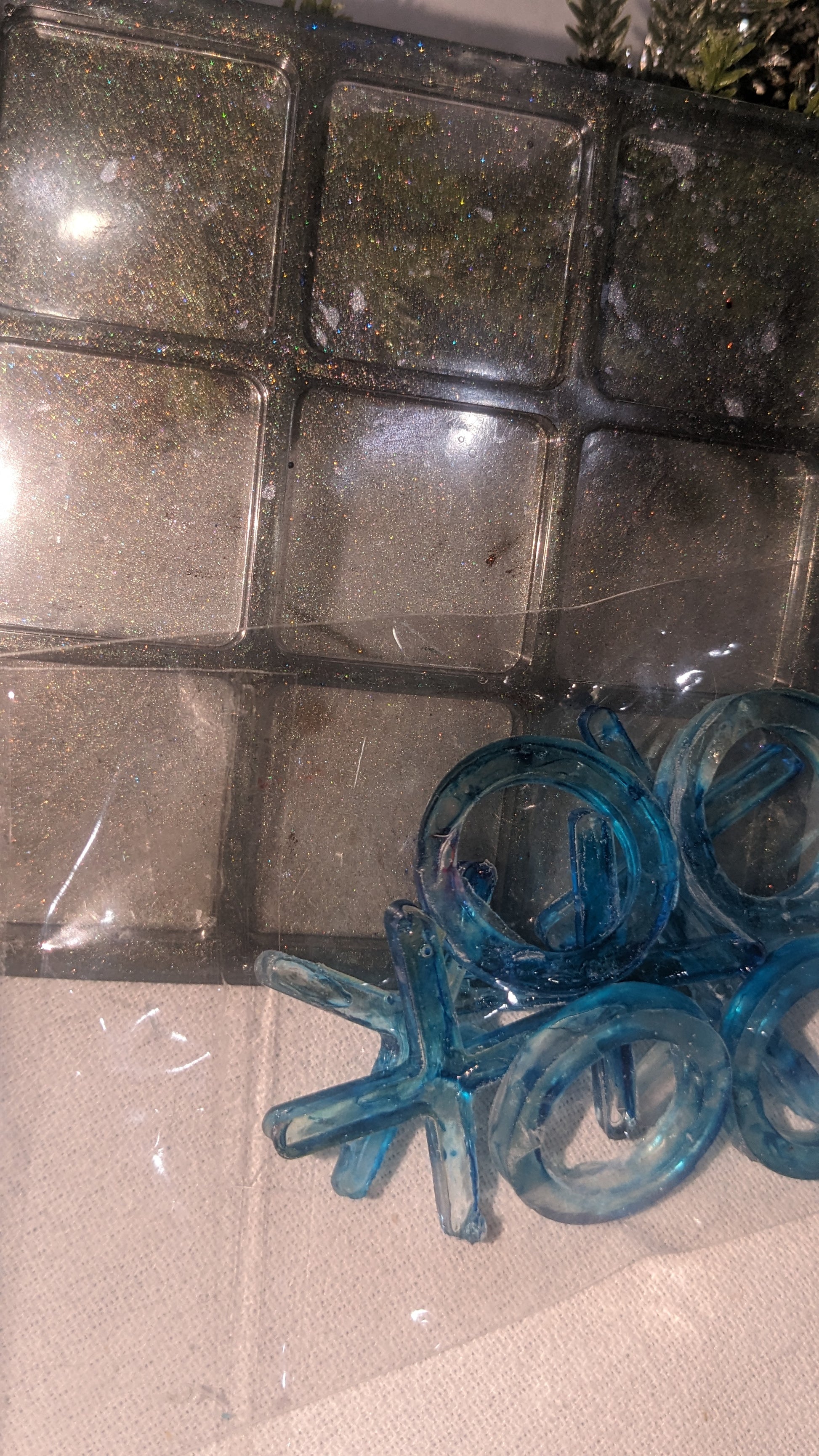 Tic-tac-toe board made from resin and mica powder or alcohol ink. Includes the pieces. It is a fun piece to sit on your coffee table, dining table, side table for a quick game with family or friend. It is made at the Cozy. Since it is handmade it may have small flaws