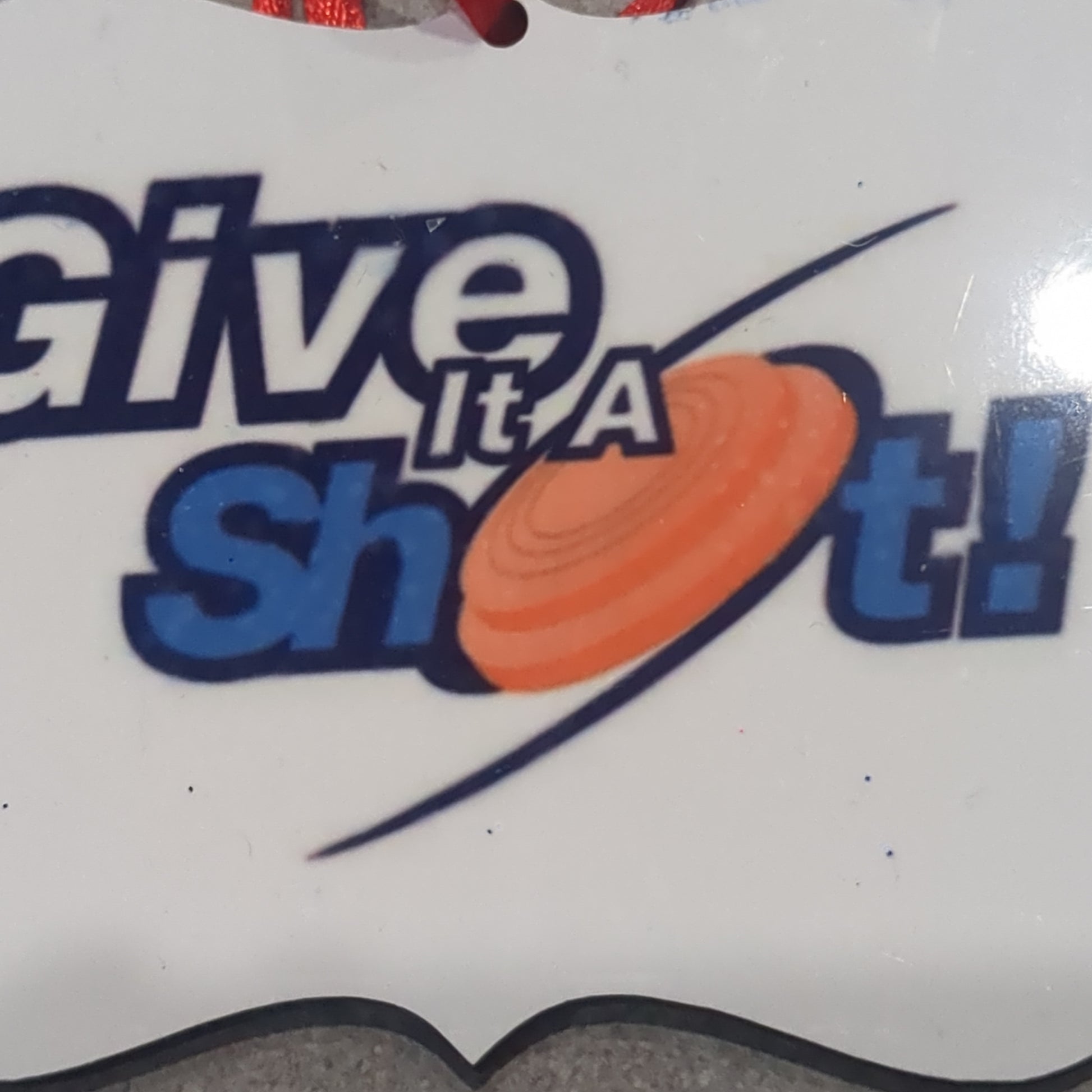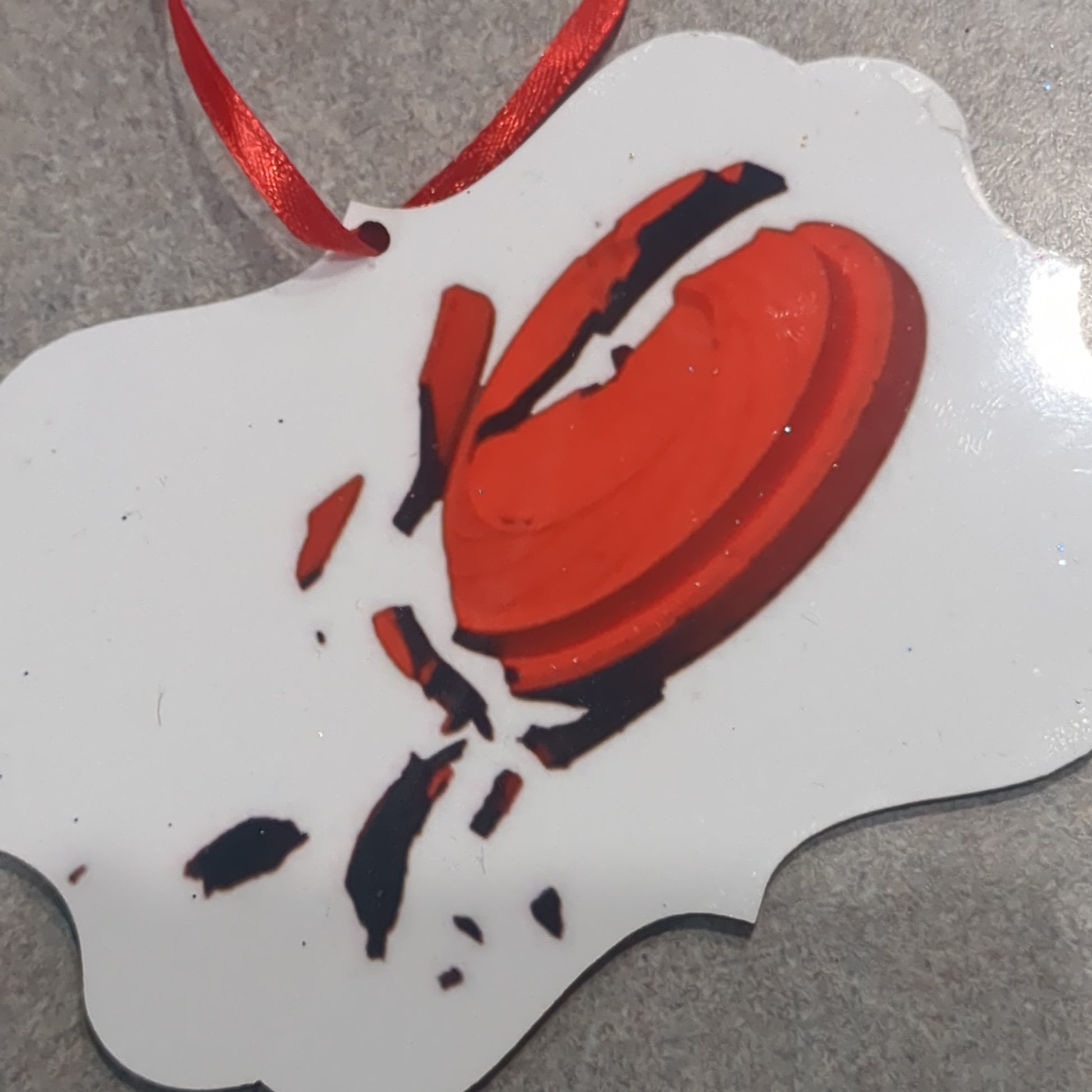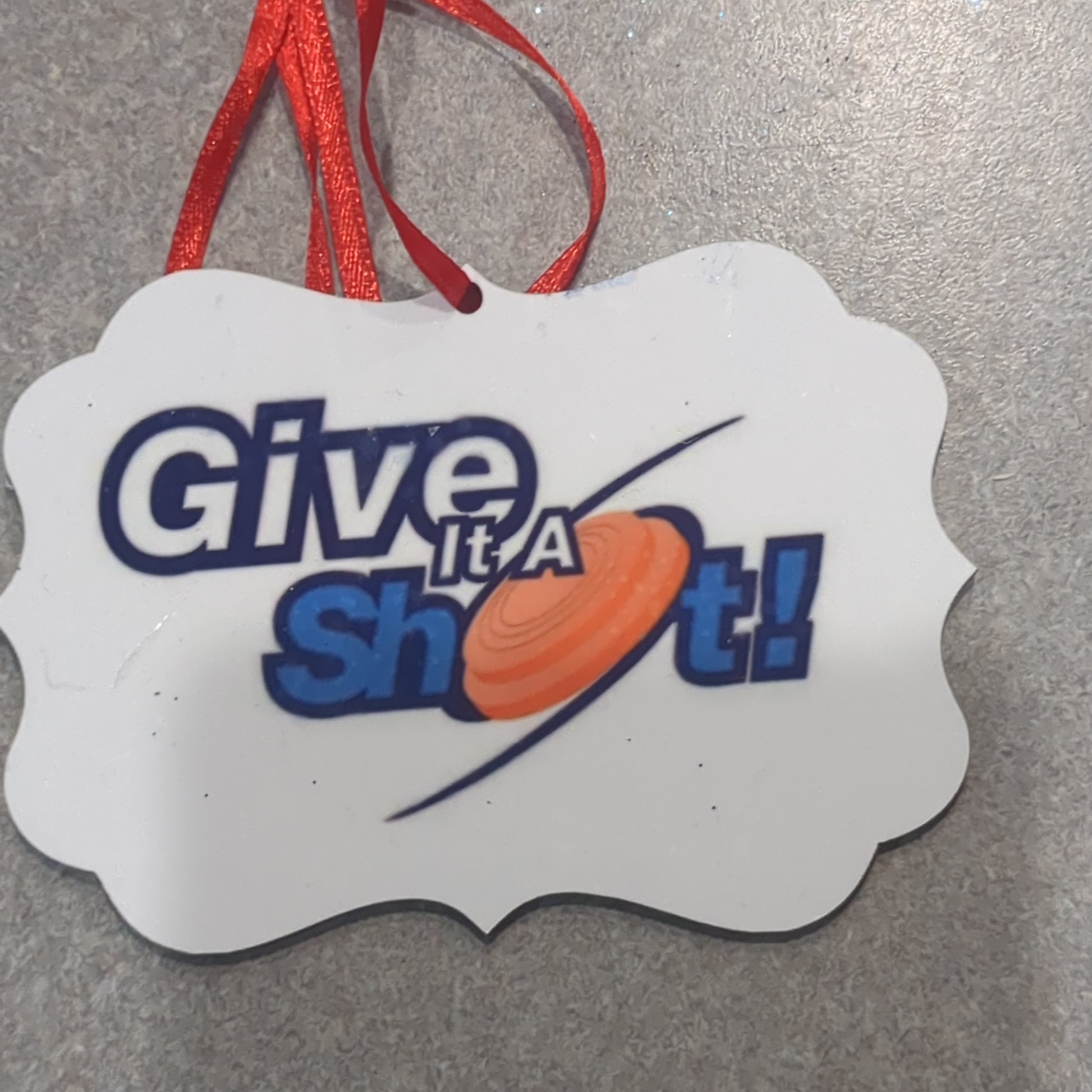 This is a 4-in by 2 and 1/2 in scalloped ornament double-sided one size says give a shot and the other is a broken clay
