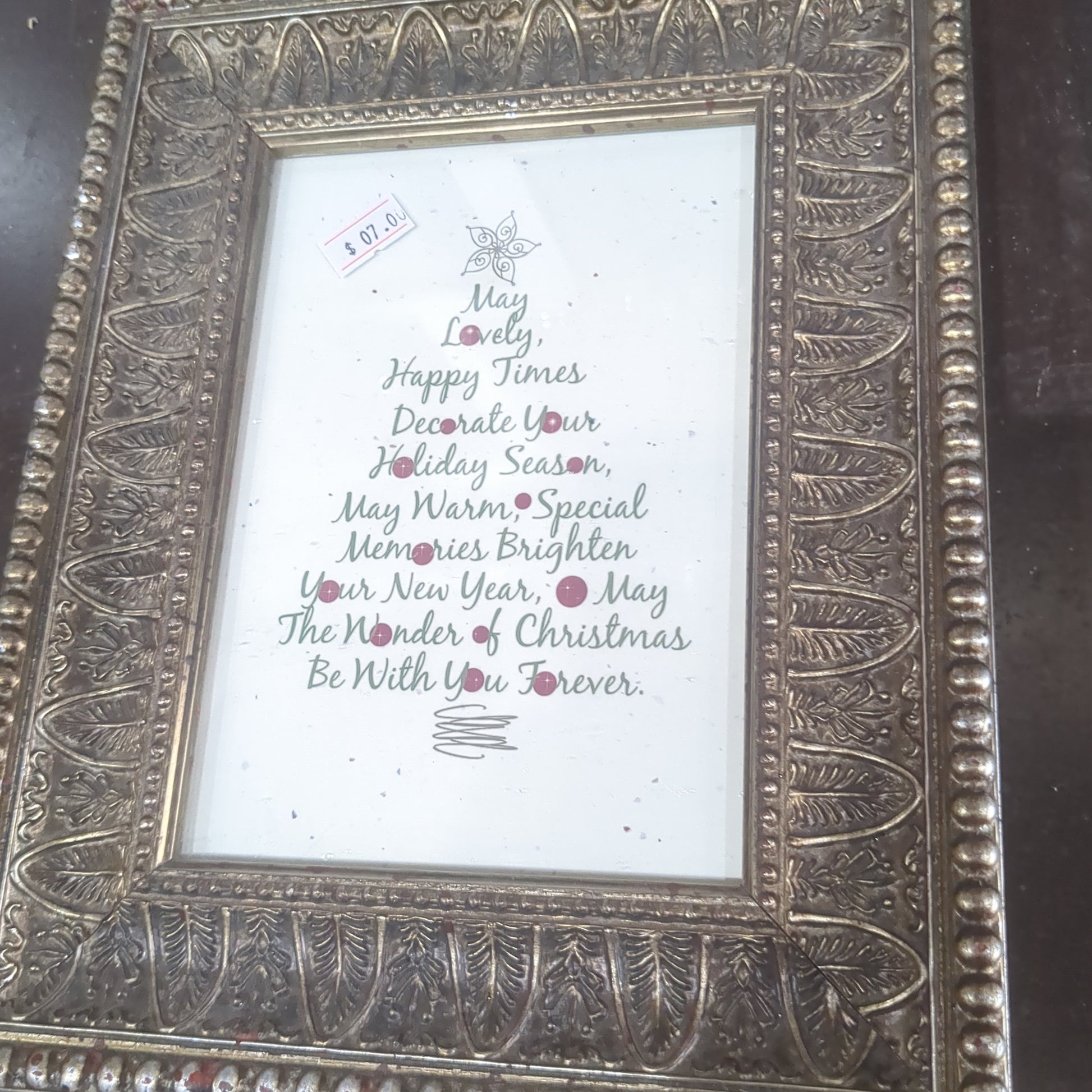 Unique decor item made at Cozy. Ornate 8 x 11 frame with 5 x 7 plaque with saying that says: May lovely happy times decorate your holiday season May warm, special memories brighten your new year, may they wonder of Christmas be with you forever.