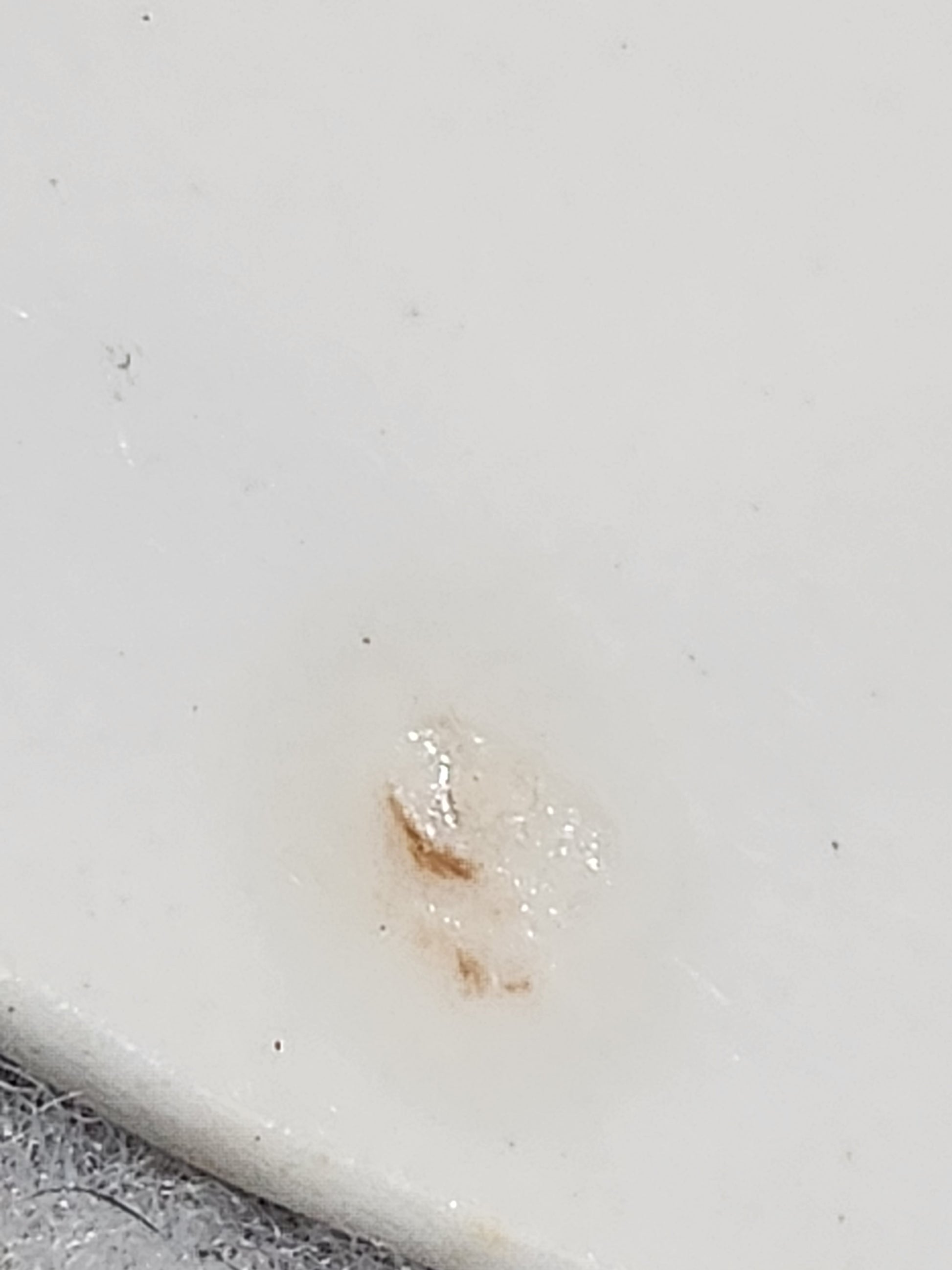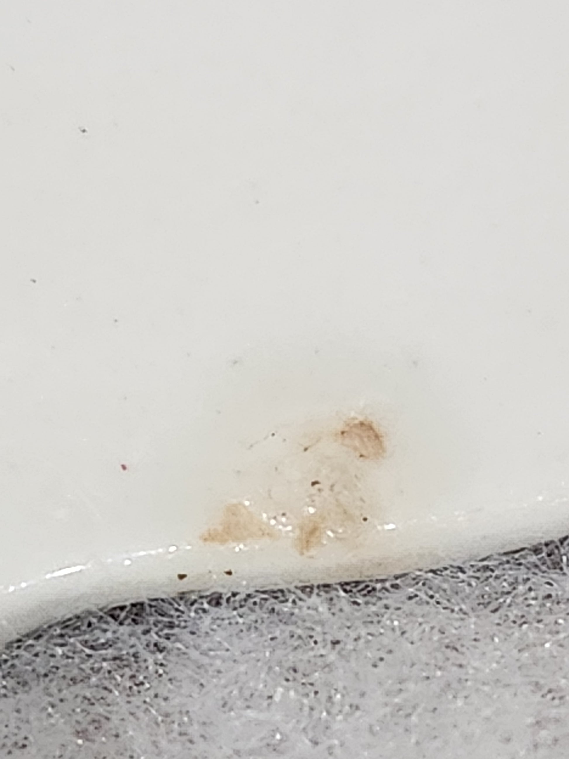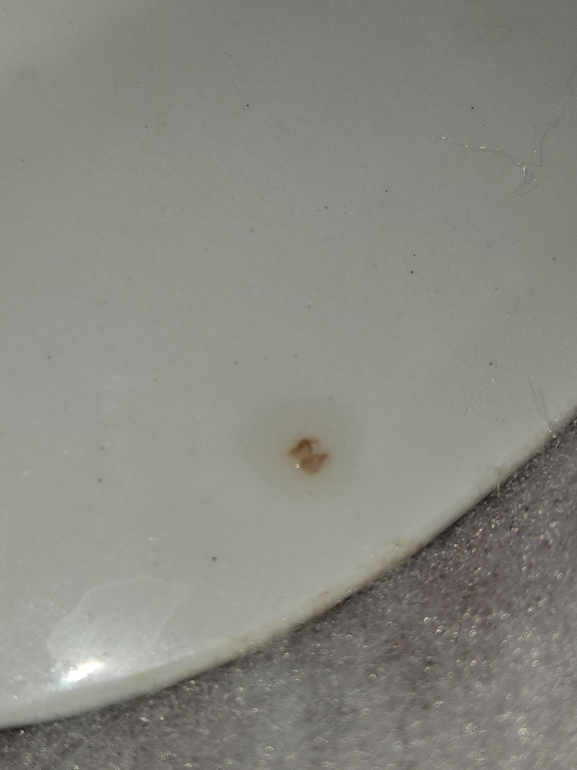 There is just a little bit of wear in the gold on the edge. There are 4 little spots on the back, that are odd, lmost feels like it was made during manufacturing, but could be chips. Please see photos as they are part of the description.