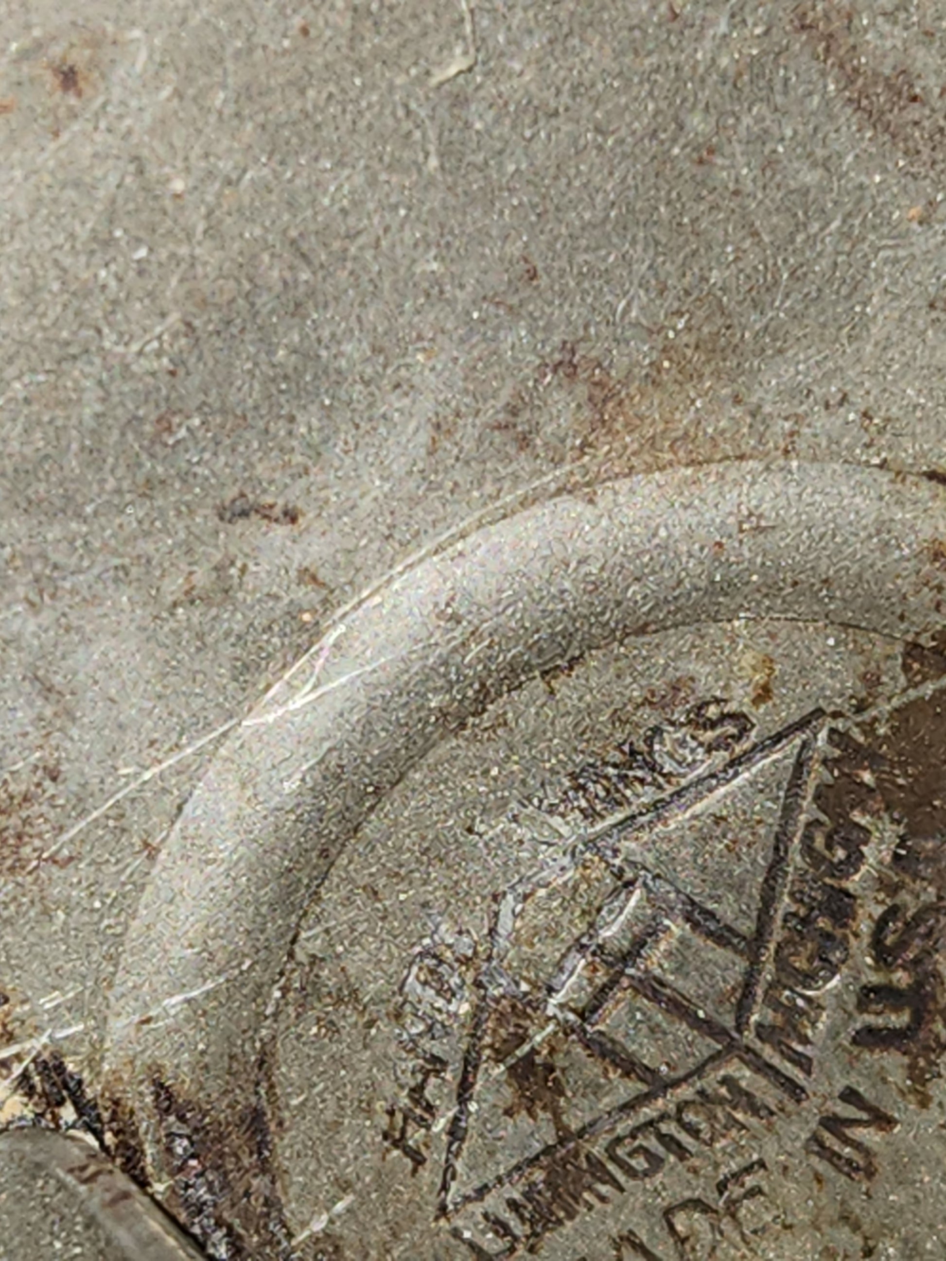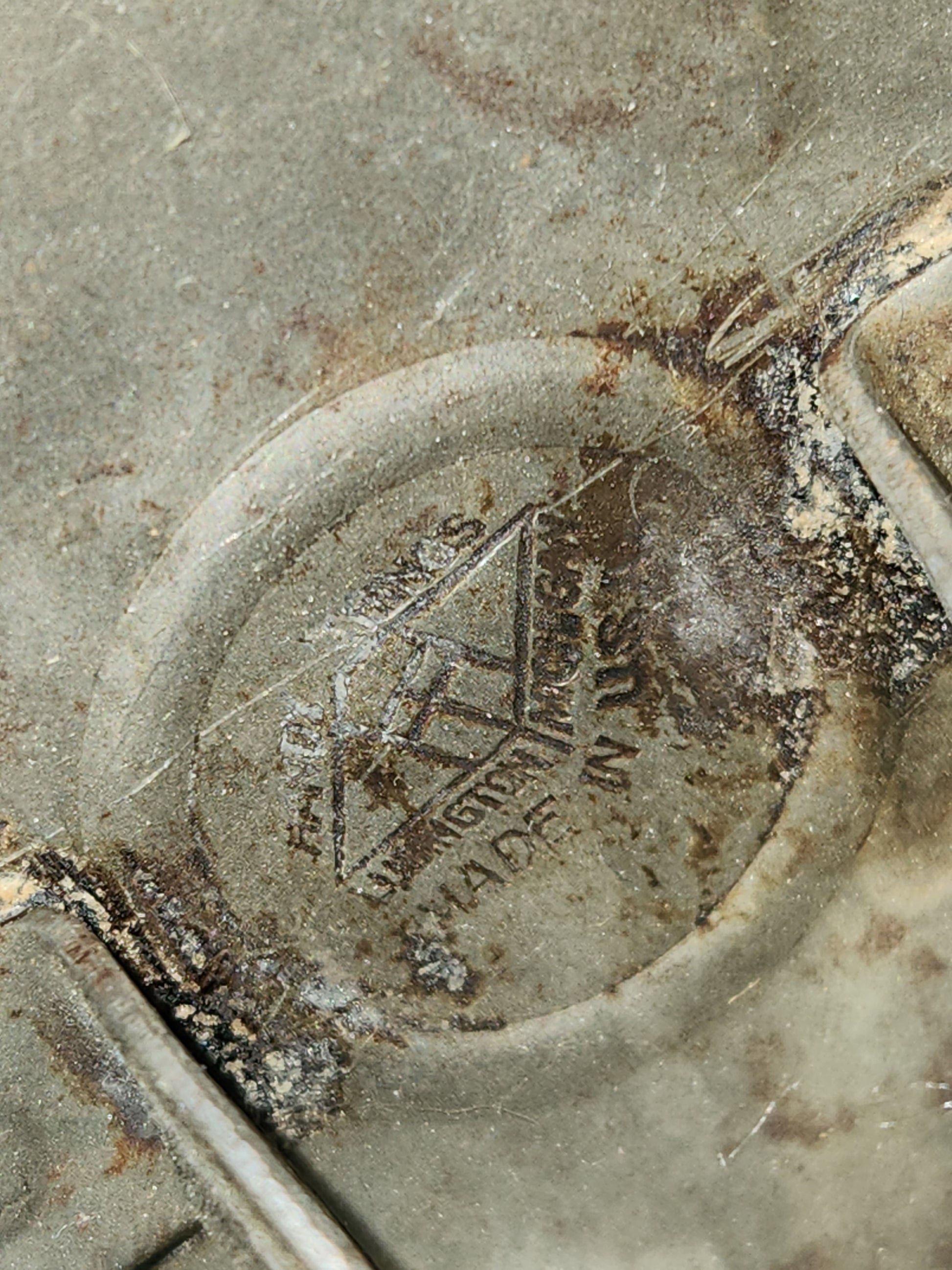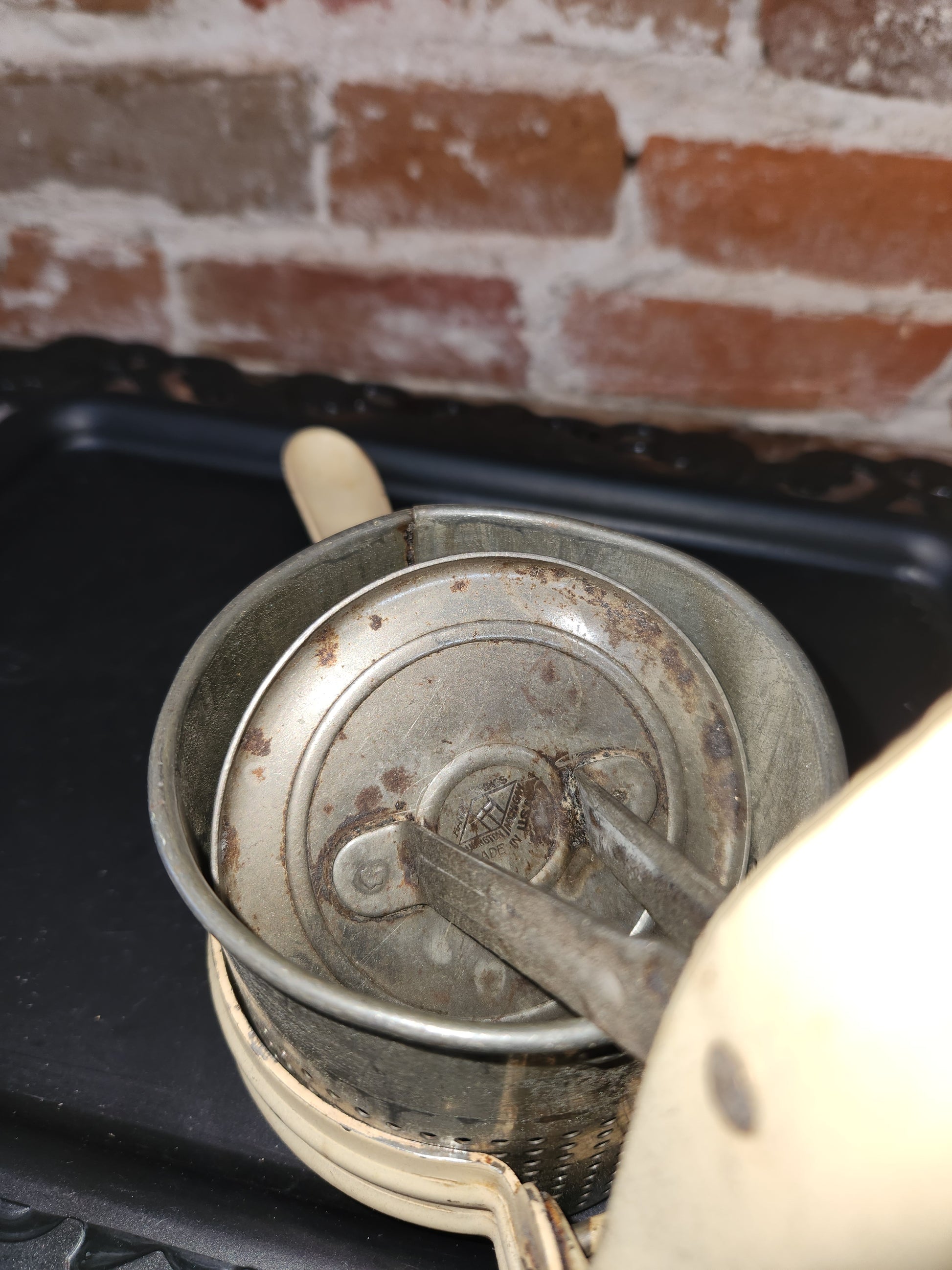 This vintage tan handle potato ricer has Maker's Mark Handy Things on top on a diamond Lundington Michigan below and made in USA below that. it has some paint loss but I feel that just adds to the character. It is 11" long and 3 1/2" diameter. it's really cool piece. Please see photos as they are part of the description