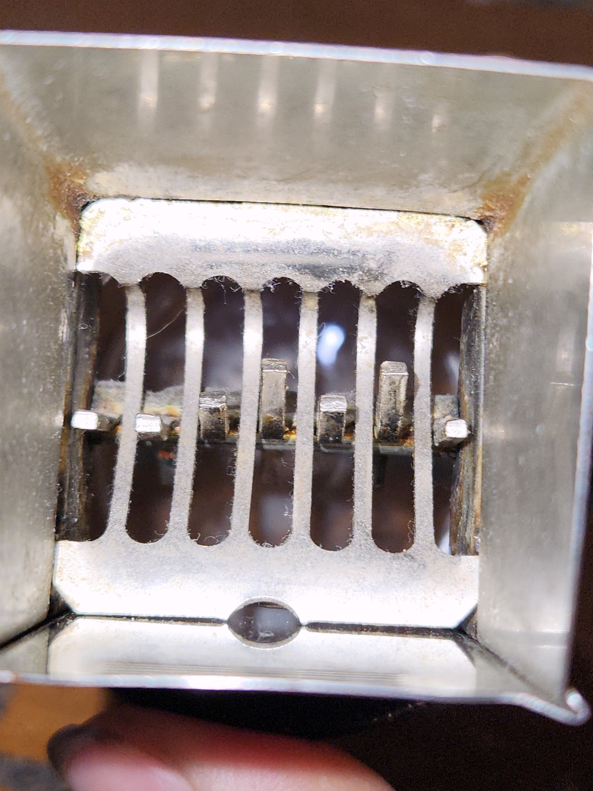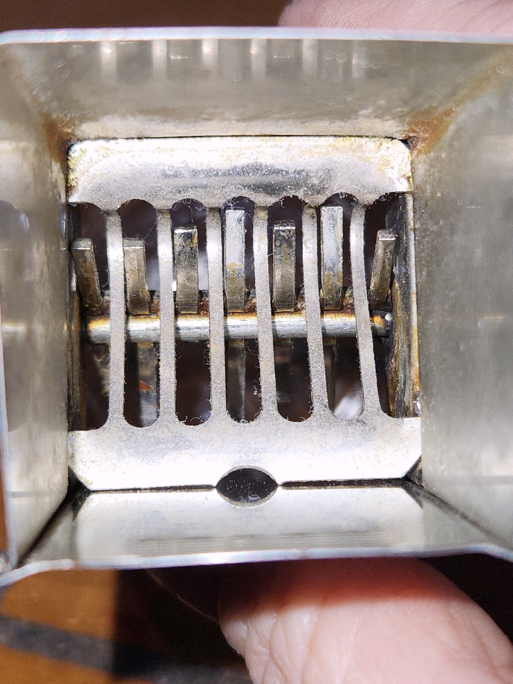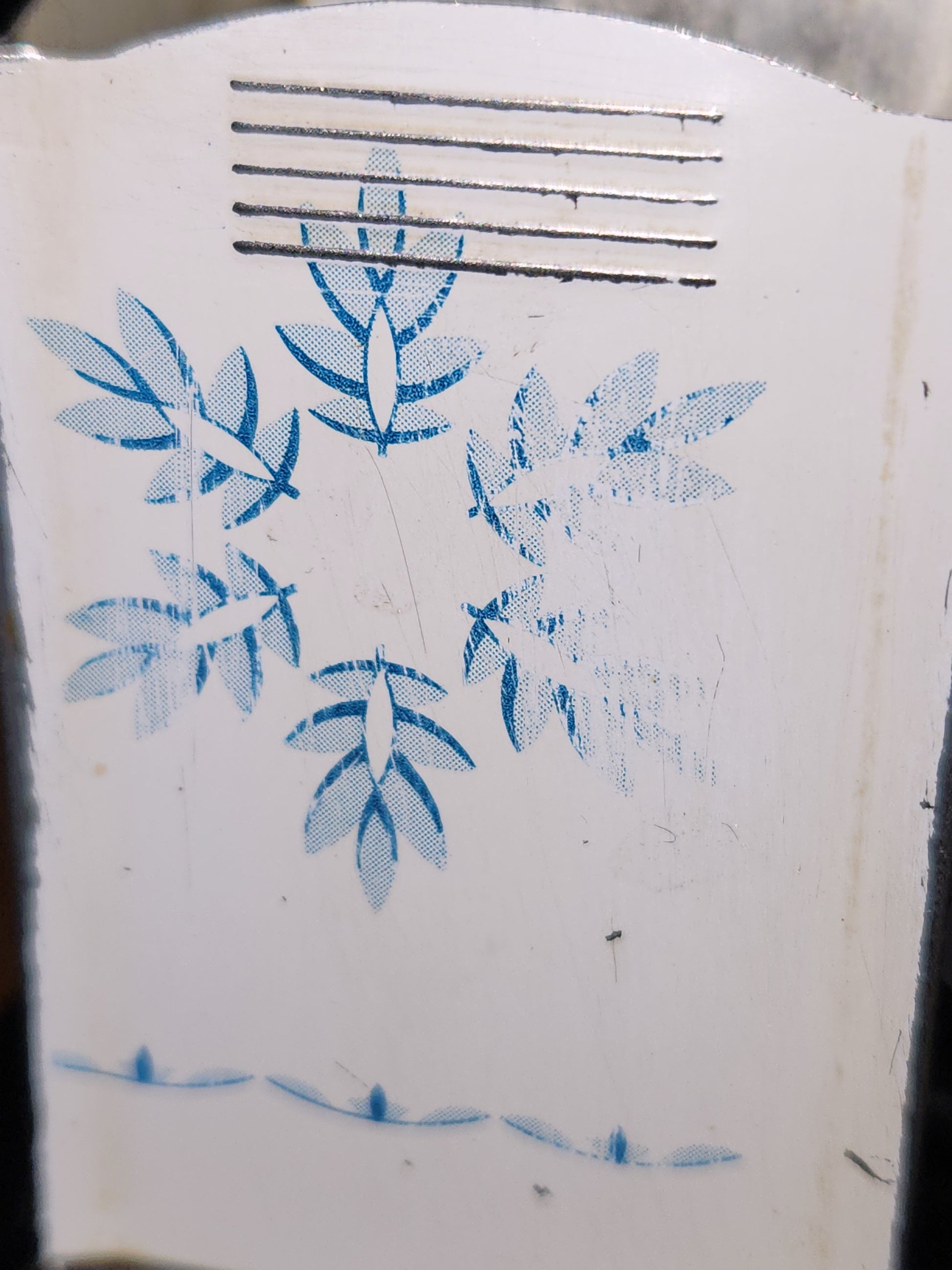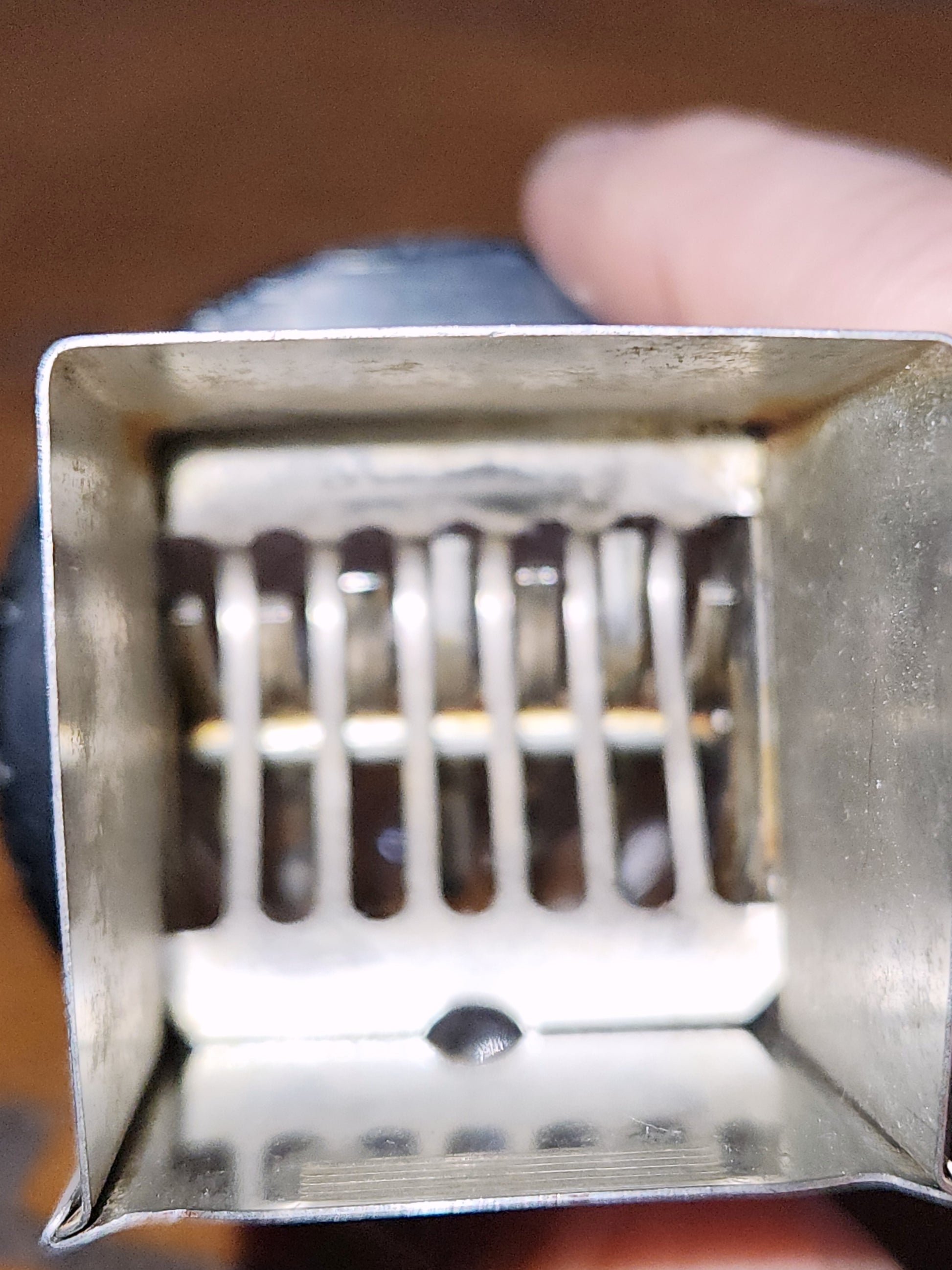 This grinder is in vintage condition. Some of the tines are slightly bent. Some of the images have faded or scratched. Glass is in good condition. Please see all photos as they are part of the descrption.