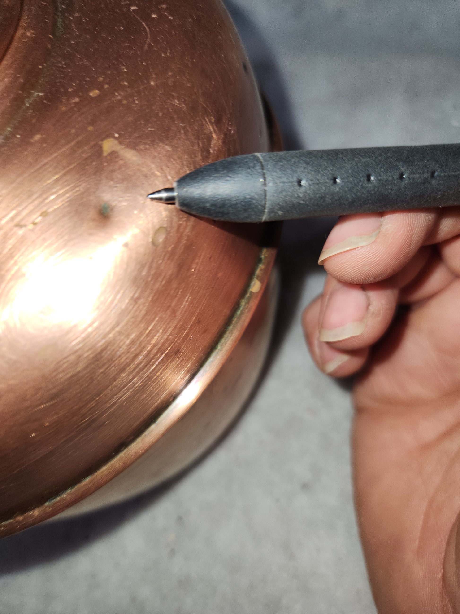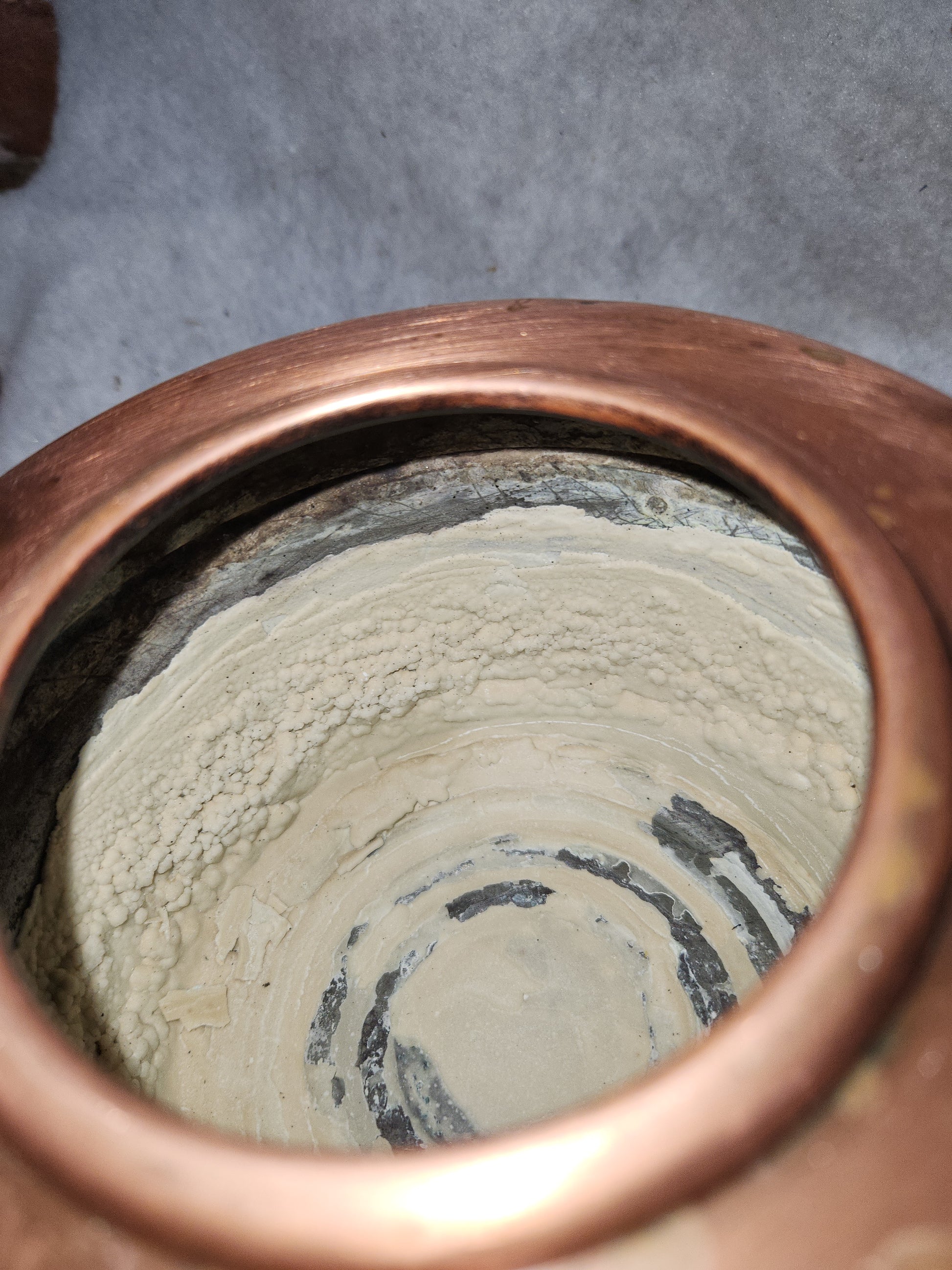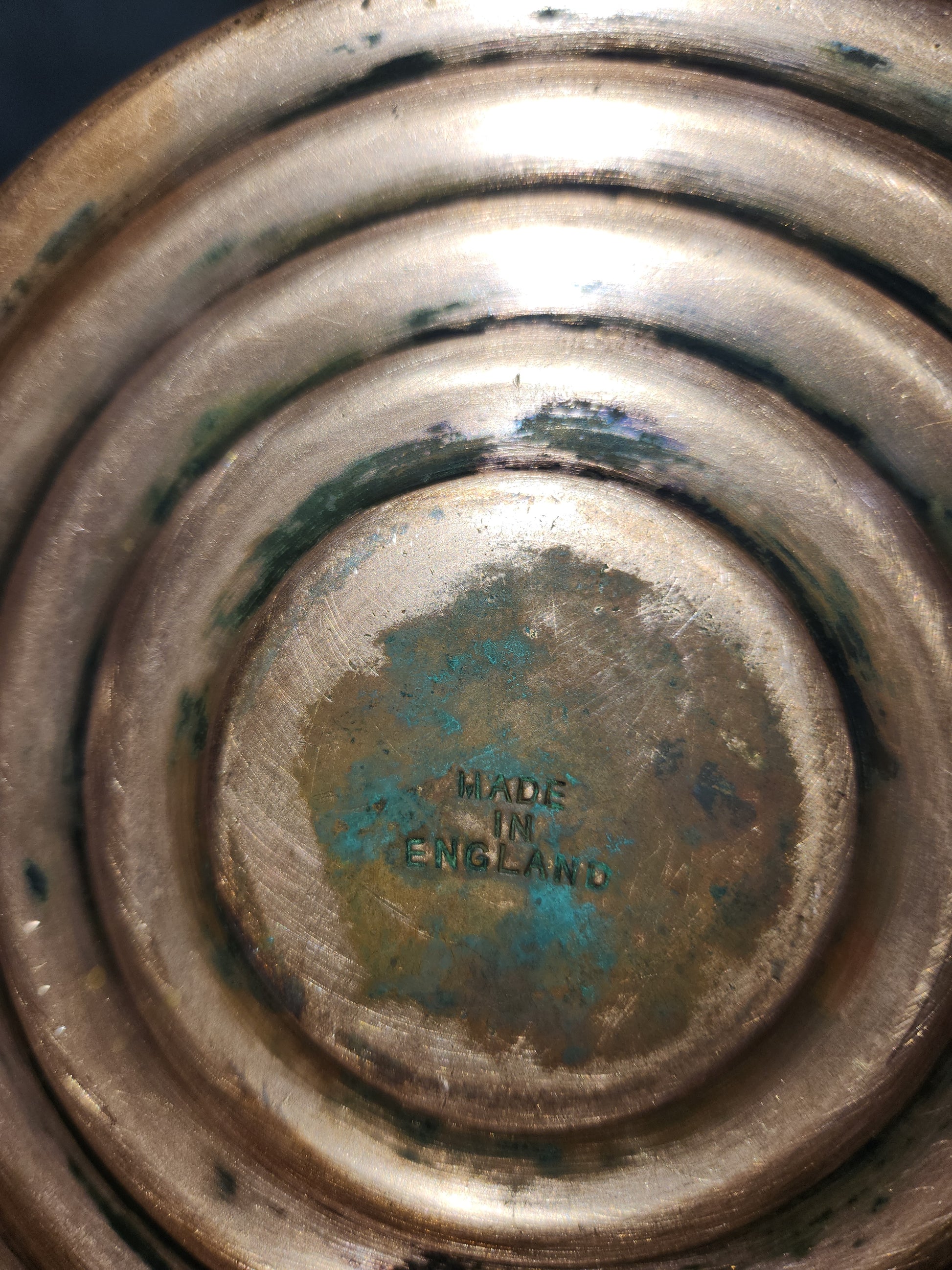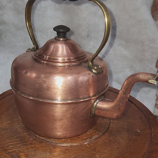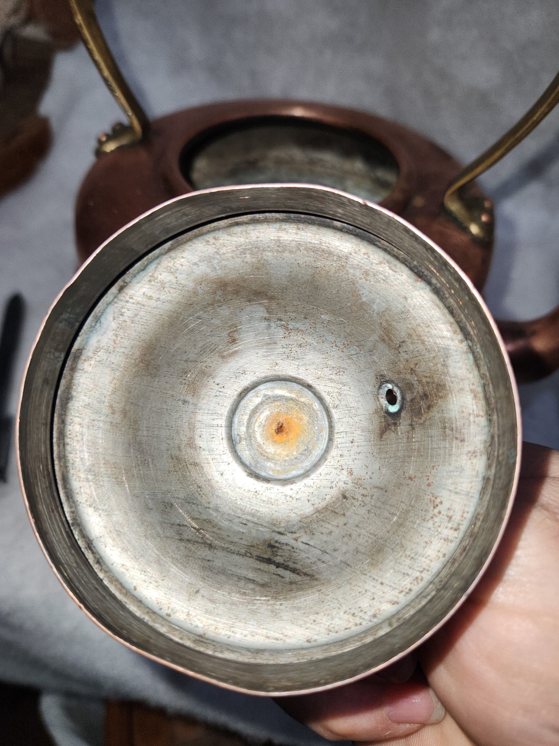 This tea pot is beautiful, it has many areas of discoloration. It has one bigger dent and at least 4 pit style "dents" The lid is bent inside rim that goes in the kettle. Major amount of hard water deposits inside. The bottom is solid and stamped with made in England. Despite these flaws it is beautiful and would be perfect for decorating a vintage kitchen or farmhouse. This would look stunning on an old wood stove. Please look carefully at all the images.