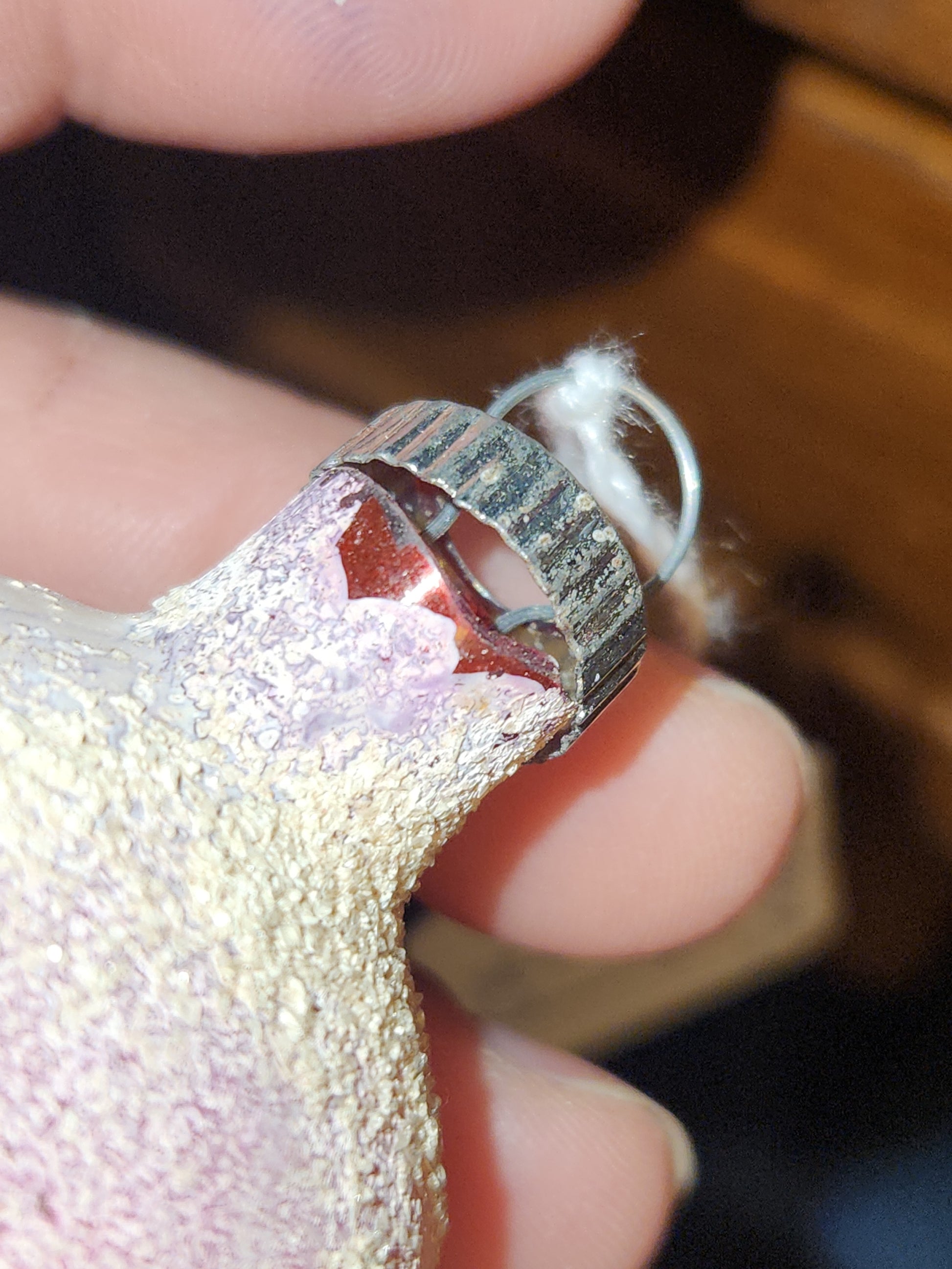 This ornamanet is 1 3/4" It has a cap that says Shiny Brite Made in USA. It has some areas of discoloration. There is a rounded chip at the mouth. There are no cracks or chips beyond that. It glows an orange pink glows under uv light. When buying vintage ornaments you are getting and old glass ornamanet it could have chips at the mouth, crazing, crackling, paintloss, and loss of mica. Please understand that before buying. Please see photos as they are part of the description
