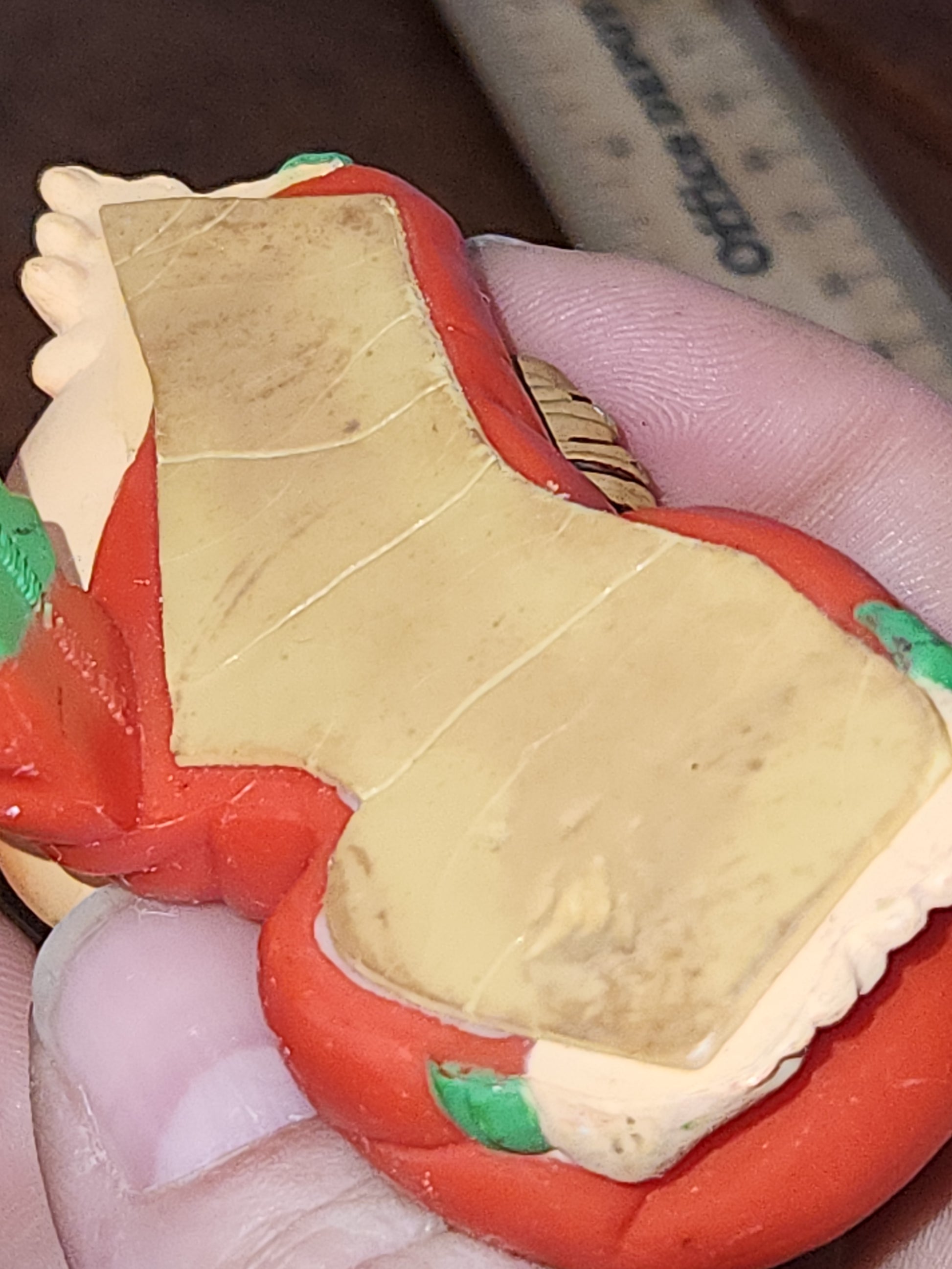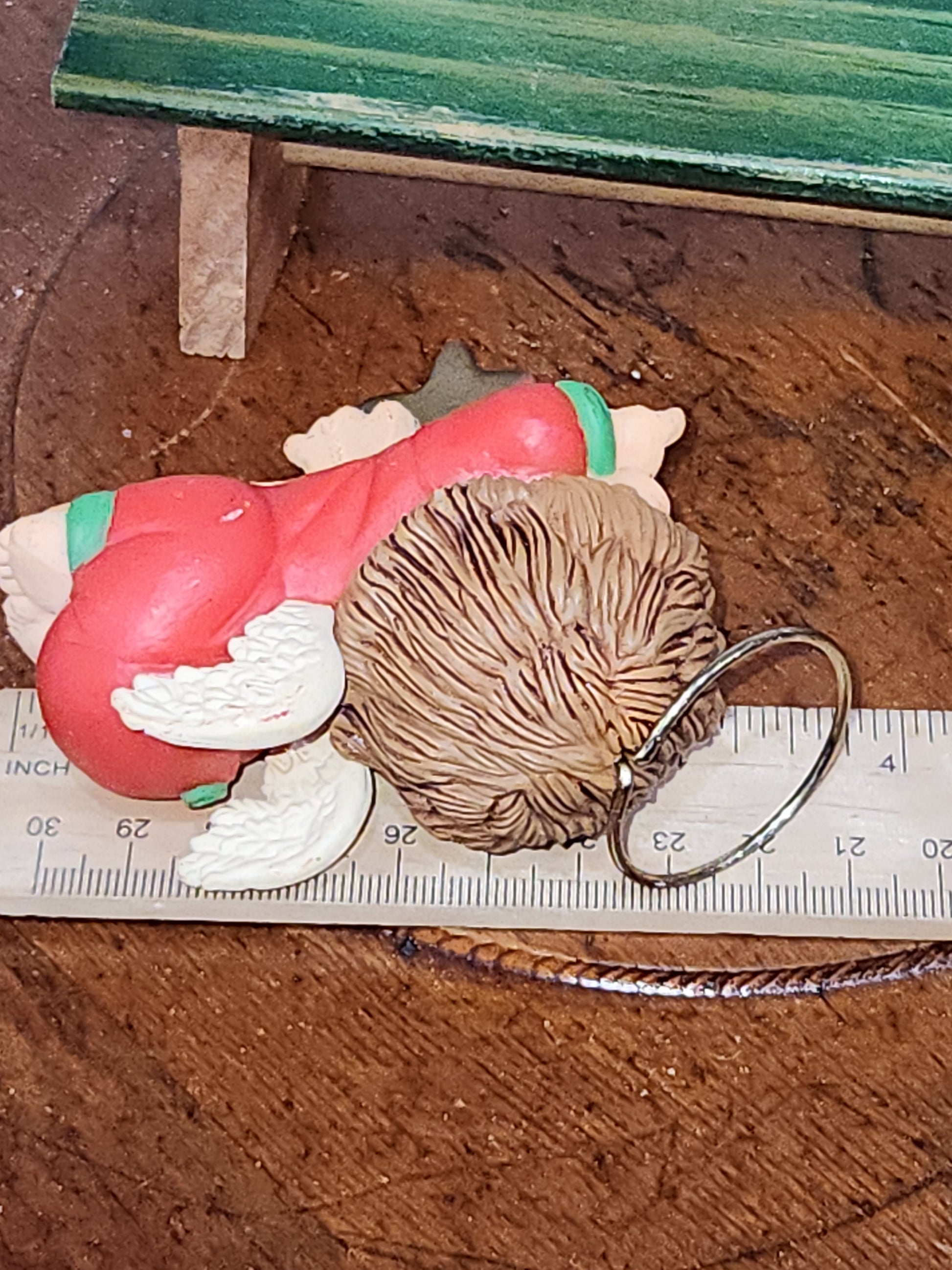 This Stocking holder is made in 1984 by Hallmark. Cute angel. It is 3 3/4" from star to top of head. 3 3/4" from toes to tip of halo. He is in good condition. He does have a little paint loss on his gold star. He has some scratches or dirty marks on his face, I was enable to get off with a wipe. please see the photos