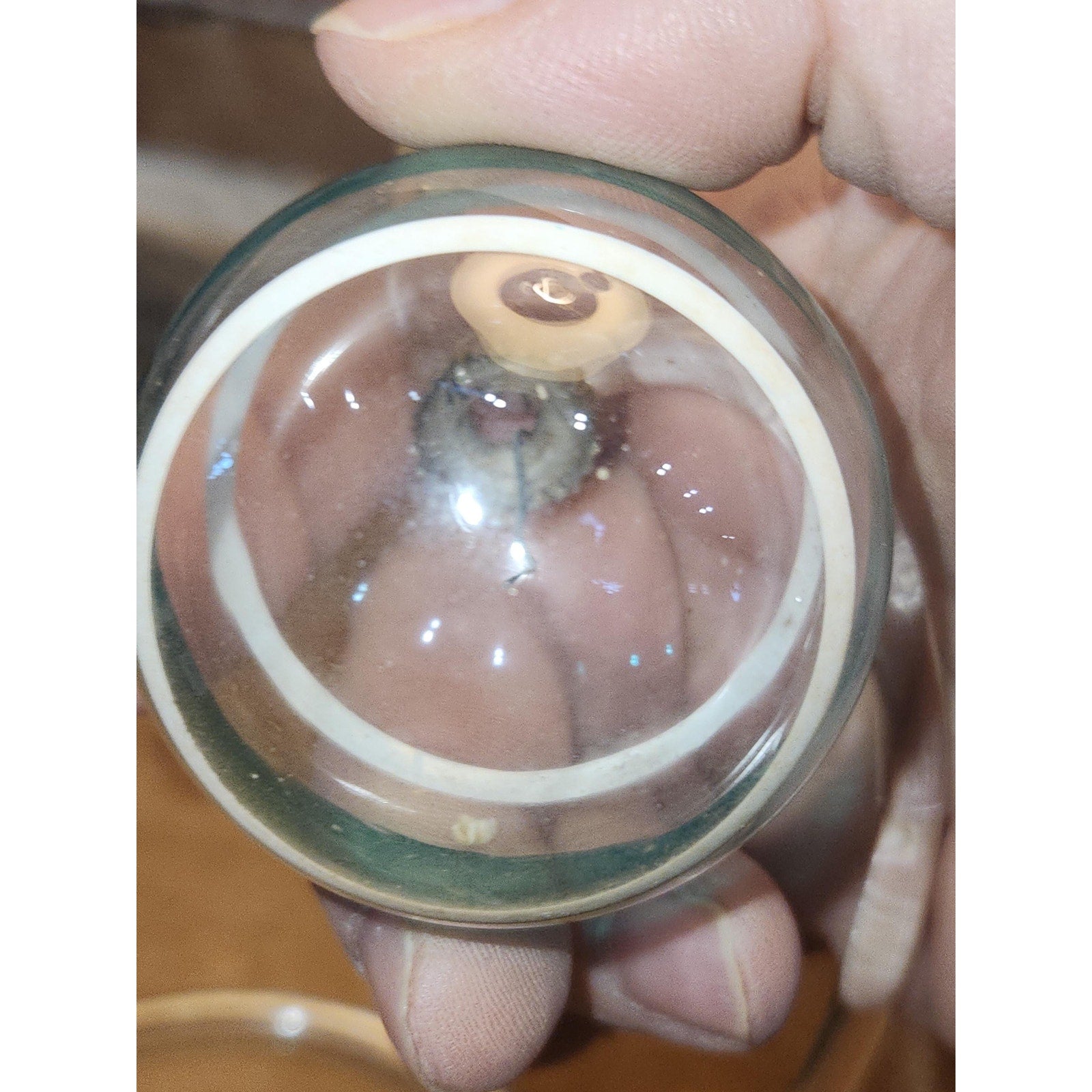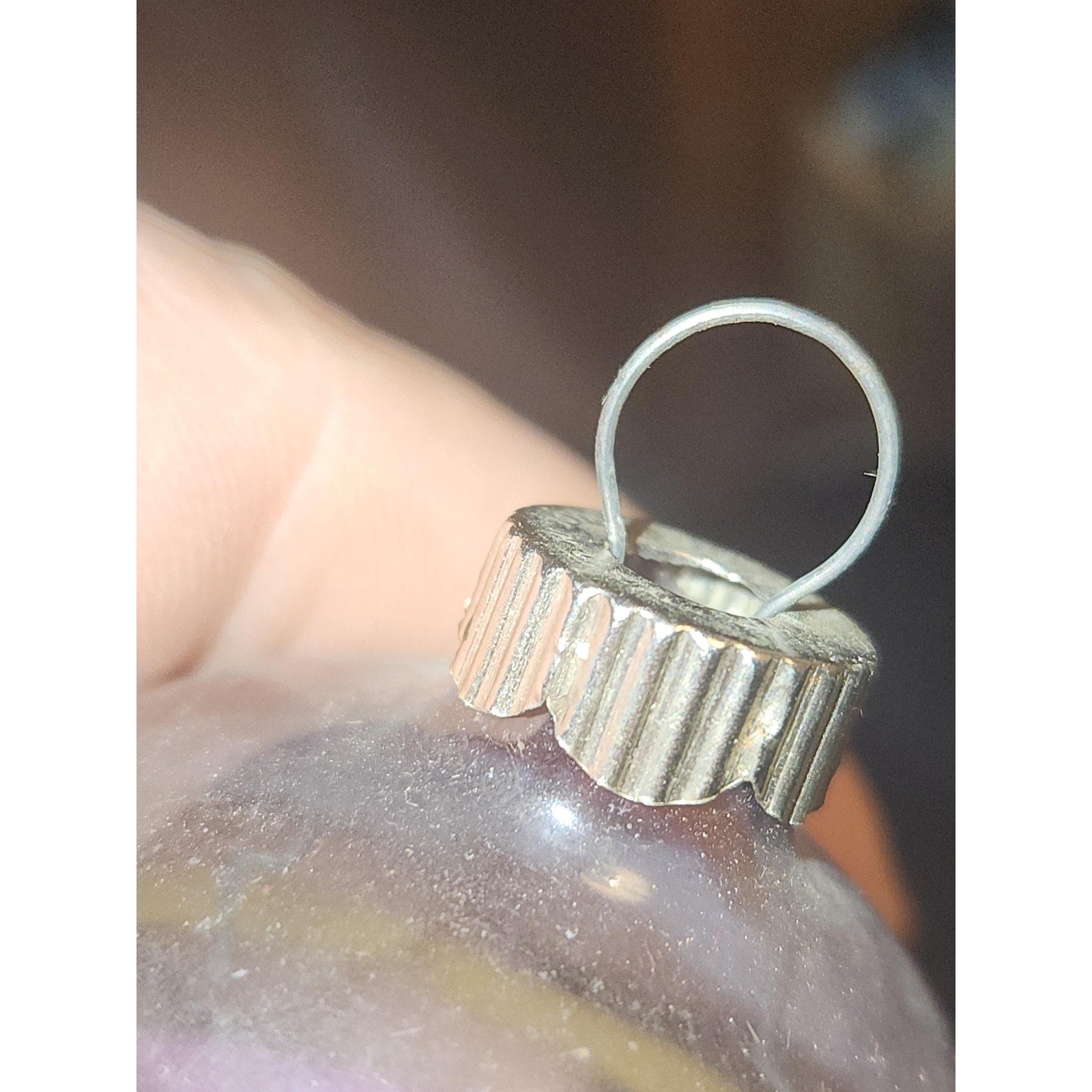 Set of 3 two inch unsilvered World War 2 Era ornaments. 1 clear, 1 with blue tint and stripes, 1 with blue tint, stripes and dots. There are area of paint loss on each. These are being sold the way I purchased from an estate sale. I give no gurantees that the cap matches the ornament, the caps say Shiny Brite Made in USA. but honestly caps can be changed. PLEASE READ BEFORE PURCHASE, buying vintage glass ornaments means you may get ornaments with crazing, paint loss, tiny chips at the mouth, and fading; we will never send a broken ornament or one with lots of damage. Please look at photos closely, so you know what you are purchasing.