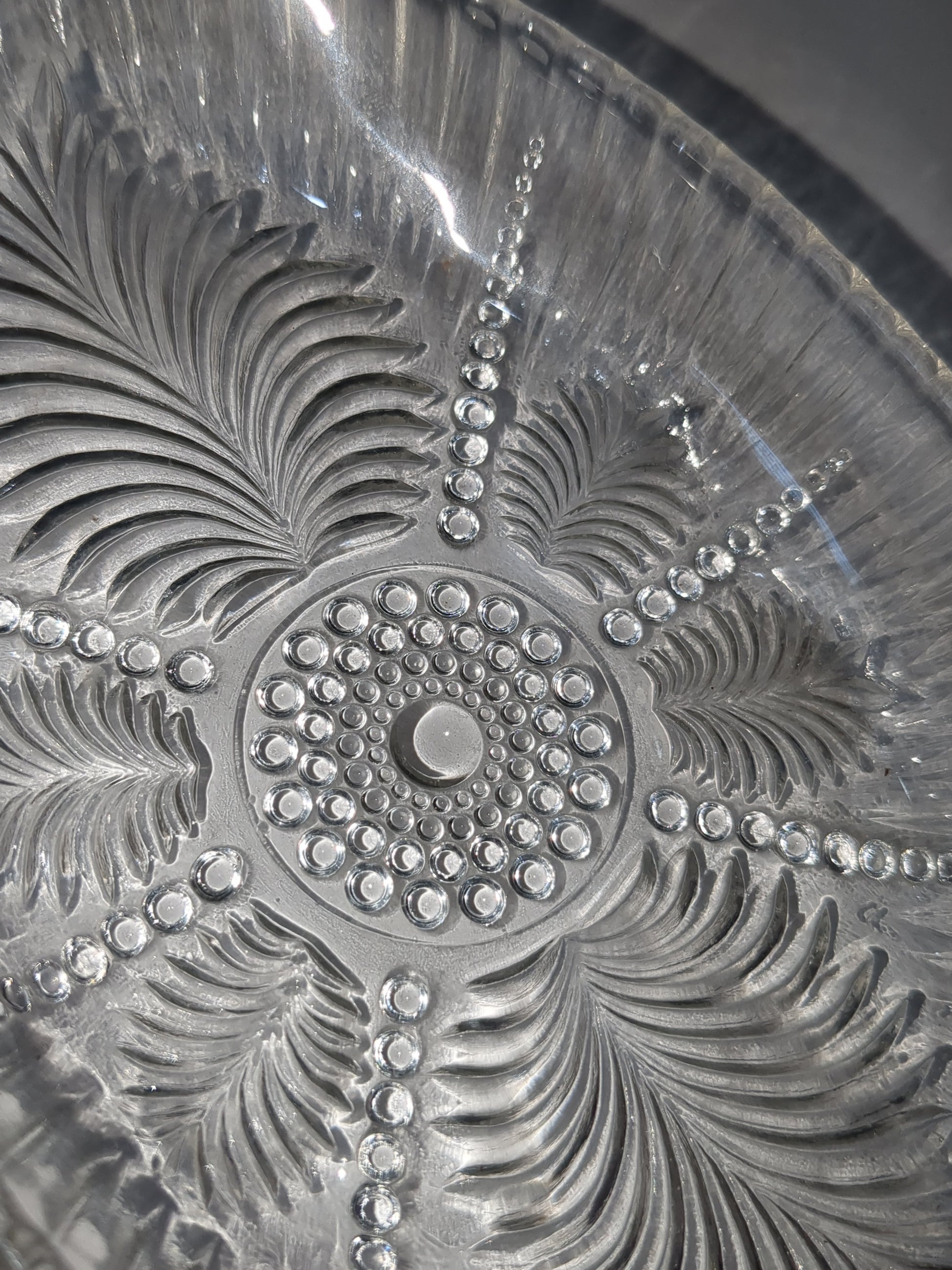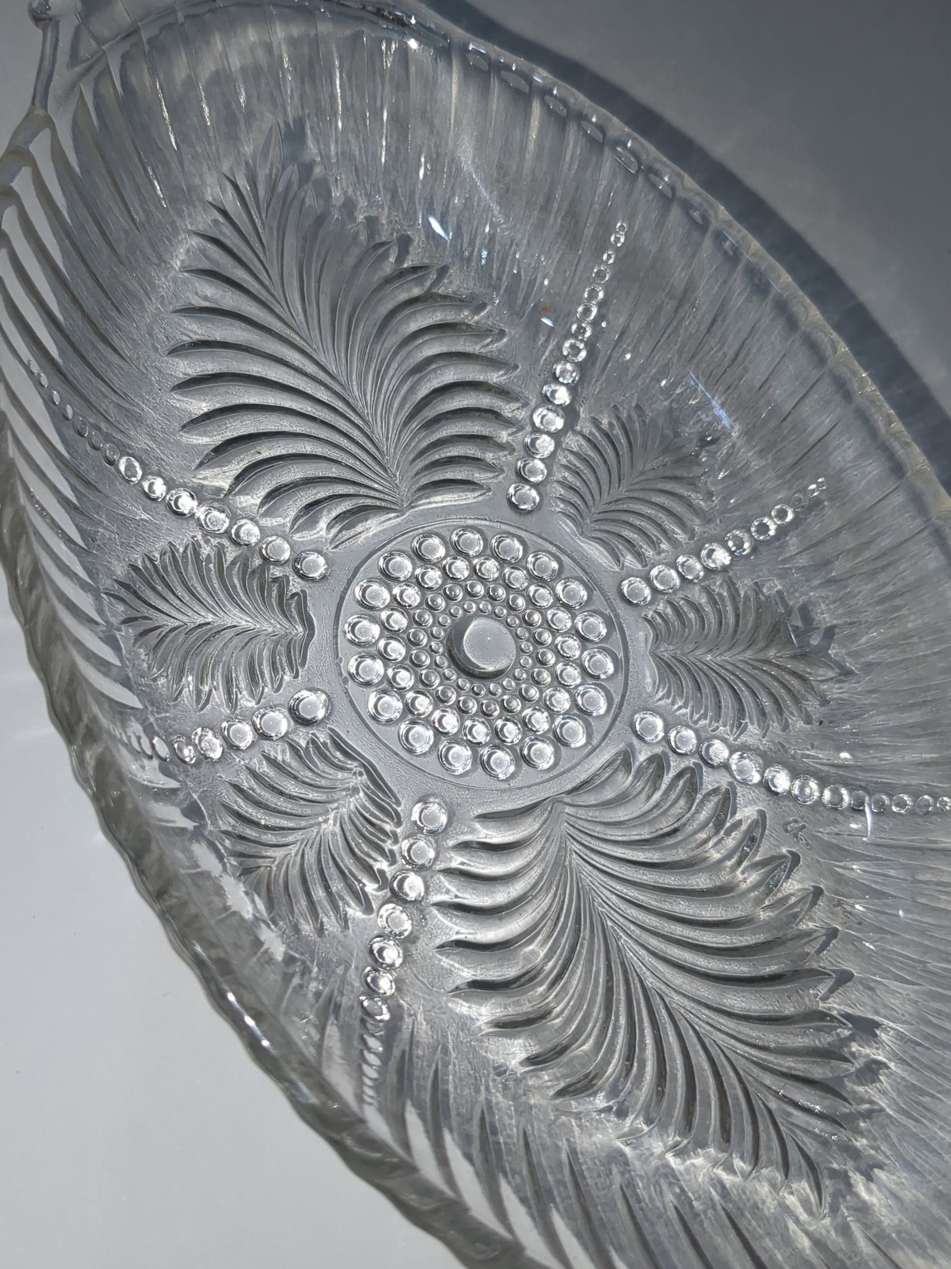 This unique piece is an original from the 1940s with production techniques of pressed, cut, and fused glass. The American-themed dish has a production line called Feather and Pearl, and it can be used as a relish dish, trinket dish or even a soap dish. It is a perfect addition to any decorative cookware, dinnerware, or serveware collection.There are no chips, cracks or rough edges. This dish measures 8 1/4” x 4 1/4” and is 1 1/4” tall.