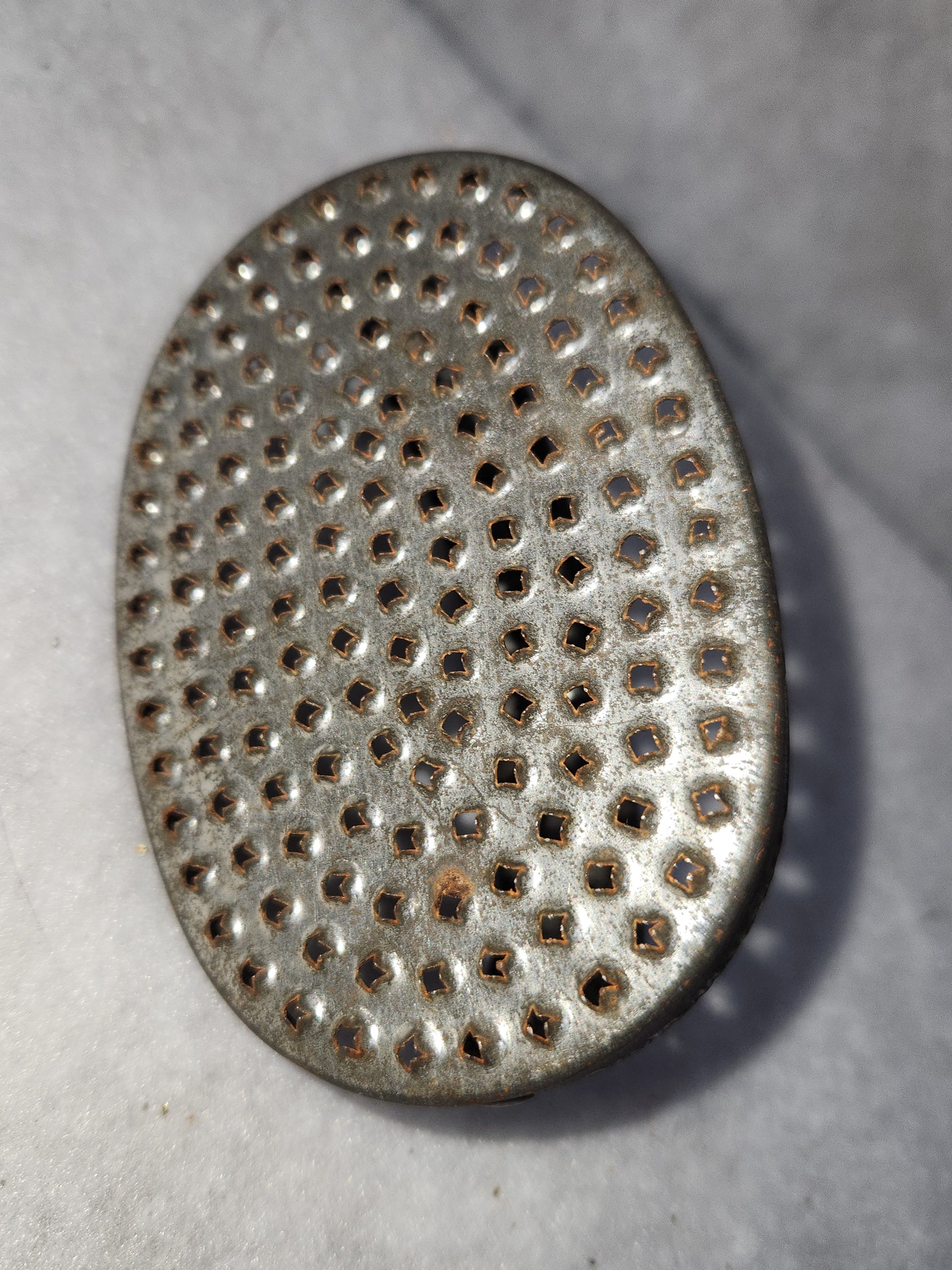 This is a great simple and primitave hand held grater. It has patina and a bit of rust. I see no makers mark. It is 4 1/4" long 3" wide. Please see photos as they are part of the description.