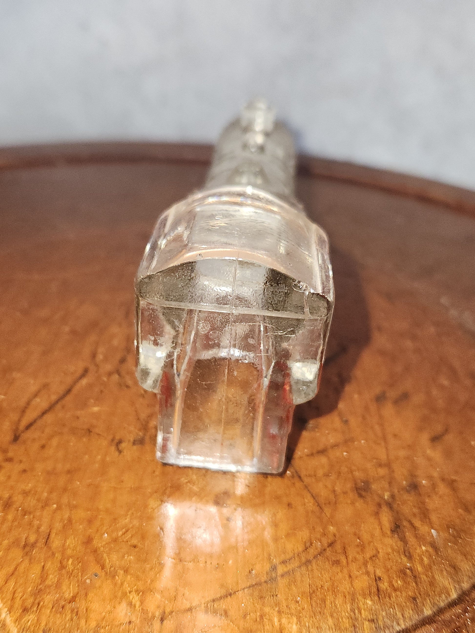 Vintage glass candy container. 4 3/4" long 1 3/4" tall. It is in good condition with the exception of a broken off wheel and paint loss on the wheels. Please see photos as they are part of the description.