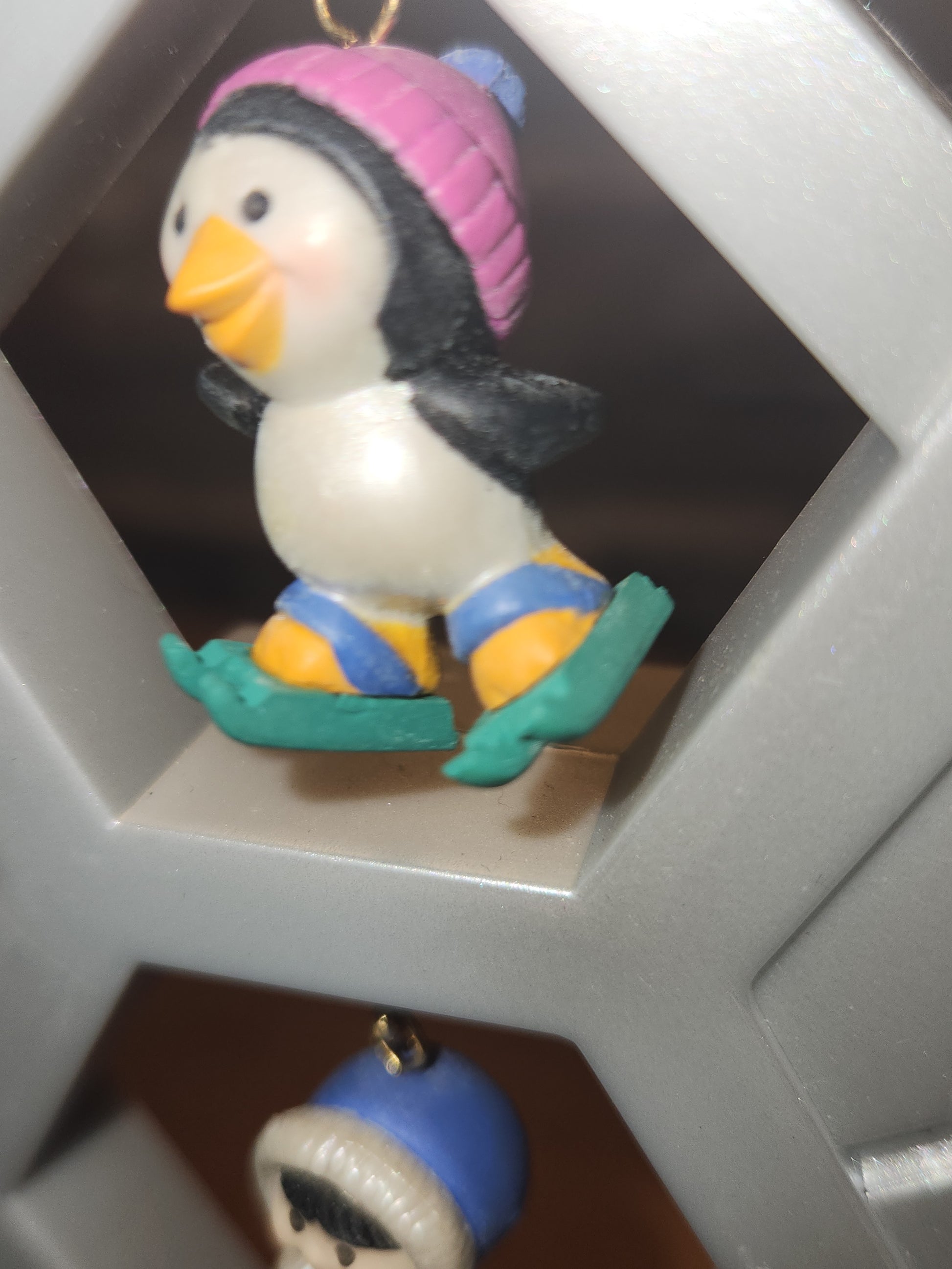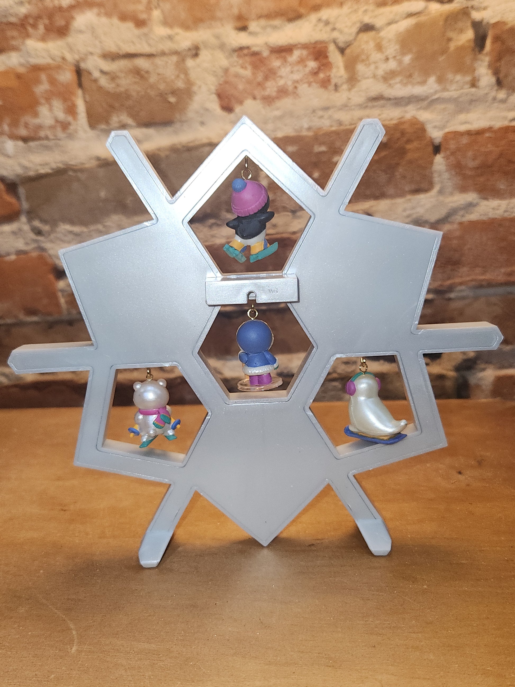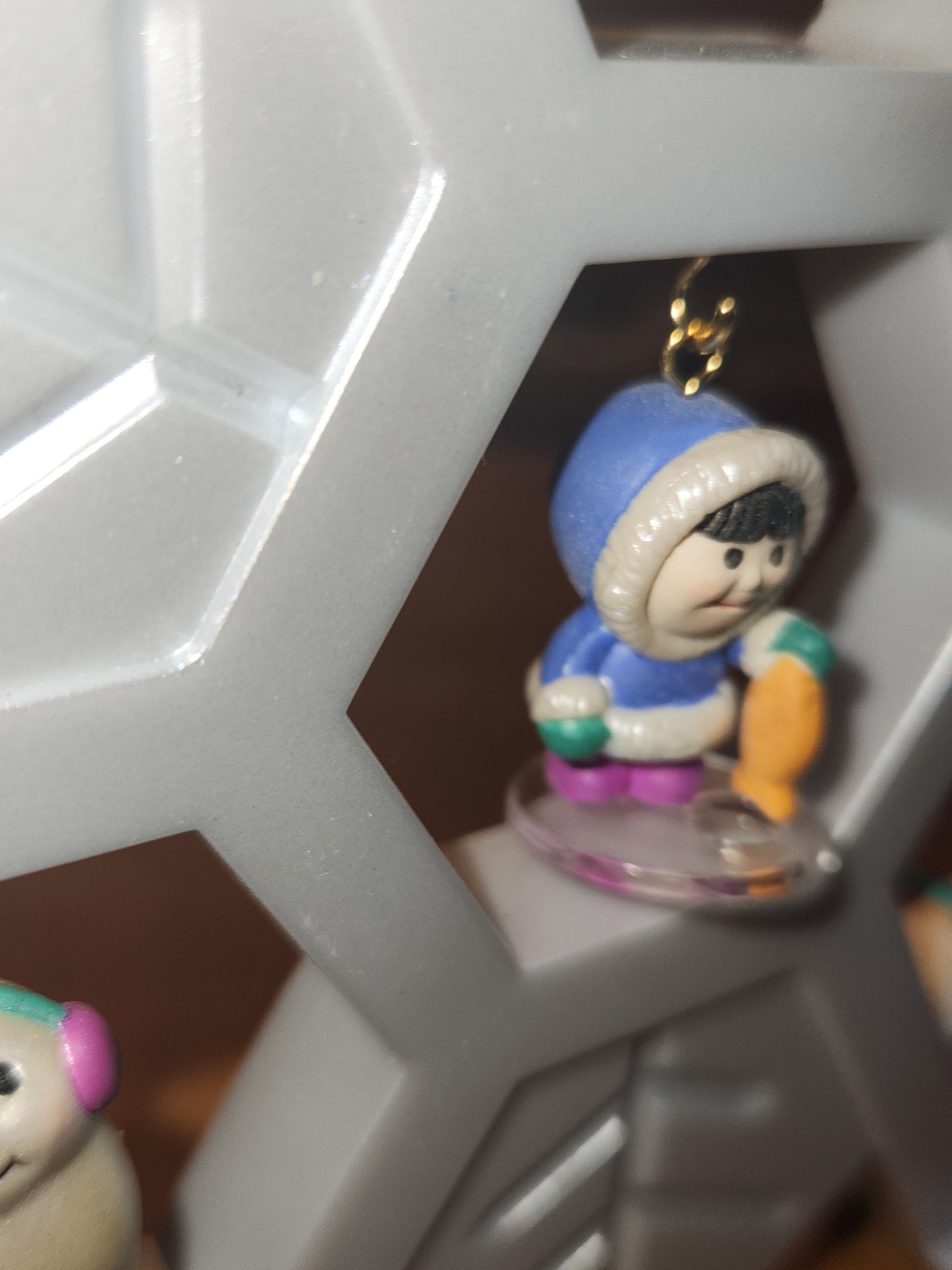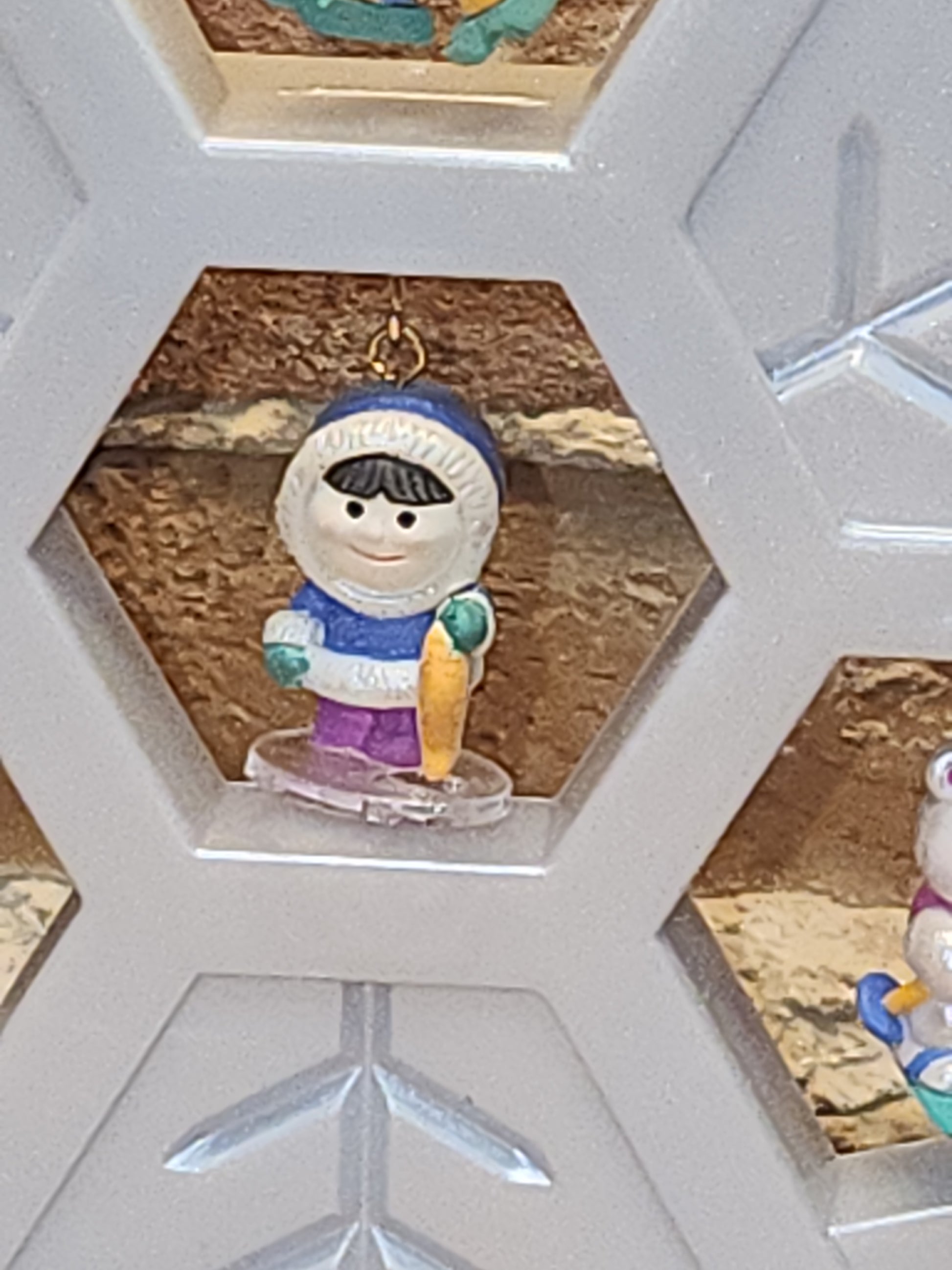 This Wee Winter Snowglake stand is in good condition. I see no chips, cracks, scratches or missing parts. All ornaments are in like new condition. The ornaments have boxes. The Eskimo box looks as if it was crushed a bit and has some deep creases. The polar bear box has a crease in the lid. The other boxes look to be in good condition. Please see photos as they are part of the description.
