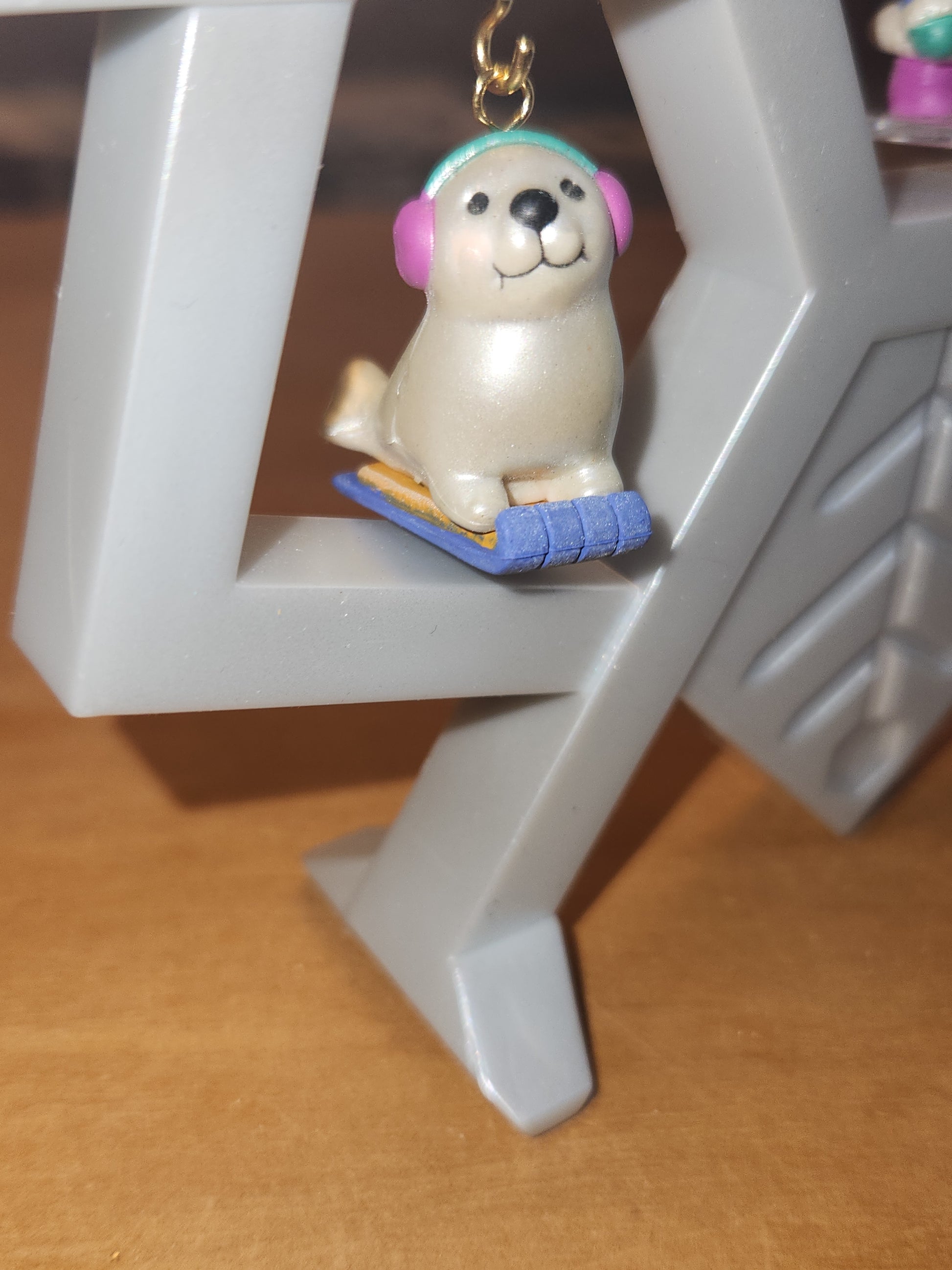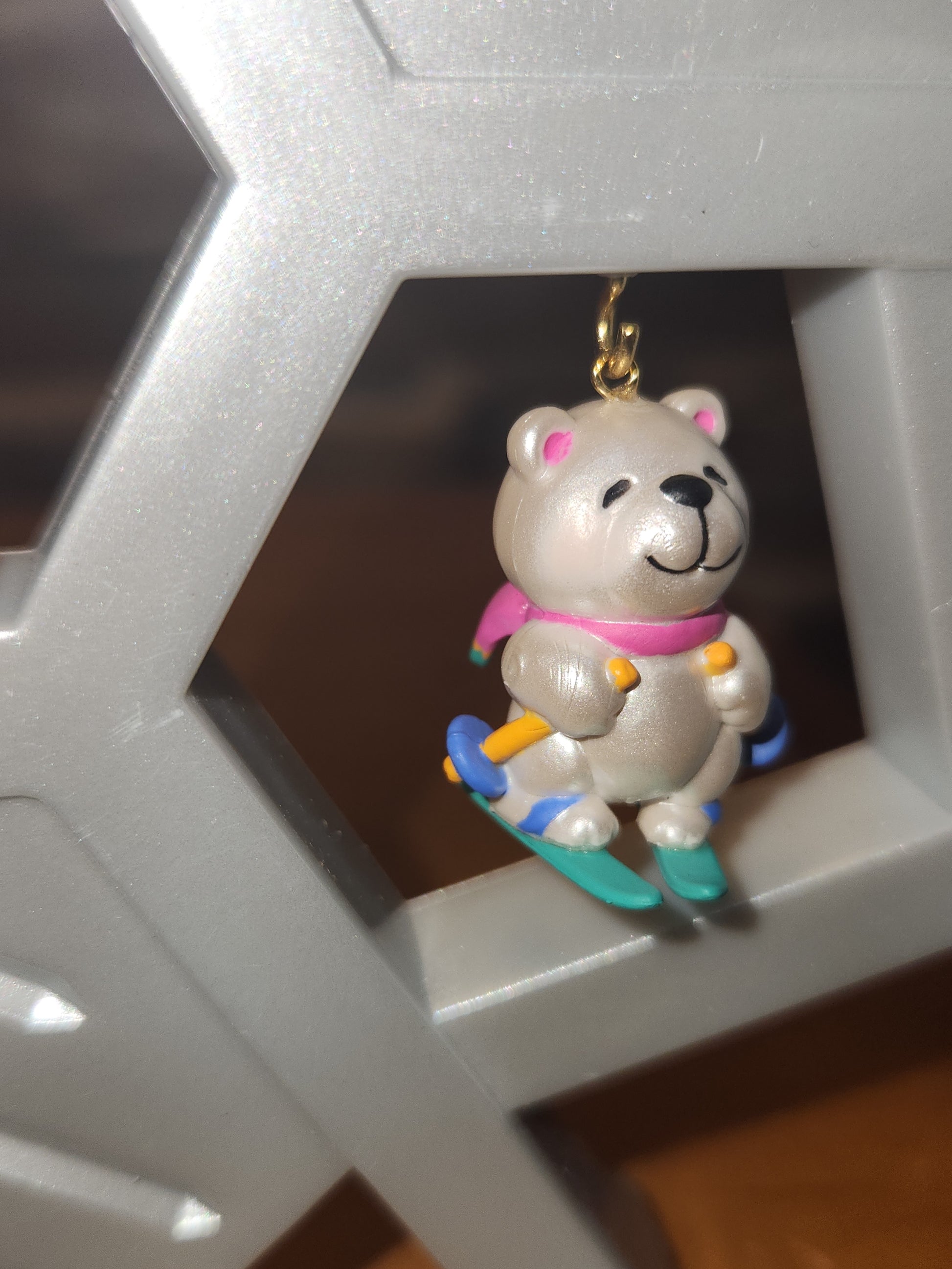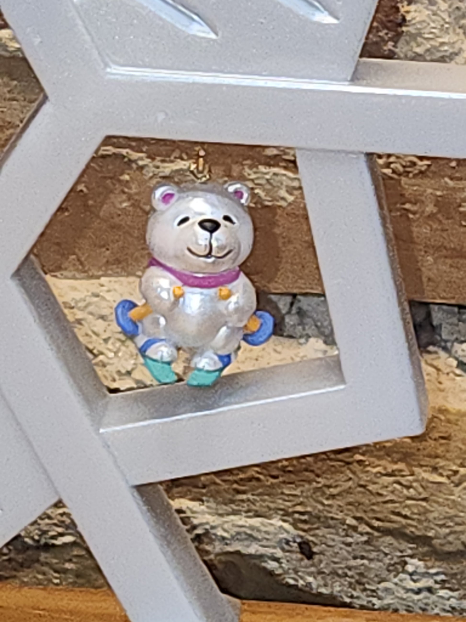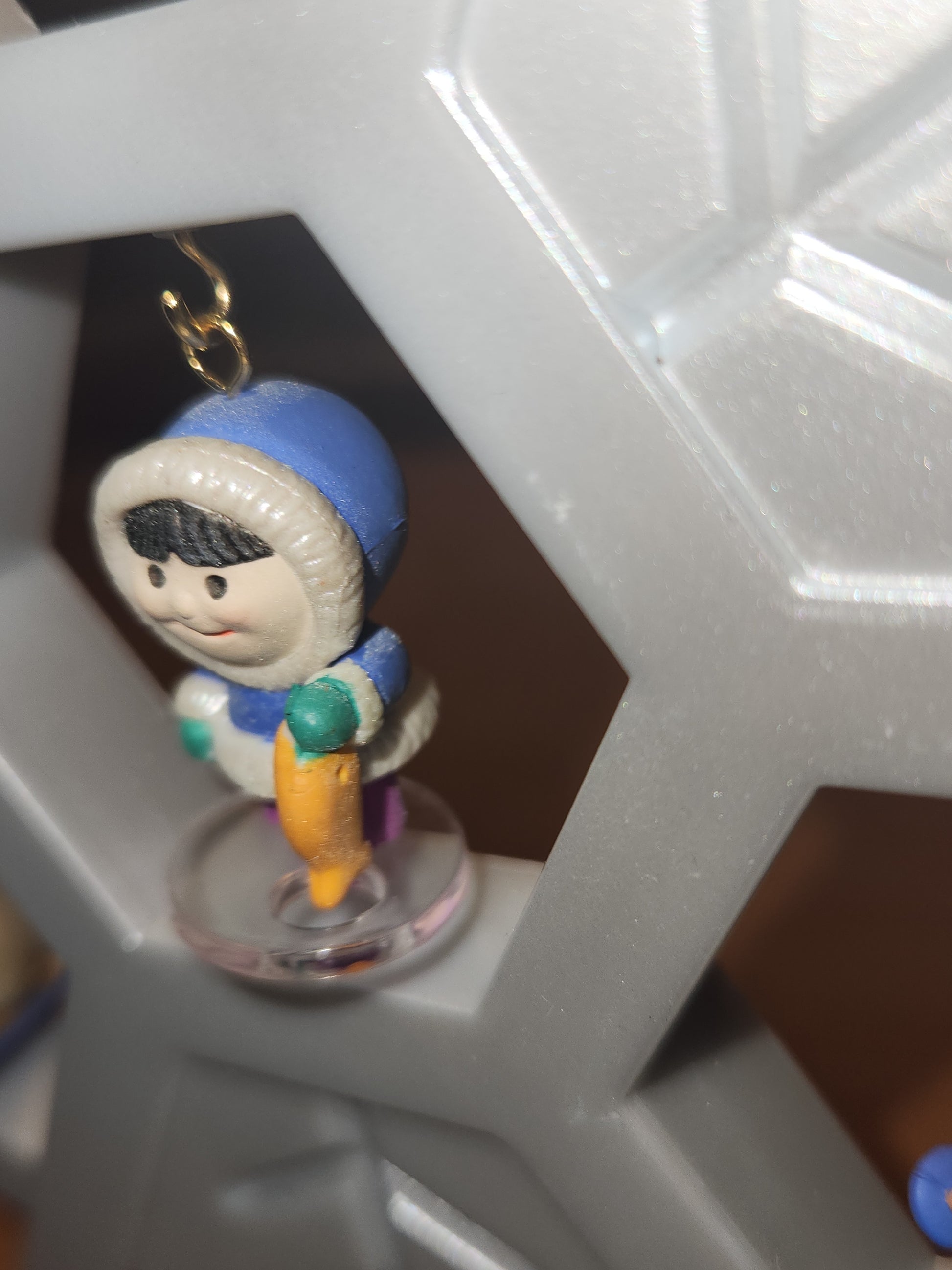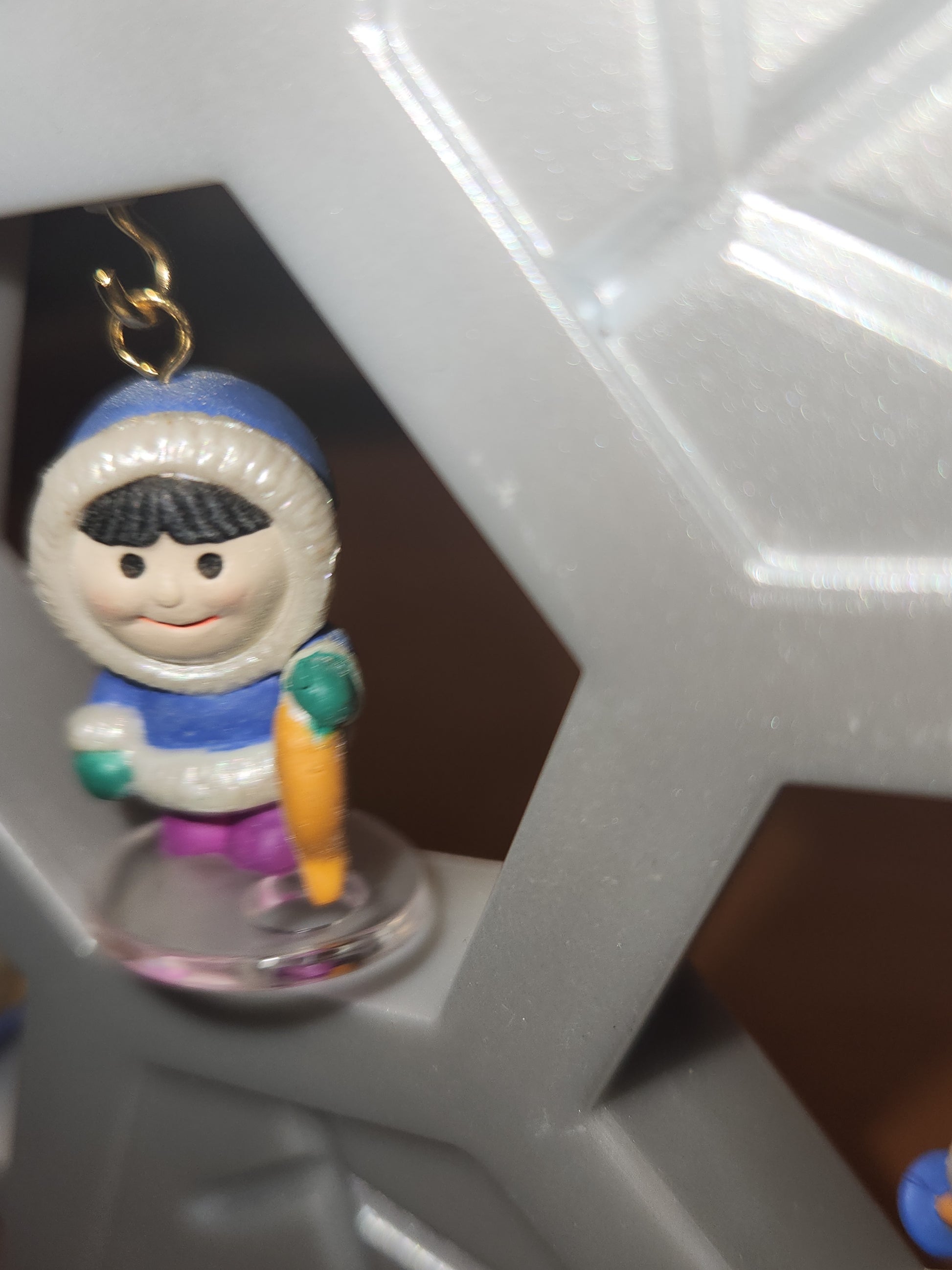 This Wee Winter Snowglake stand is in good condition. I see no chips, cracks, scratches or missing parts. All ornaments are in like new condition. The ornaments have boxes. The Eskimo box looks as if it was crushed a bit and has some deep creases. The polar bear box has a crease in the lid. The other boxes look to be in good condition. Please see photos as they are part of the description.