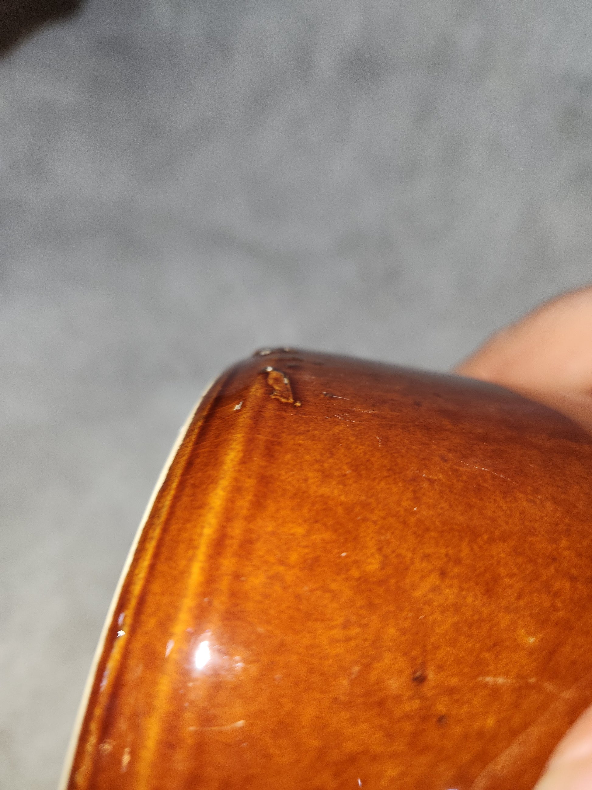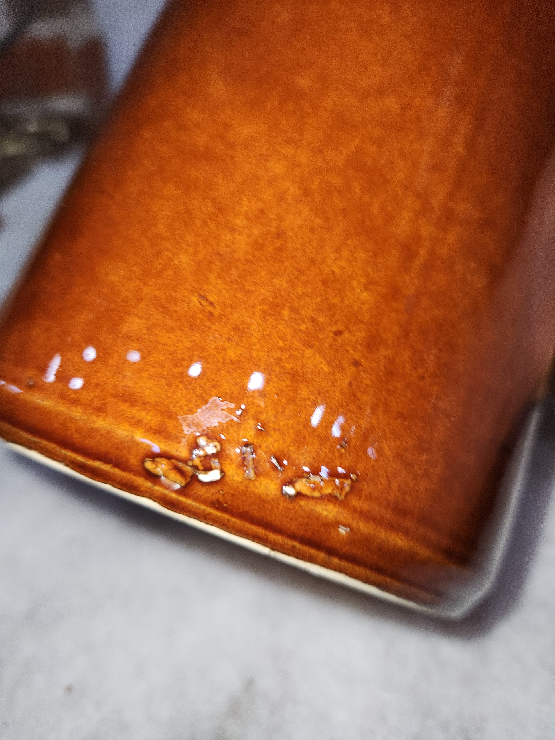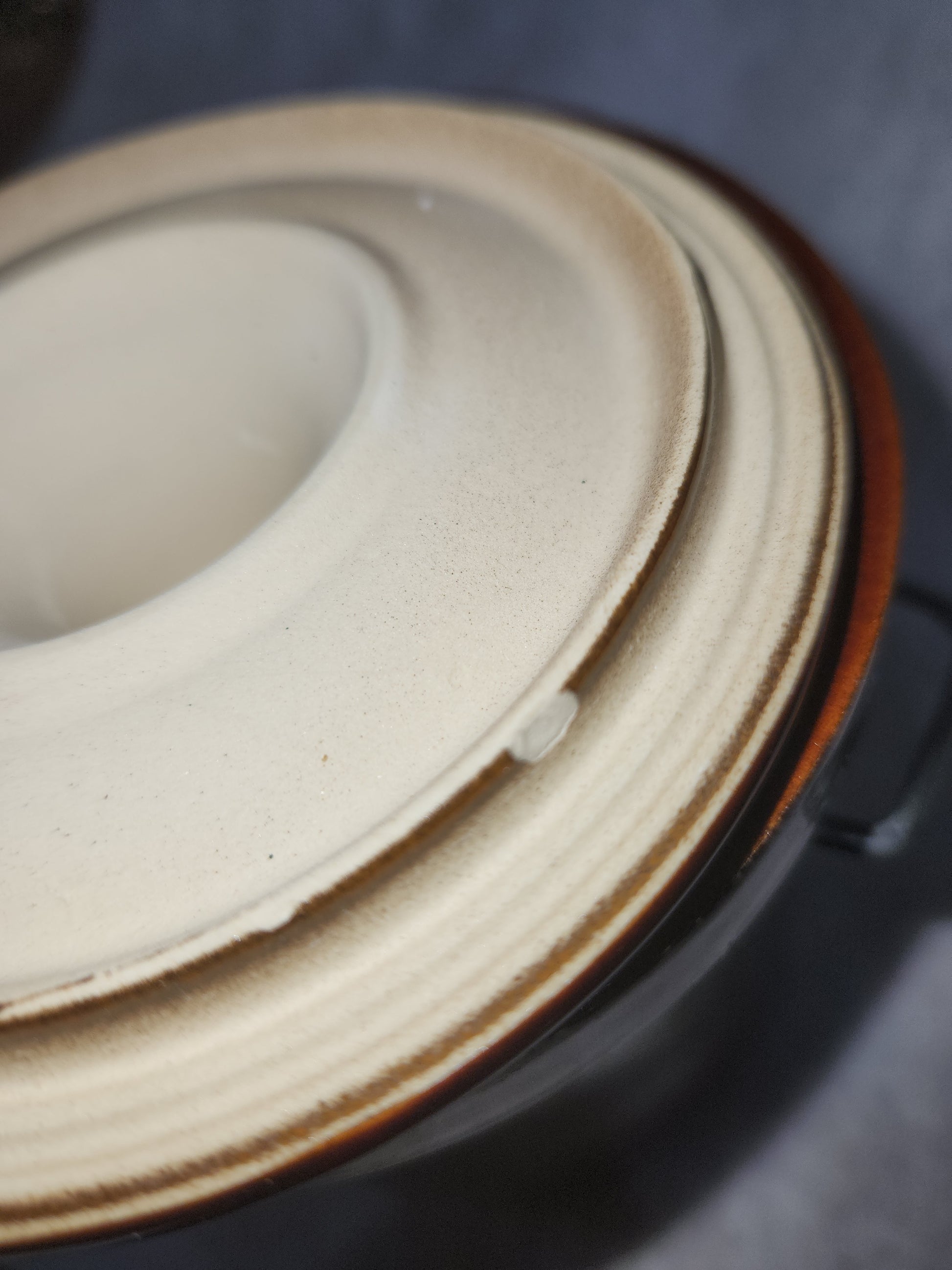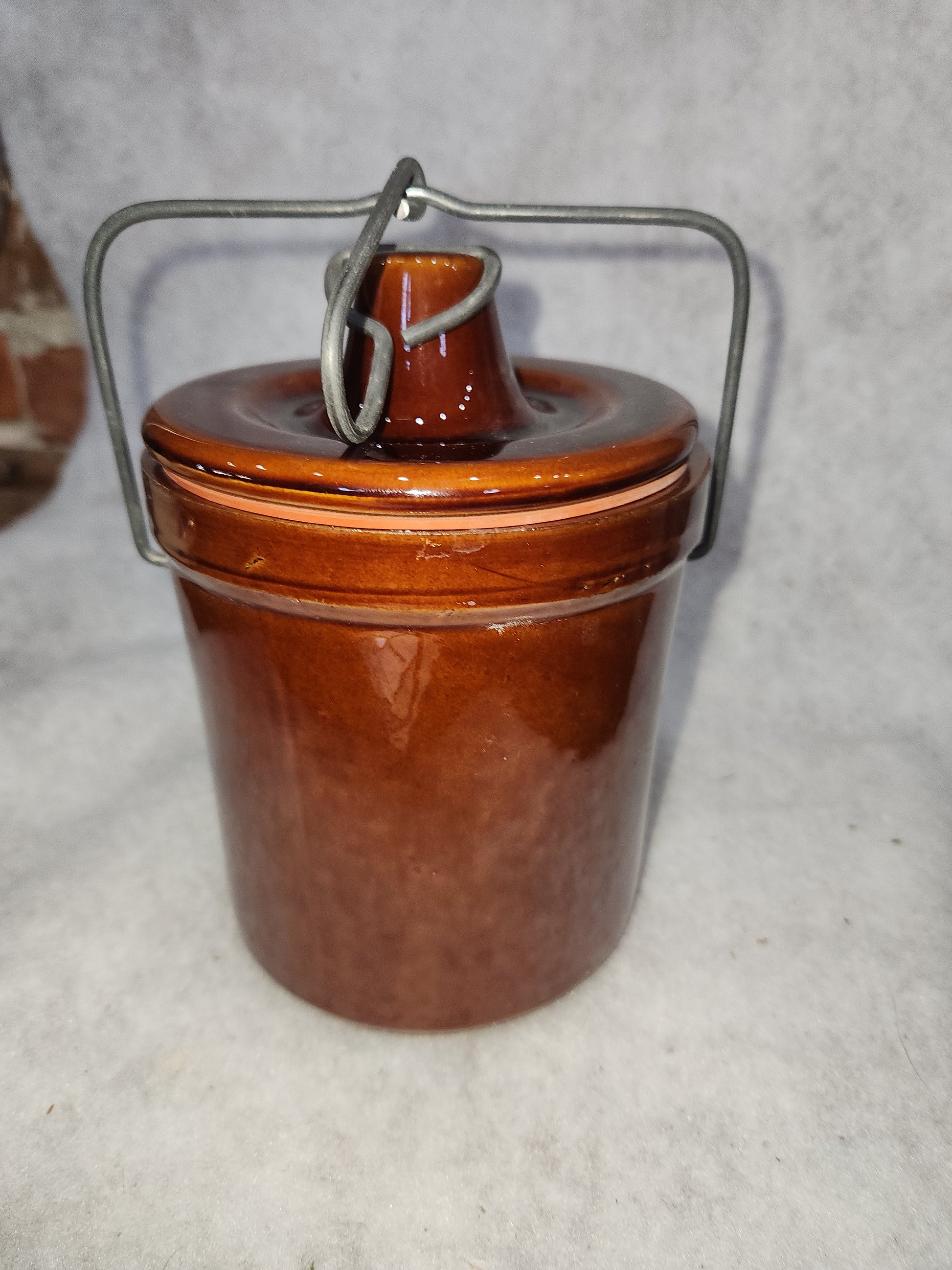 This crock is in good condition. I see no cracks it has two small chips in the lid inside rim. It has some spots that i believe were there during production, there is some raised spots near the bottom and a few indents in outside top rim. Metal bail works well. 7 1/4" to top of lid and 4 3/4" diameter. No maker's Mark seen. Please see photos as they are part of the description.