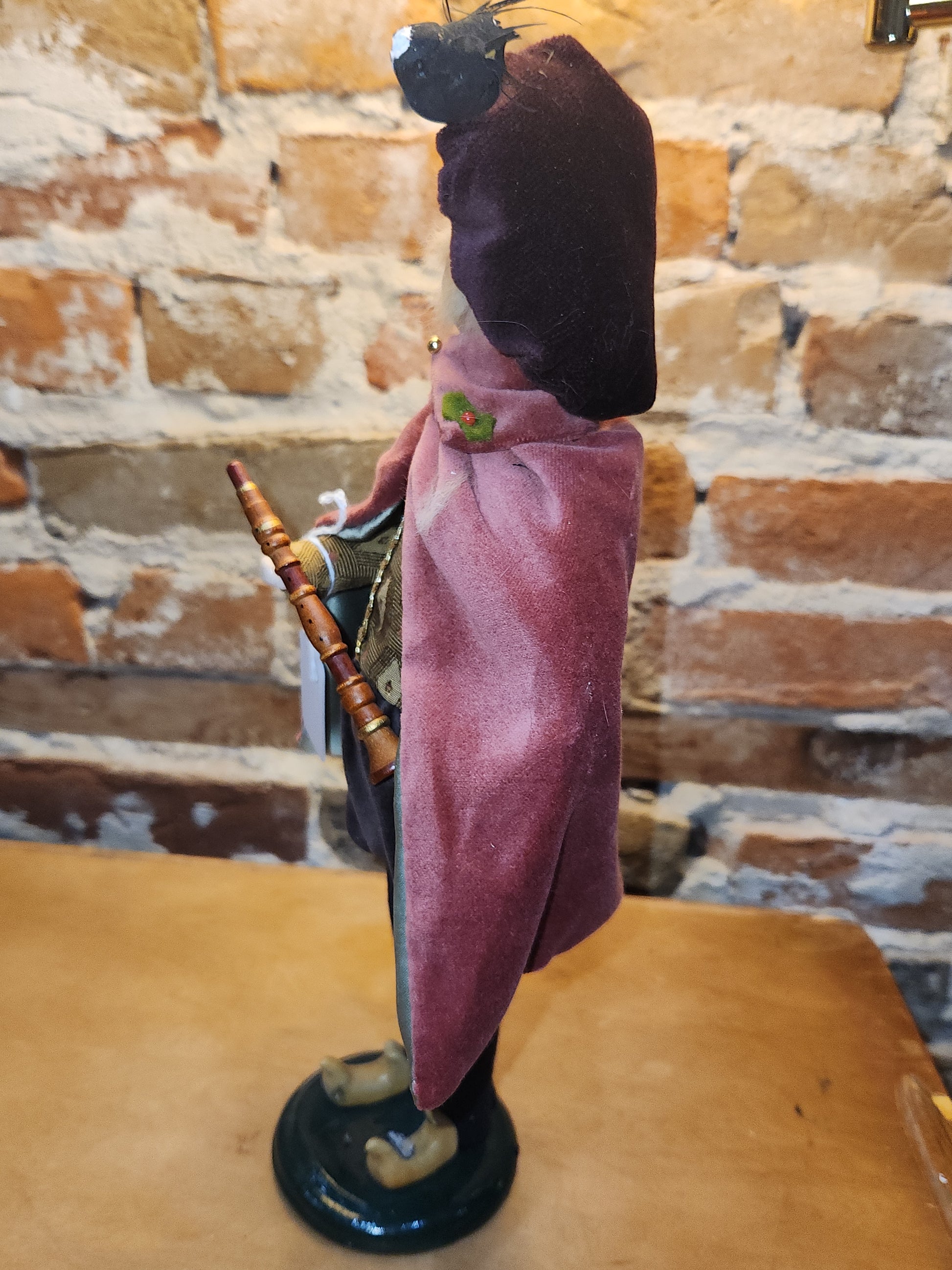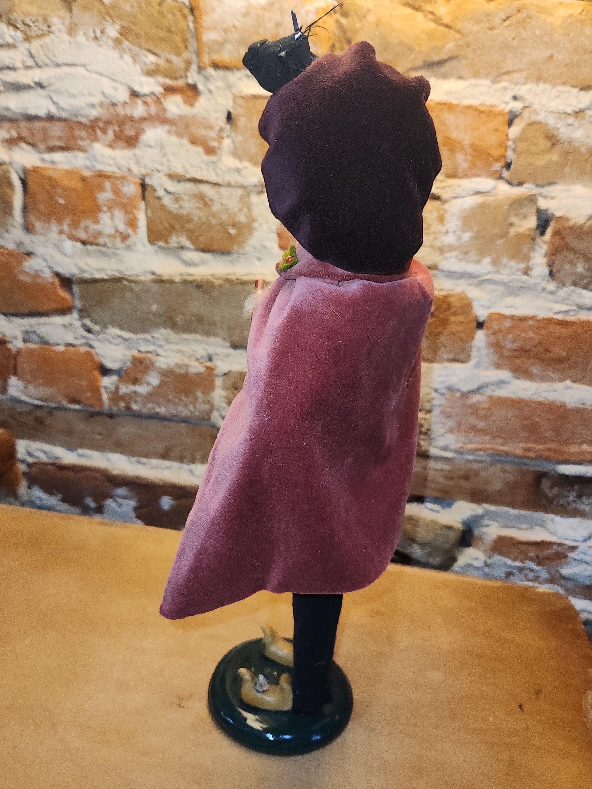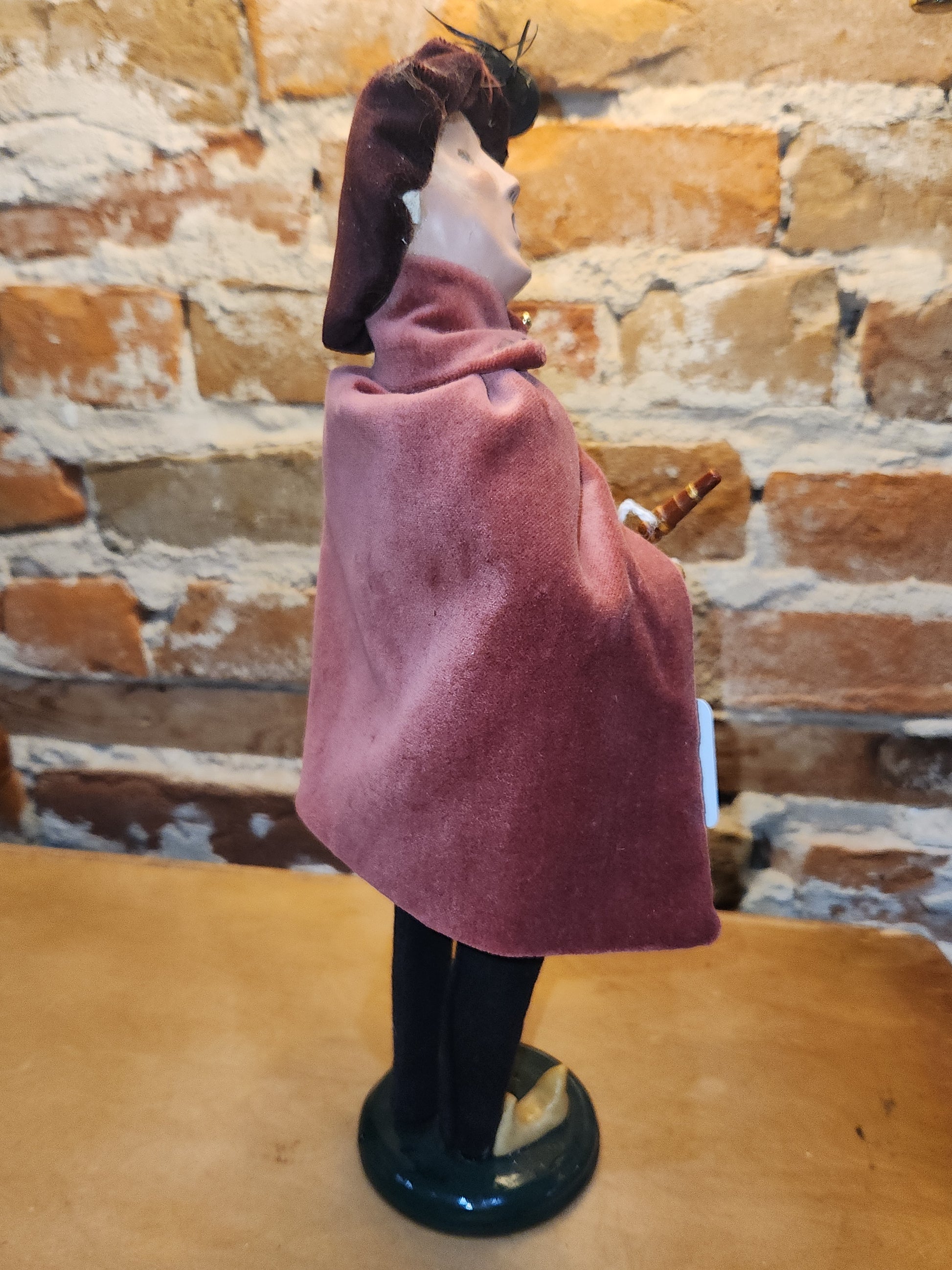 The caroler and her outfit is in good condition. There is one bird on her hat that is damaged, the other birds are missing. She is a bit over 13" tall. Please look at all photos as they are part of the description.