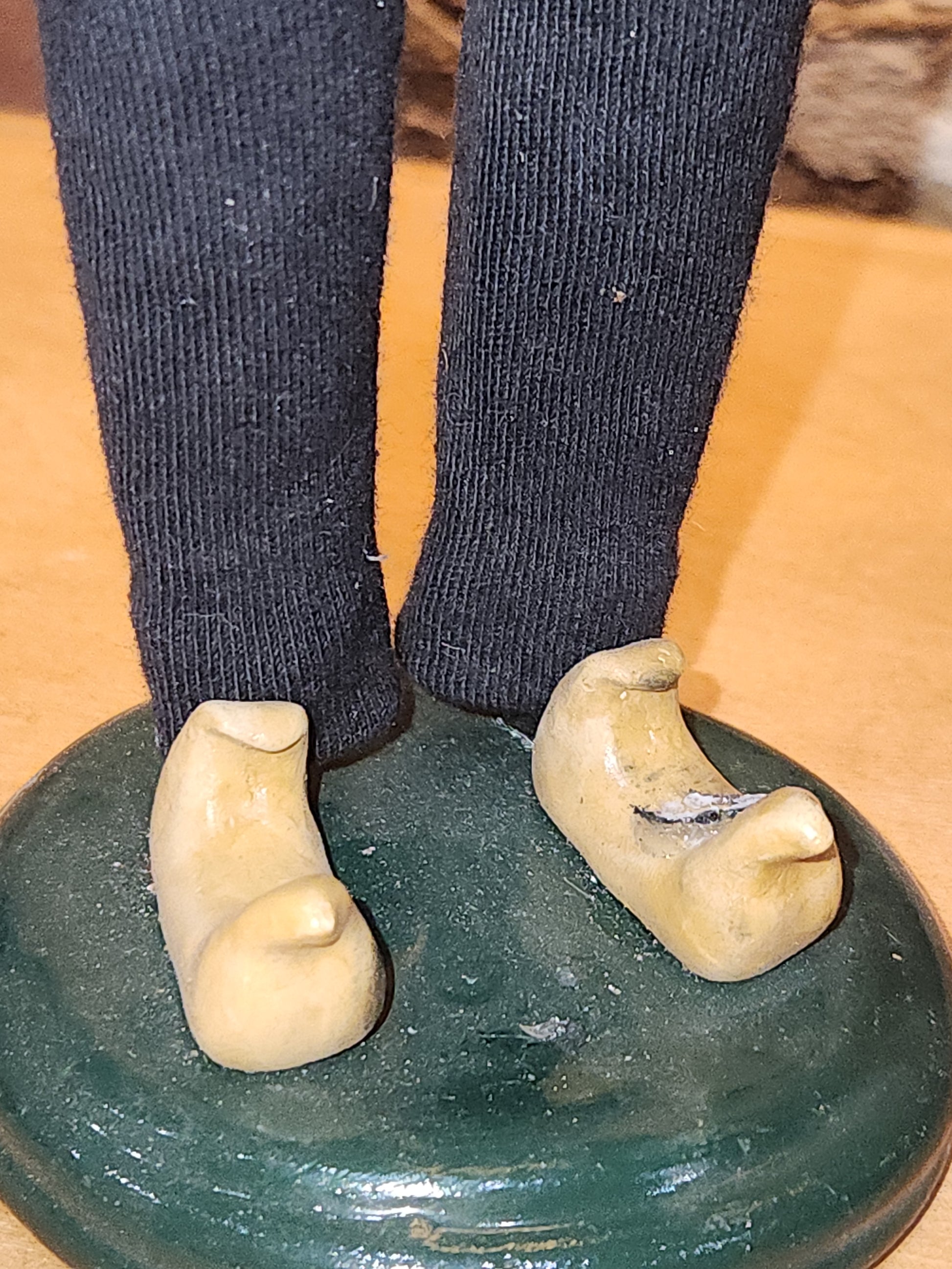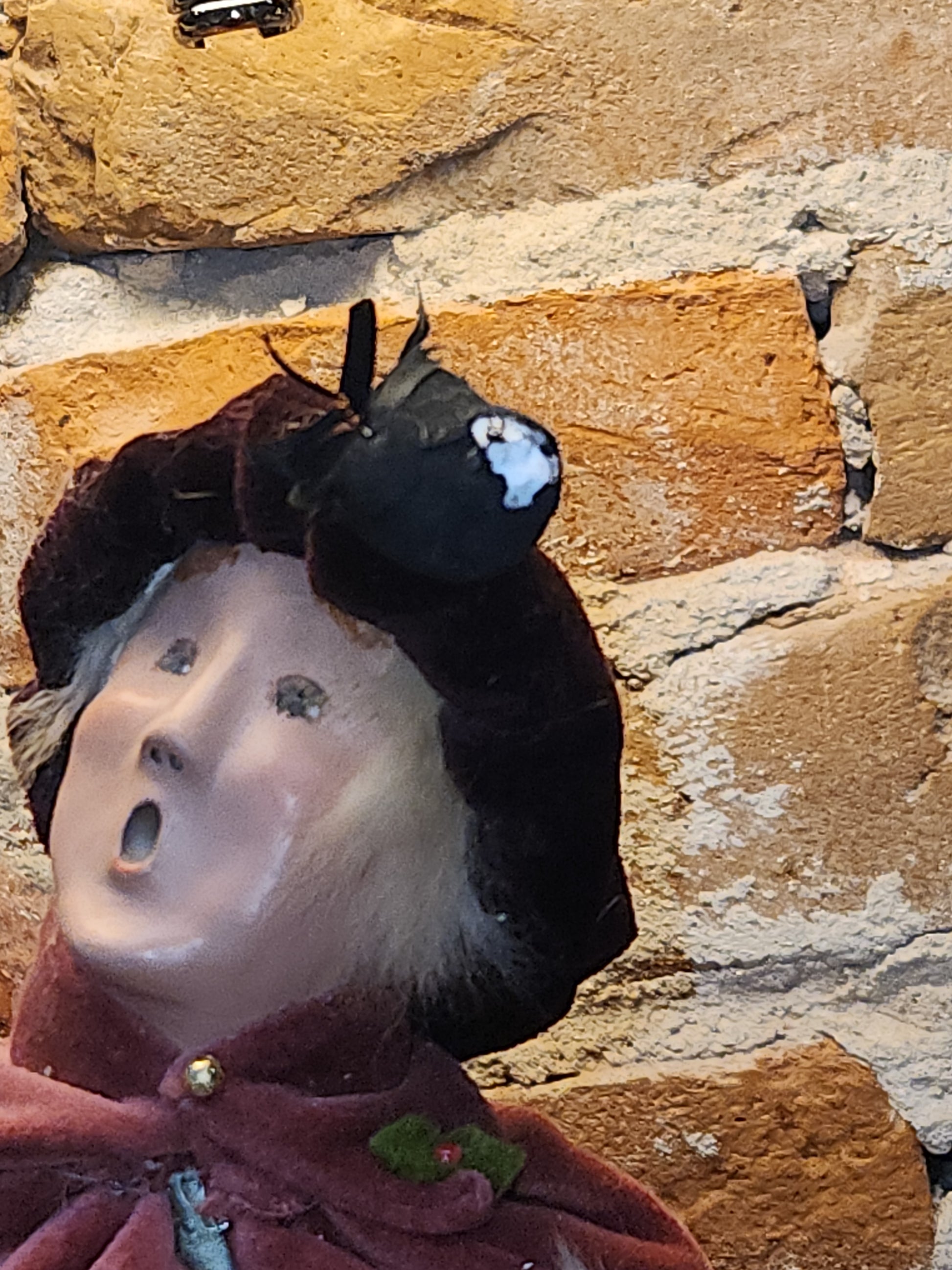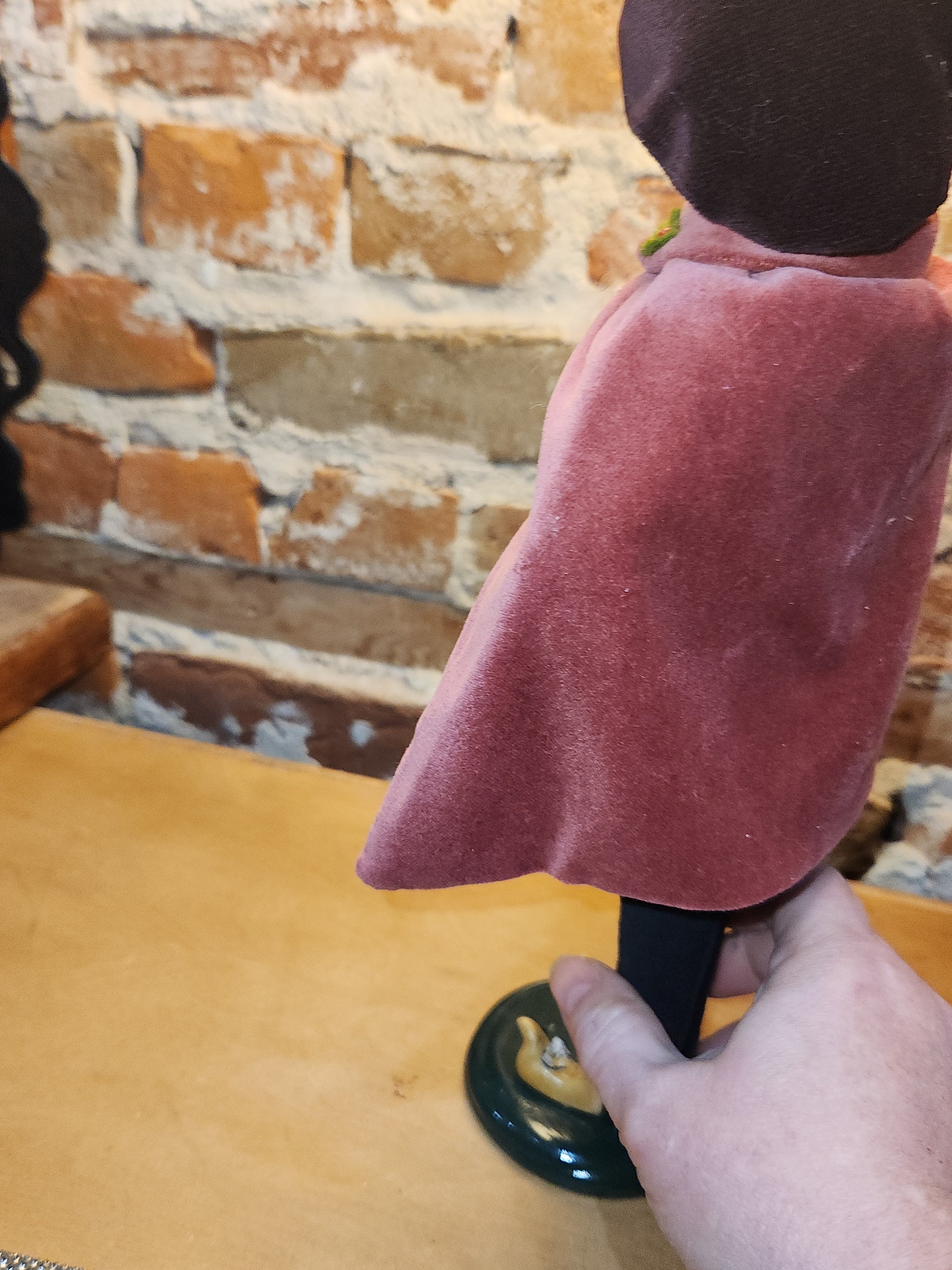 The caroler and her outfit is in good condition. There is one bird on her hat that is damaged, the other birds are missing. She is a bit over 13" tall. Please look at all photos as they are part of the description.