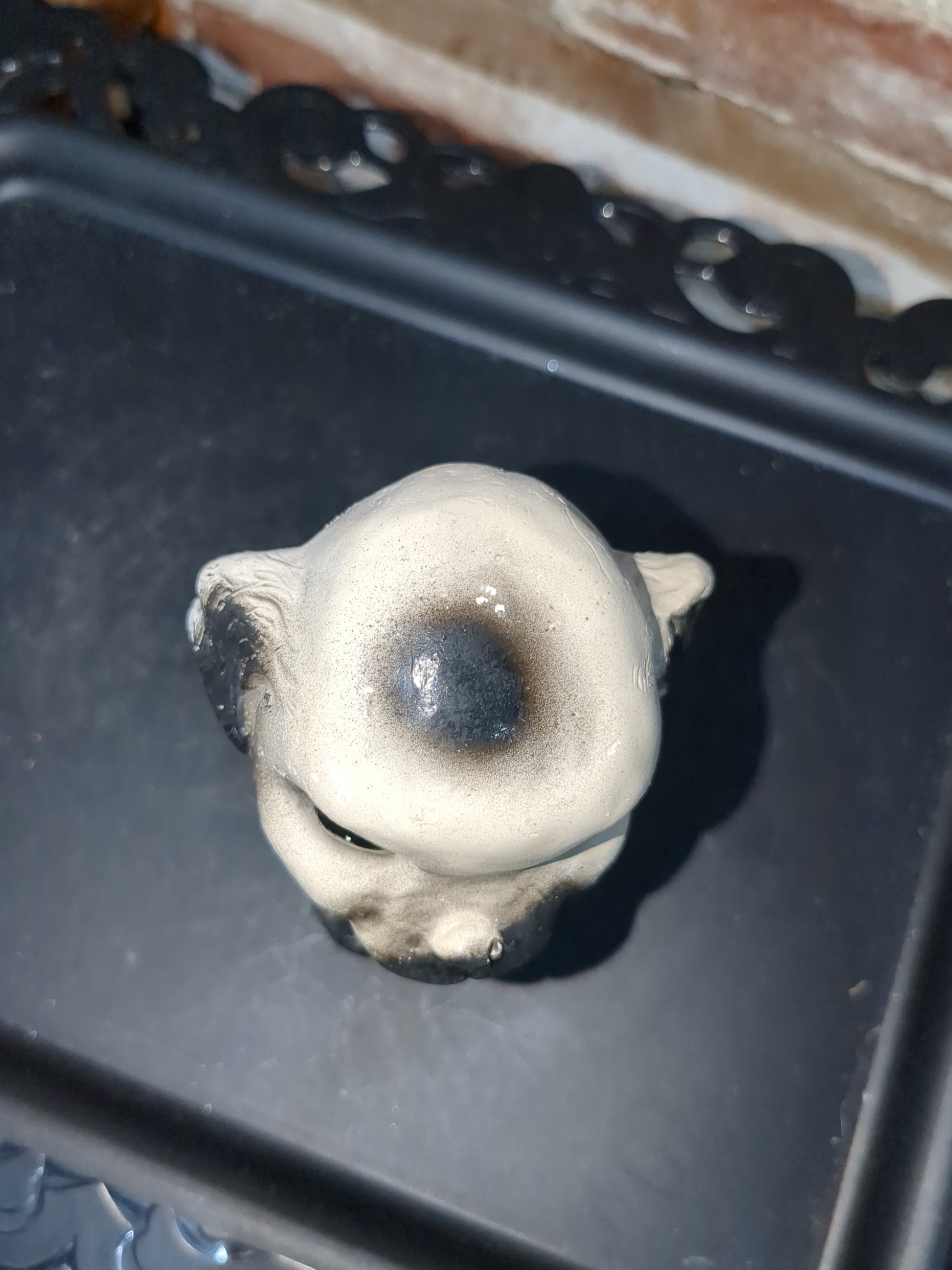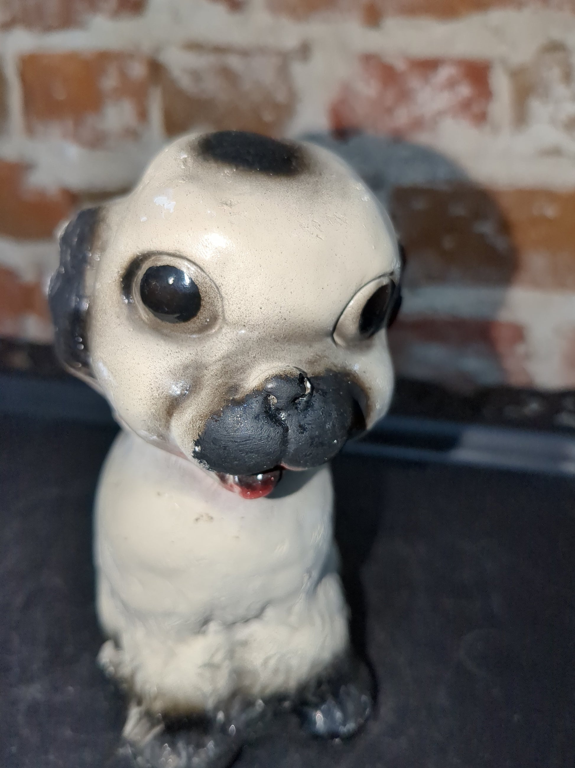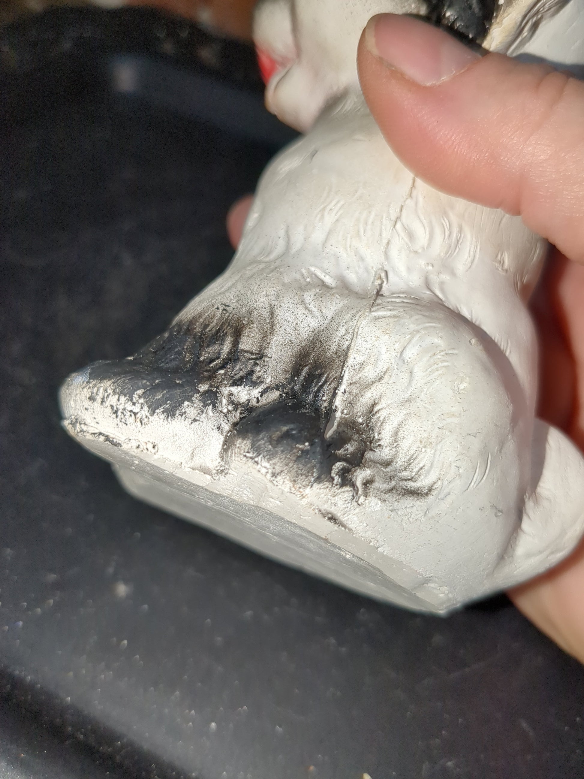 This is an old chalkware dog. There are no obvious chips. There is some paint loss, as to be expected on a piece with so many years. Please see photos as they are part of the description.