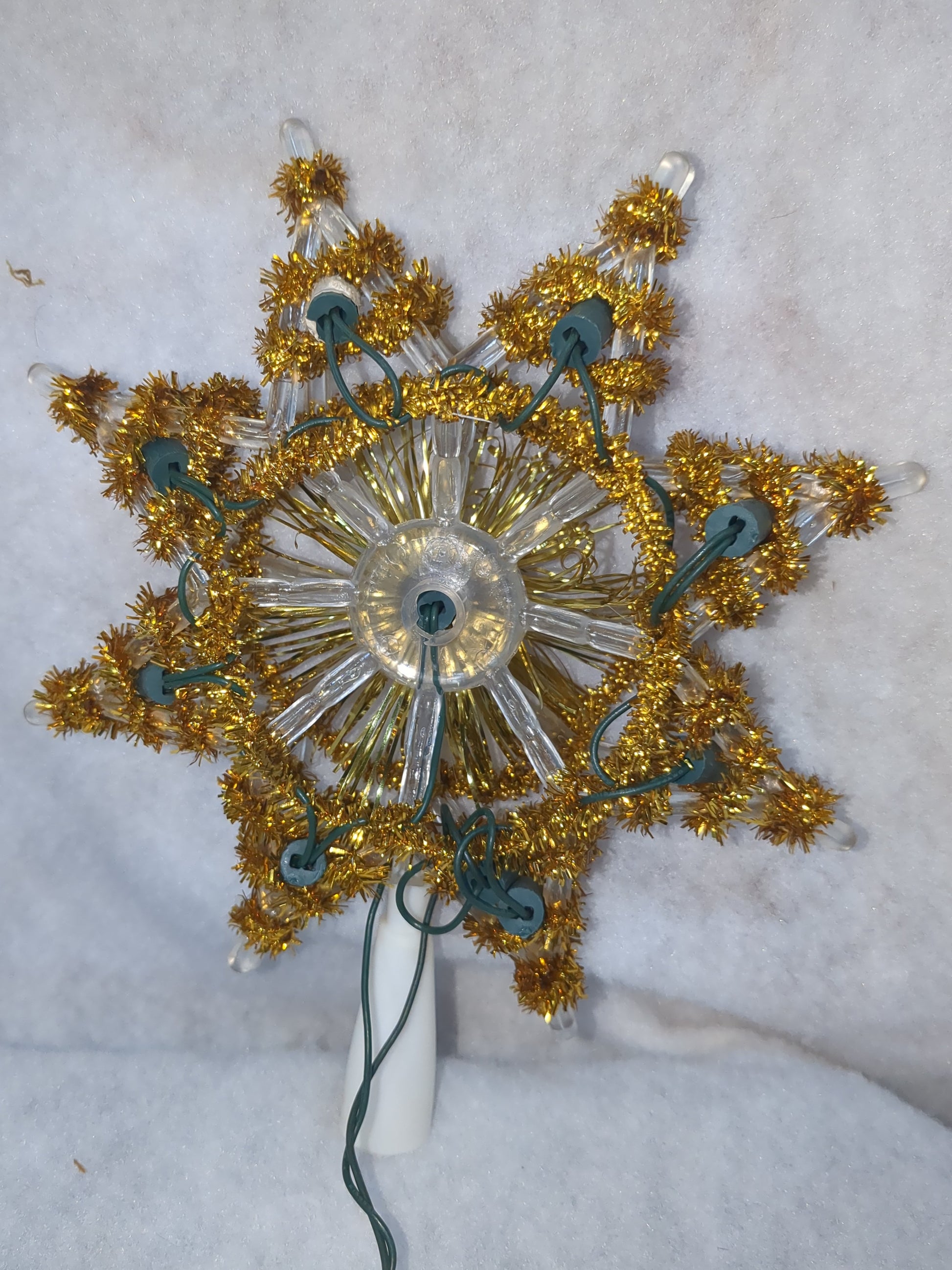 Vintage Christmas Tree Topper made by Santa Trim. The star is in great condition I don't see anything broken or wrong with it it plugs in and works great. It has the little bulb in there so you can turn it to flashing if you want it flashing it has its original box, but it has been taped, possibly has some water damage and the front clear film looks like a bulb popped through it. Please see photos as they are part of the description